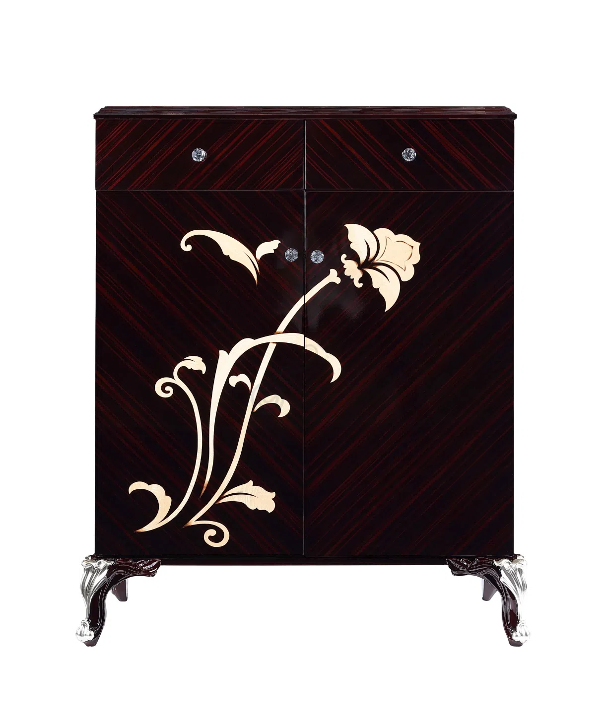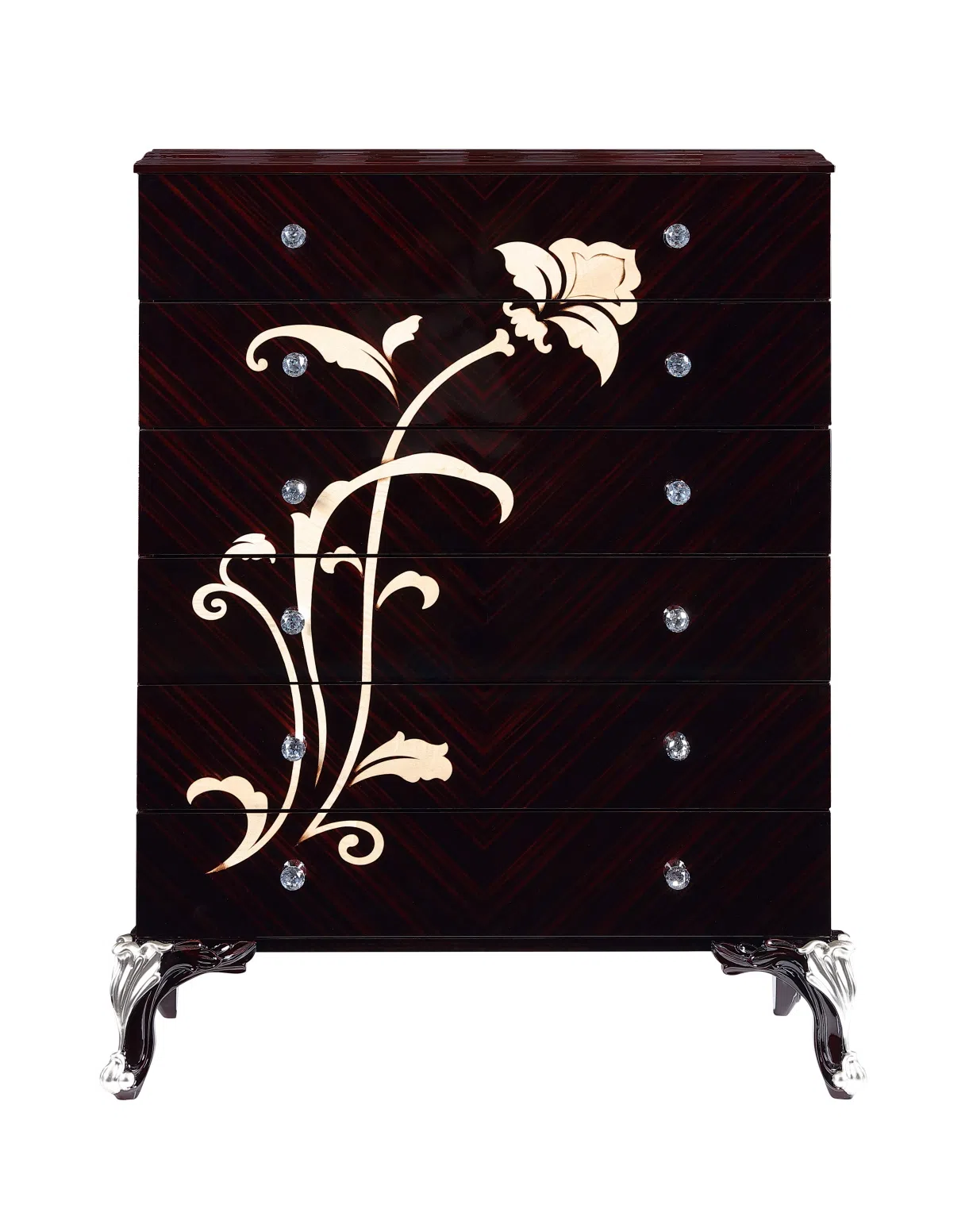 Фасад комода привлекает взгляд глубоким насыщенным оттенком и выразительным рисунком шпона, выложенным под углом. Особую элегантность придает декоративная инкрустация на одной из сторон – утонченный растительный орнамент с легким блеском, который гармонично сочетается с изящными ножками серебристого цвета. Небольшие ручки на выдвижных ящиках завершают образ, добавляя деликатное сияние.