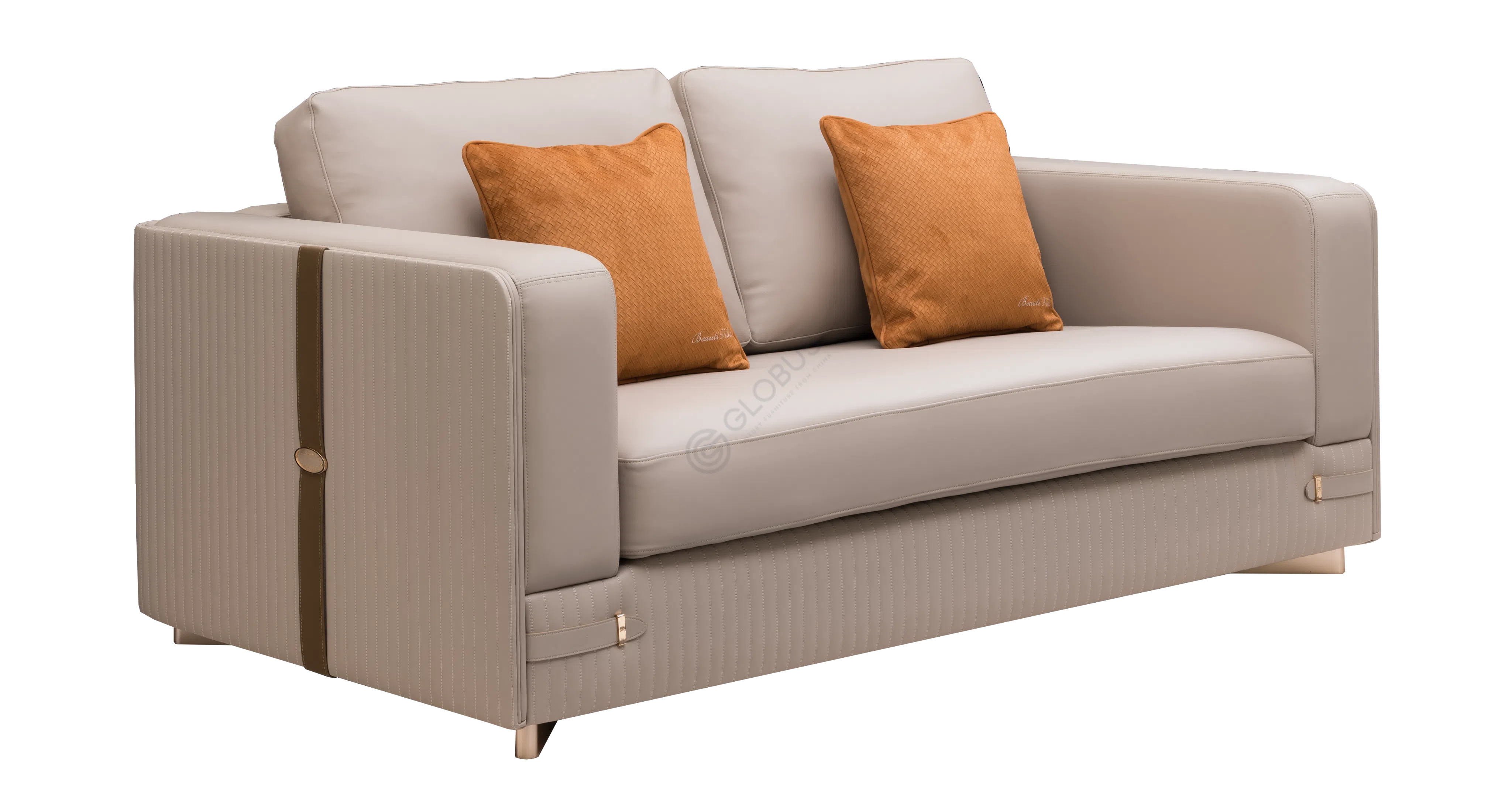 Каждая деталь этого кресла продумана с особым вниманием. Вертикальная стежка на внешней стороне корпуса придает фактурности и подчеркивает объем, в то время как гладкая поверхность сиденья и спинки из нежной замши обещает непревзойденный комфорт. Декоративные элементы, напоминающие стильные ремни из светлой кожи с металлическими пряжками, служат элегантным украшением, добавляя изысканности силуэту.
