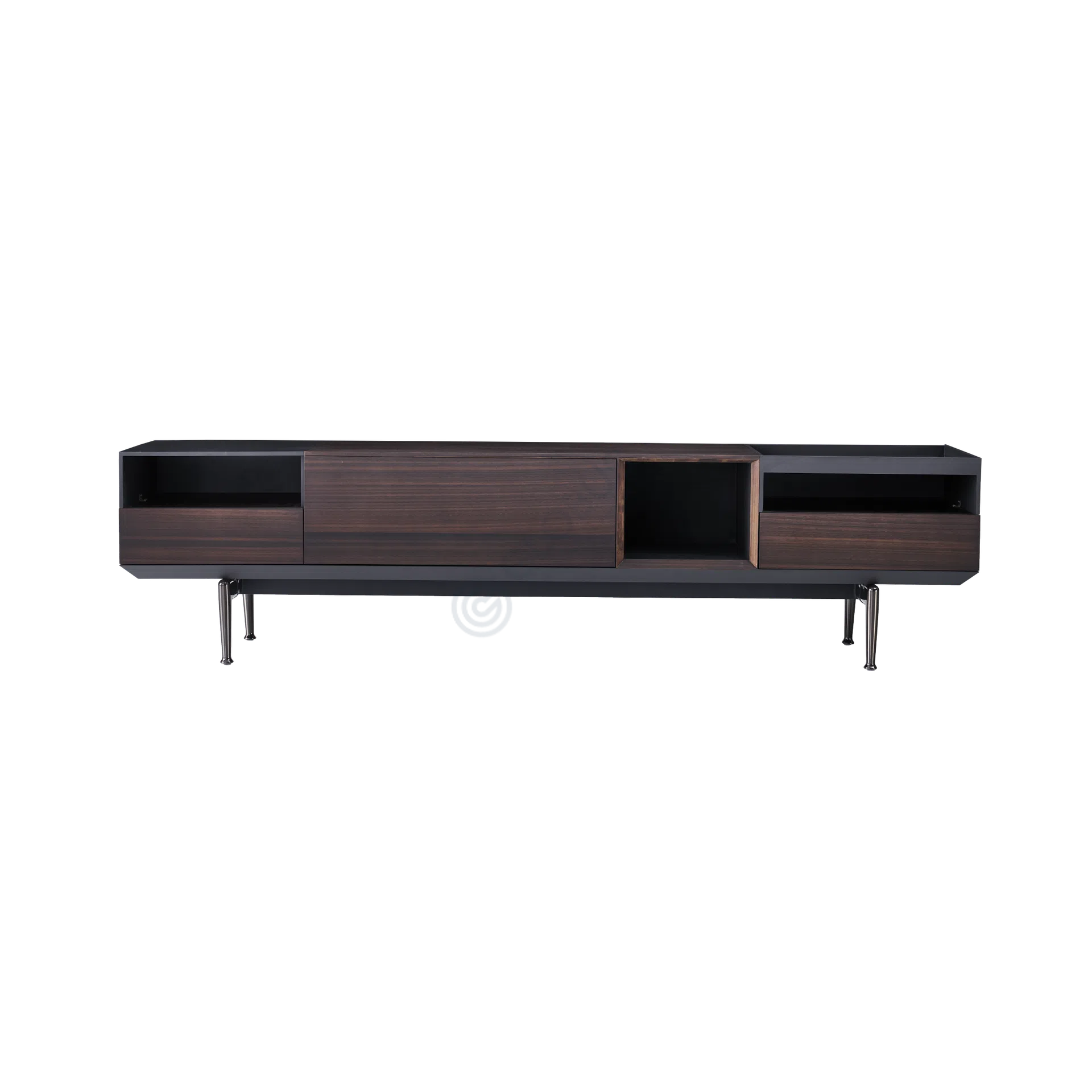 Изящный буфет представляет собой воплощение современного стиля и функциональности, предлагая идеальное решение для организации пространства. Его фасад, выполненный из качественного шпона темного оттенка, демонстрирует благородную древесную текстуру, создавая ощущение уюта и изысканности. Четкие линии каркаса из ХДФ гармонично сочетаются с полированными опорами из нержавеющей стали, придавая всей конструкции легкость и визуальную элегантность.