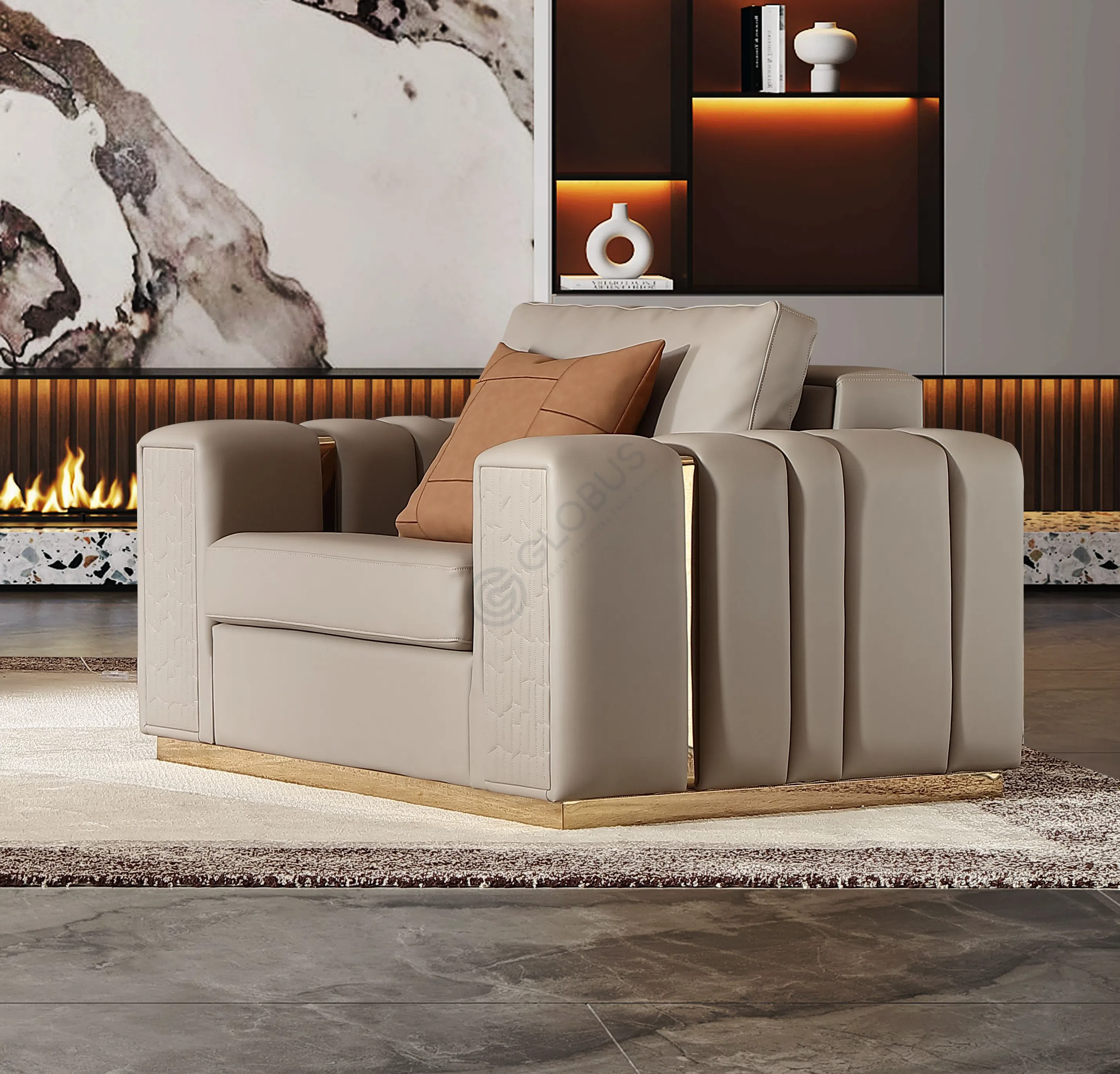 Особый акцент сделан на деталях: подлокотники декорированы уникальным геометрическим узором, добавляющим индивидуальности. Комфортные подушки с графическим принтом завершают образ, создавая уют и приглашая расслабиться. Диван дарит ощущение комфорта и становится центральным элементом интерьера, отражающим безупречный вкус владельца.