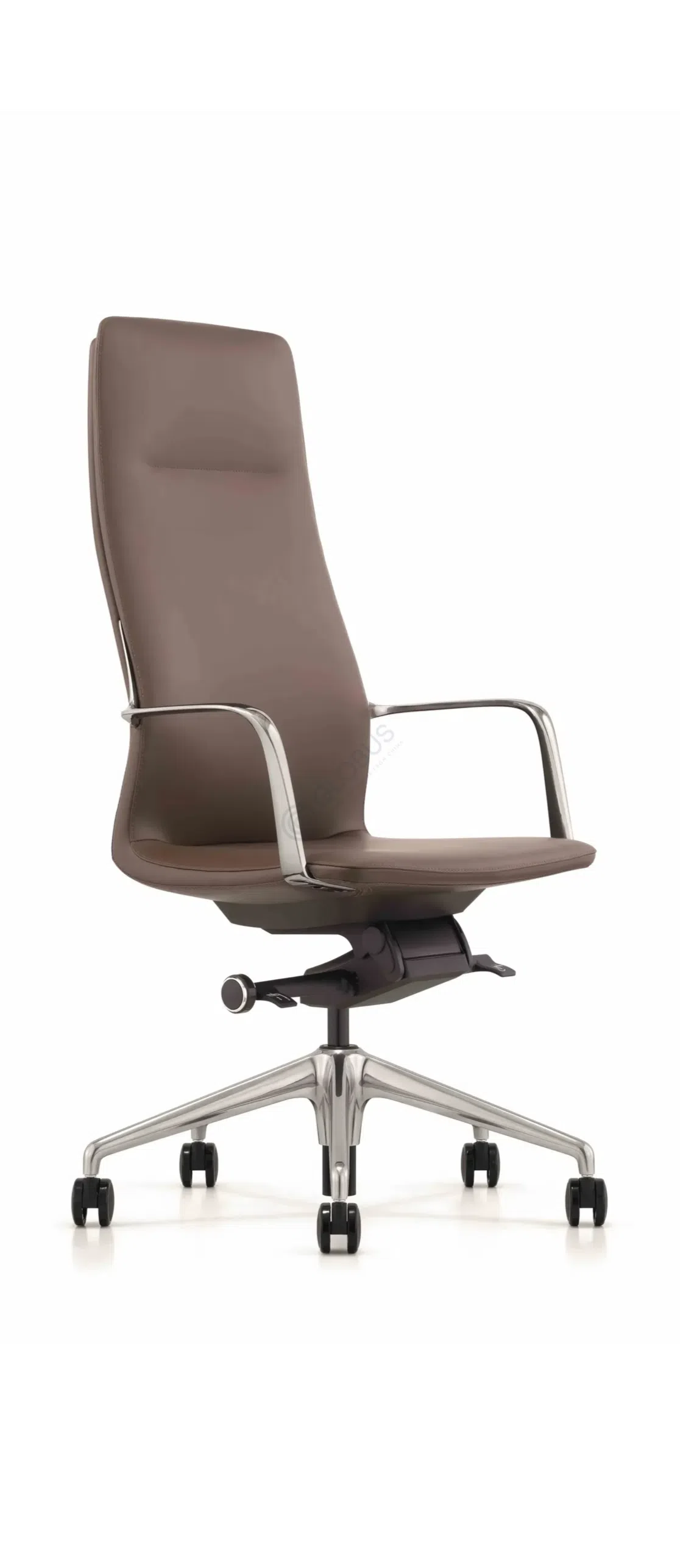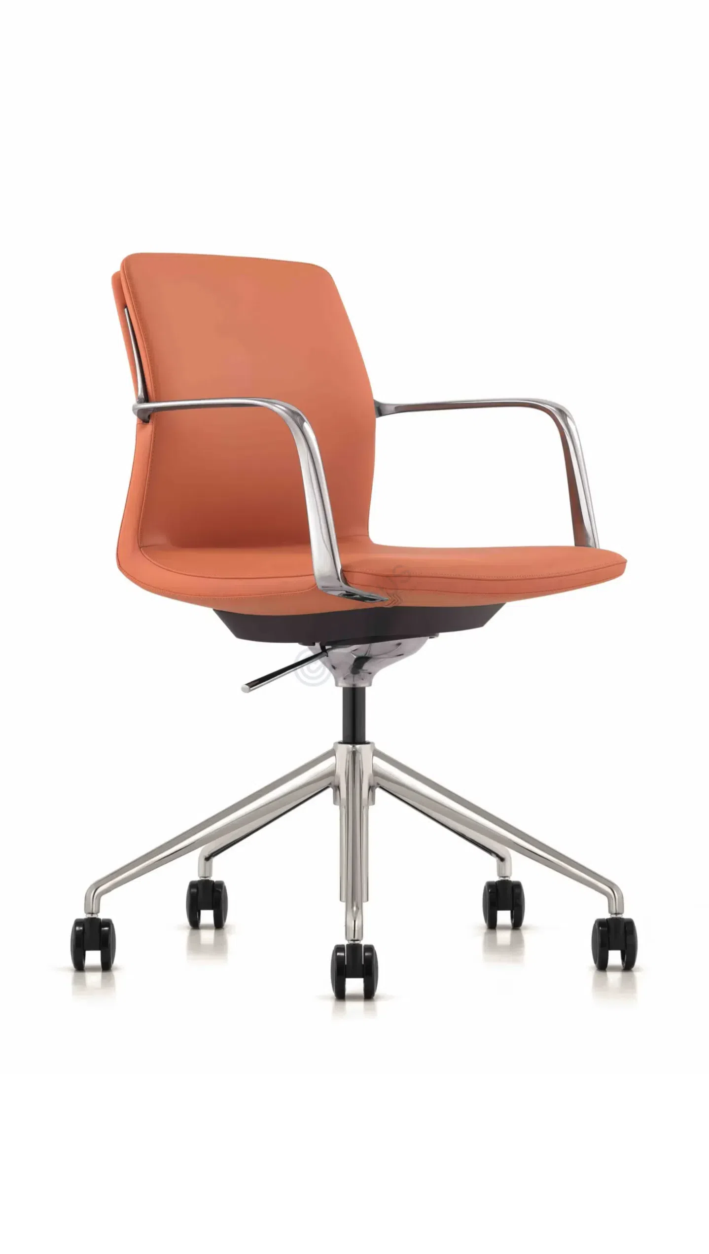 Обивка из натуральной кожи придает сиденью и спинке ощущение мягкости и роскоши, обеспечивая приятные тактильные ощущения. Изящные подлокотники выполнены из полированного алюминия, добавляя конструкции визуальную легкость и прочность. Пятилучевое основание на колесиках, также изготовленное из металла, гарантирует устойчивость и свободу передвижения по полу.