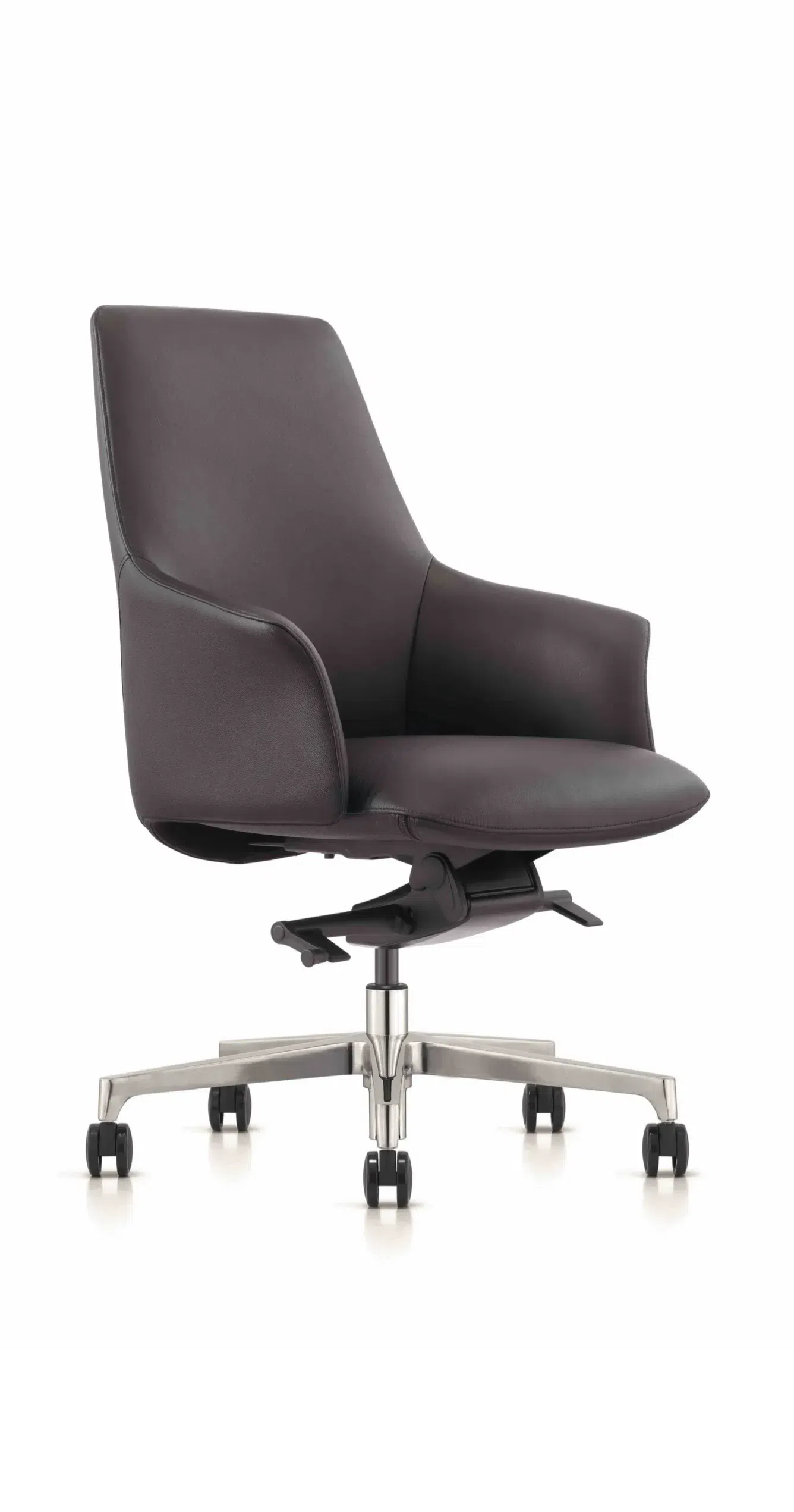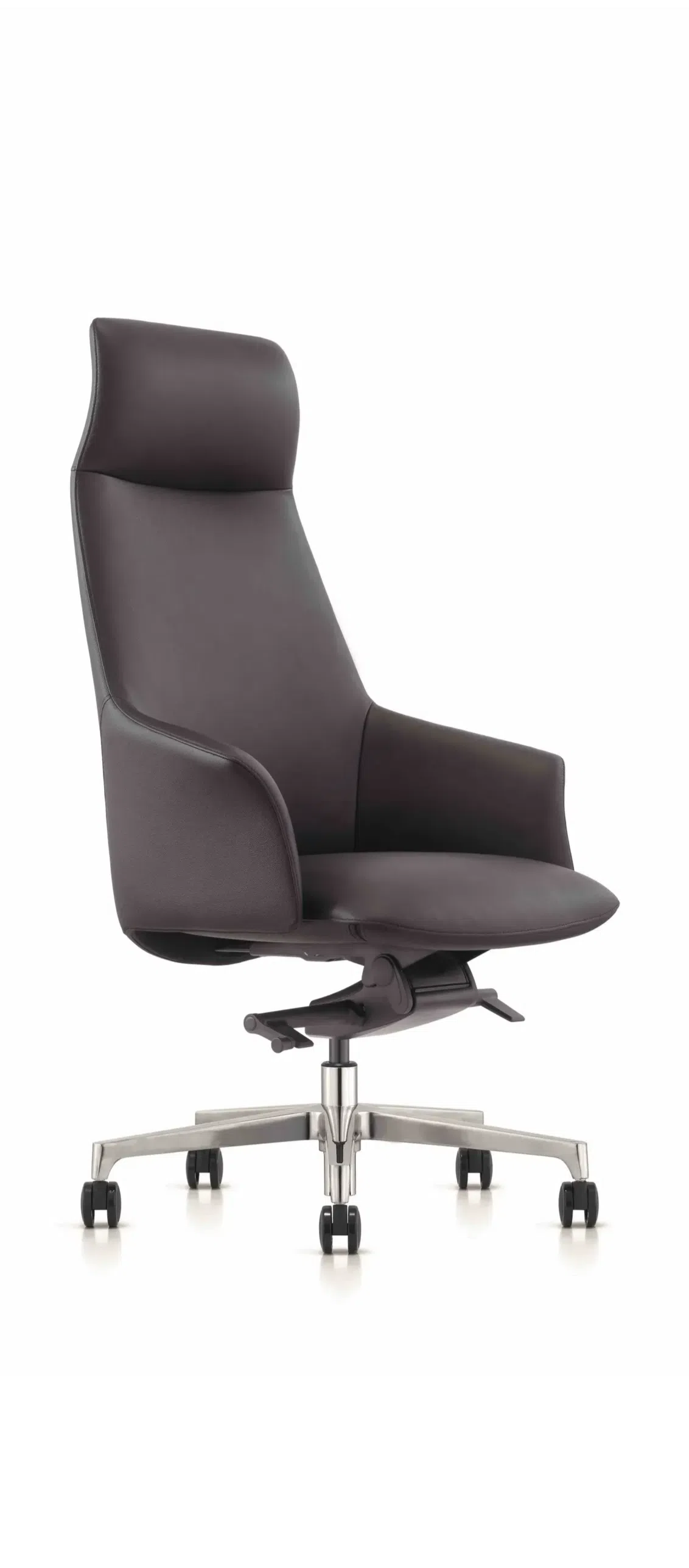 Основание выполнено из прочного алюминия, придающего конструкции устойчивость и визуальную легкость благодаря своей полированной поверхности. Обивка представляет собой роскошную натуральную кожу глубокого оттенка, которая не только выглядит изысканно, но и ощущается приятно на ощупь. Внутренняя структура, созданная с применением качественной фанеры, обеспечивает долговечность и надежность изделия.