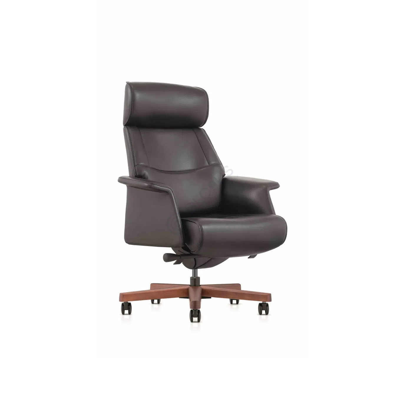 Сиденье и спинка обтянуты роскошной натуральной кожей, обеспечивающей исключительные тактильные ощущения и долговечность. Обивка дарит ощущение мягкости и поддержки, необходимой для долгих часов работы. Основание выполнено из массива натурального дерева, добавляя конструкции теплоты и благородства. Деревянная опора не только надежна, но и подчеркивает премиальное качество изделия.