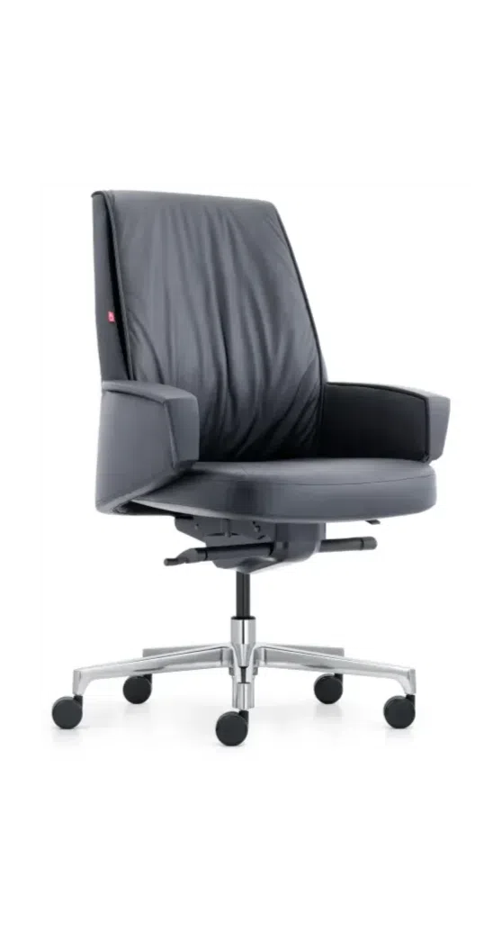 Высококачественная кожа, покрывающая сиденье и спинку, дарит ощущение роскоши и приятна на ощупь. Основание из прочного алюминия придает конструкции устойчивость и служит стильным акцентом, подчеркивая надежность. Отдельные элементы из полиуретанового пластика дополняют дизайн, обеспечивая практичность и долговечность.