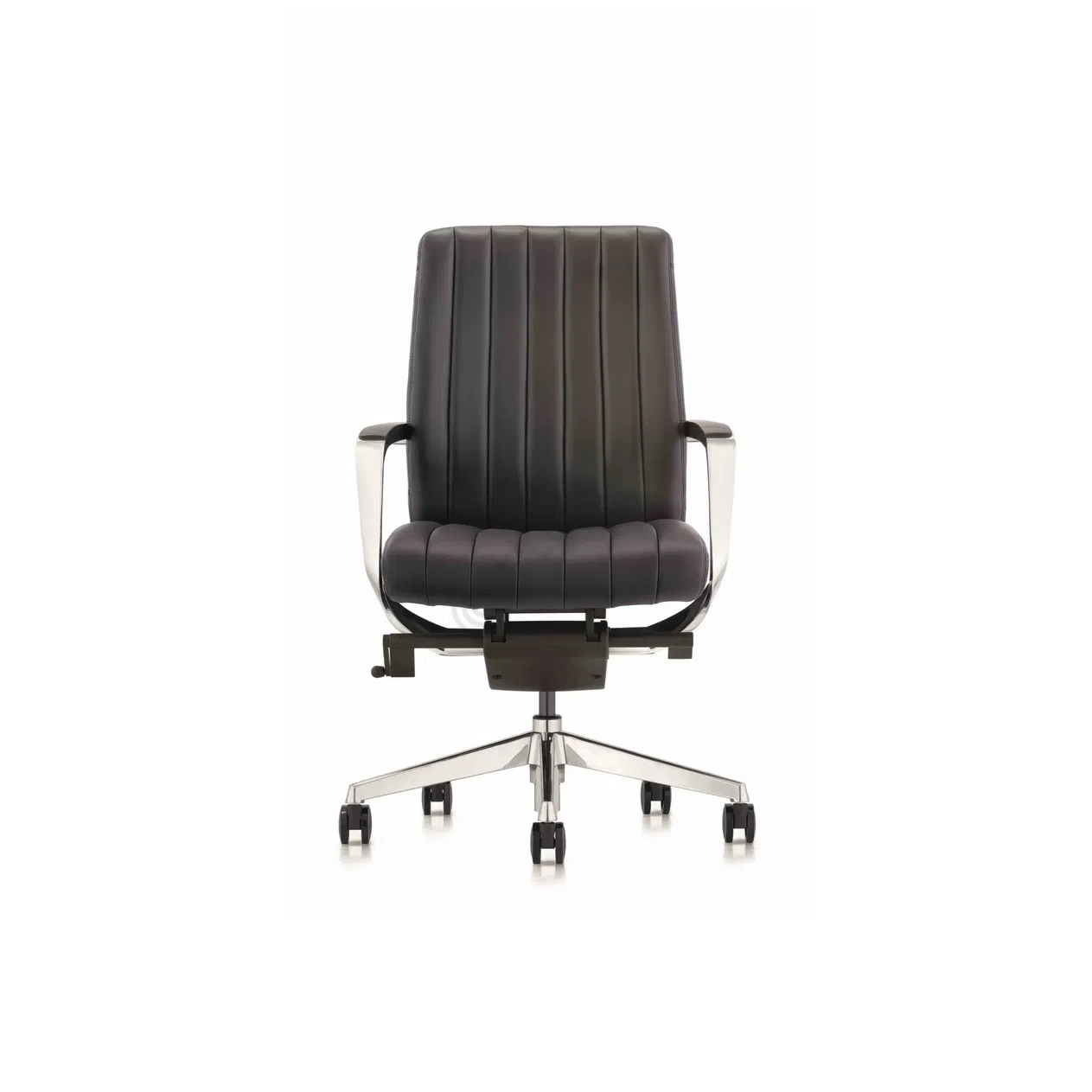 Элементы из полиуретанового пластика интегрированы для обеспечения функциональности и долговечности механизмов регулировки. Подлокотники, выполненные также из алюминия с мягкими накладками, предлагают дополнительный комфорт. Каждый компонент этого кресла служит цели создать оптимальные условия для продуктивной работы, не жертвуя при этом стилевой выразительностью. Это изделие – символ статуса и внимания к деталям в современном кабинете.