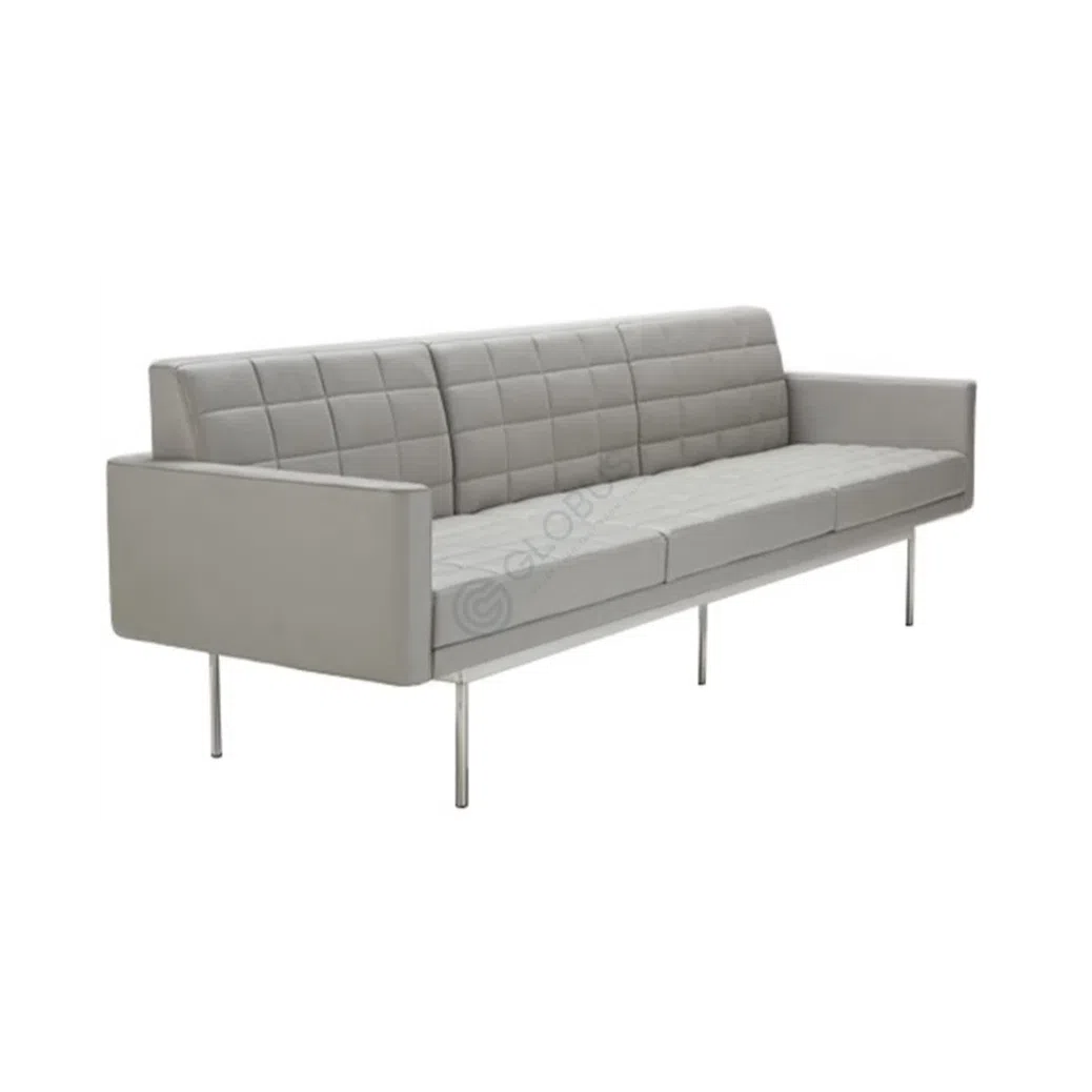 Конструкция опирается на тонкое основание, выполненное из прочной стали и нержавеющей стали, придавая предмету устойчивость и визуальную невесомость. Сиденье и спинка обтянуты высококачественной искусственной кожей ПВХ, приятной на ощупь и практичной в уходе. Акцентным элементом служит деликатный стеганый узор, формирующий квадратные секции.