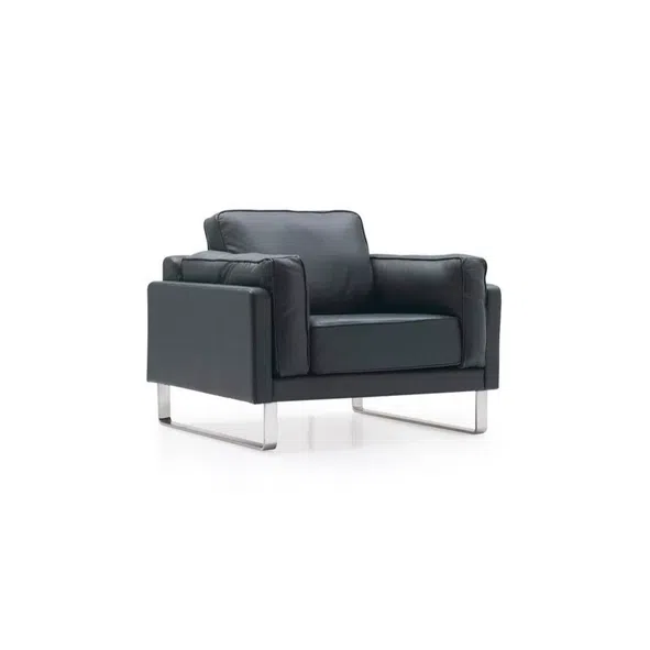 Основа конструкции выполнена из натурального дерева, обеспечивая прочность и долговечность каркаса. Изящные опоры из полированной нержавеющей стали придают дивану визуальную легкость и добавляют штрих современного блеска. Обивка из качественной искусственной кожи (ПВХ) приятна на ощупь и проста в уходе, сохраняя свой первозданный вид на долгие годы.