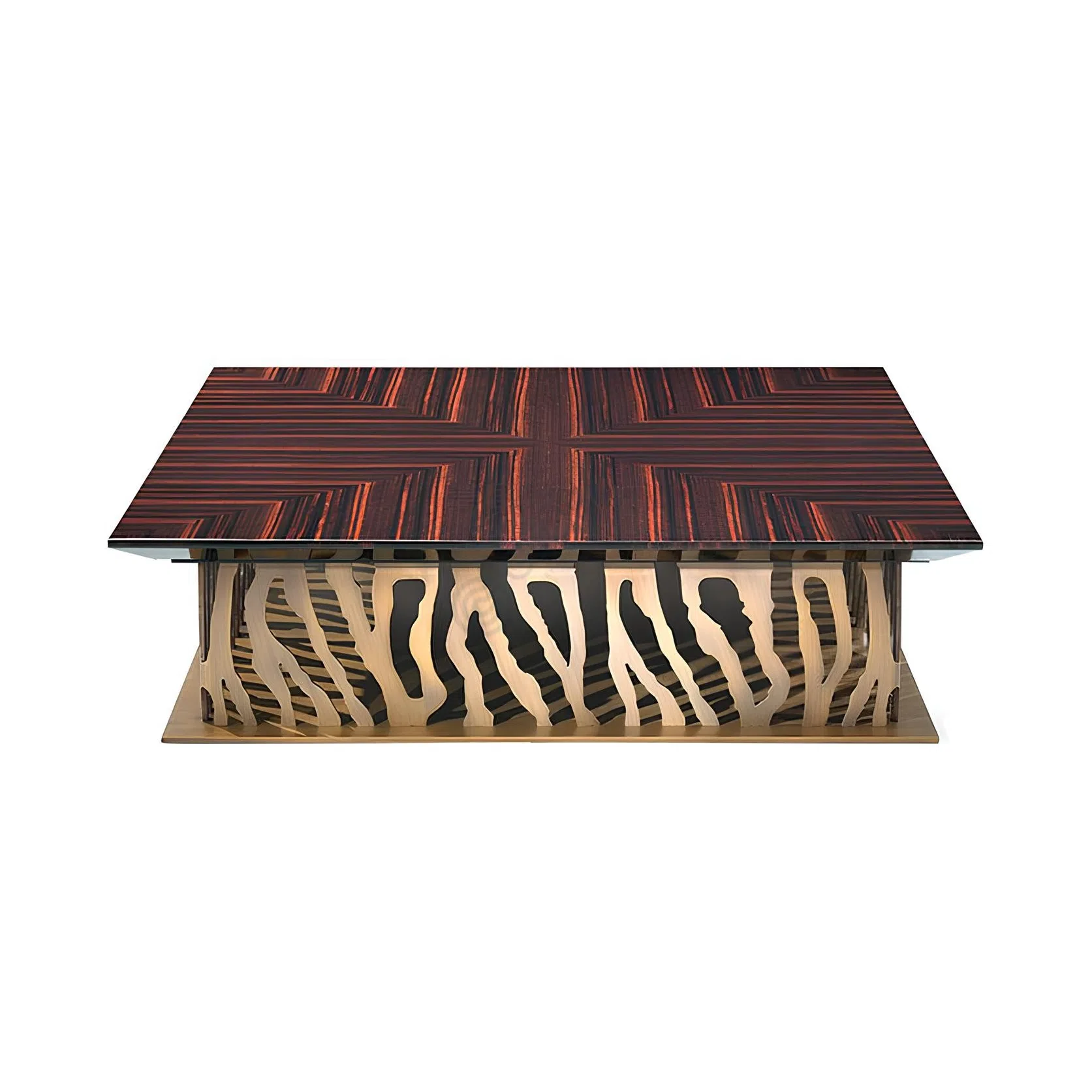 Ее основание представляет собой завораживающее сплетение металлических элементов, напоминающее органические линии или стилизованные ветви. Этот скульптурный элемент, выполненный из металла с теплым бронзовым или золотистым отливом, придает изделию динамичность и неповторимый характер. Он создает ощущение движения и легкости, несмотря на основательность конструкции.