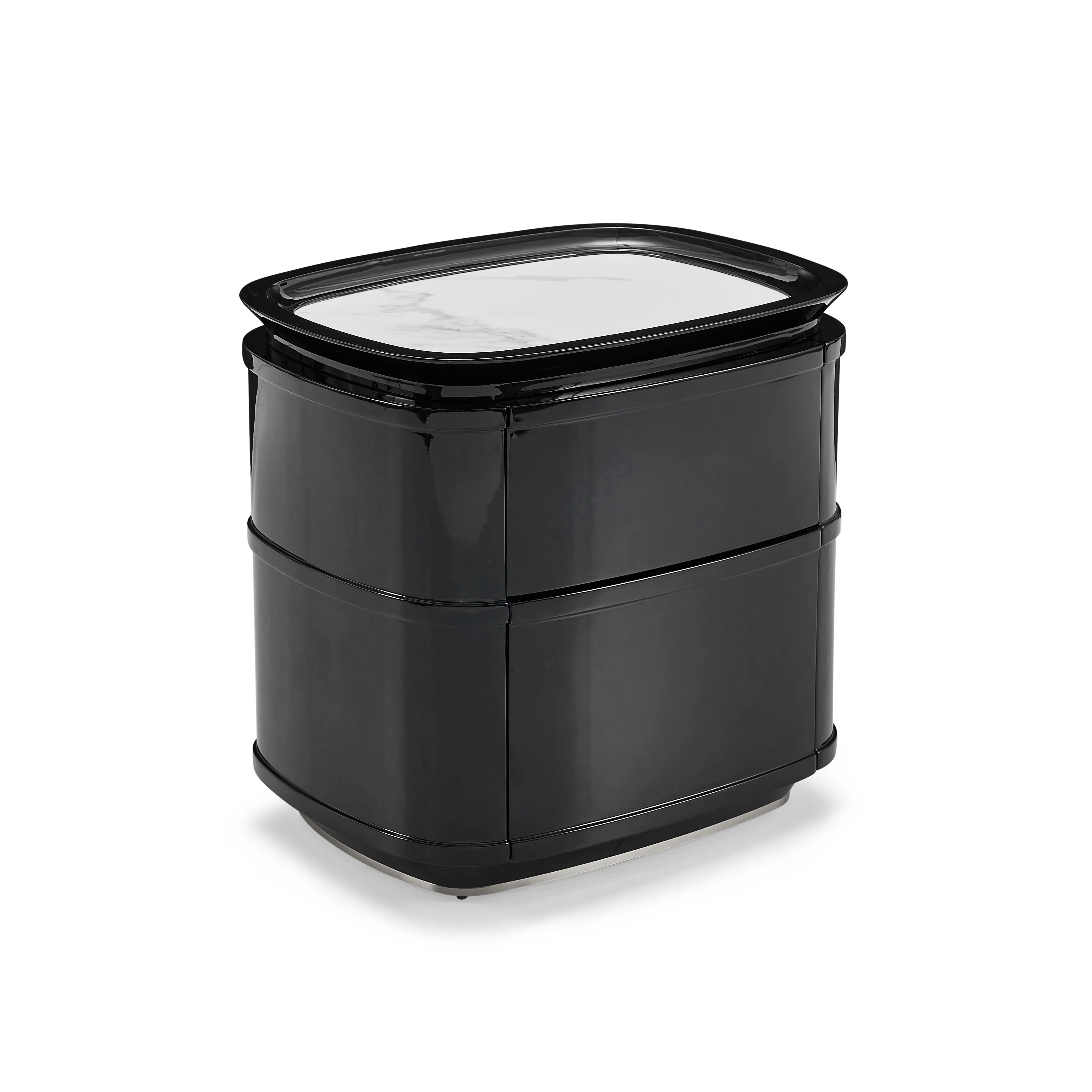 Этот предмет мебели демонстрирует изысканный силуэт, сочетающий в себе плавные линии и четкую структуру, характерные как для элегантного стиля ар-деко, так и для современной эстетики. Его корпус выполнен с закругленными углами и многоуровневыми ящиками, создающими эффектный объем и утонченный внешний вид. Поверхность обладает глубоким, глянцевым покрытием, которое придает объекту роскошный блеск и подчеркивает высокое качество исполнения.