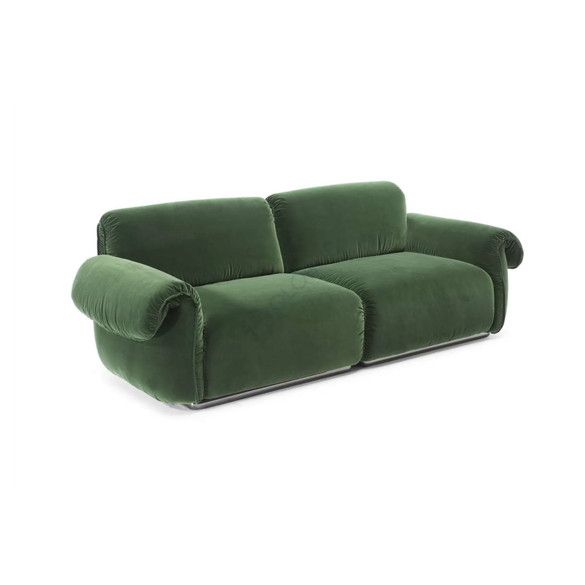 Обивка из нежного текстиля окутывает пышные объемы, приглашая насладиться моментом релаксации. Внутренняя структура опирается на прочный каркас из натурального дерева, а невесомая металлическая основа придает конструкции легкость, подчеркивая современный характер предмета и его элегантность.