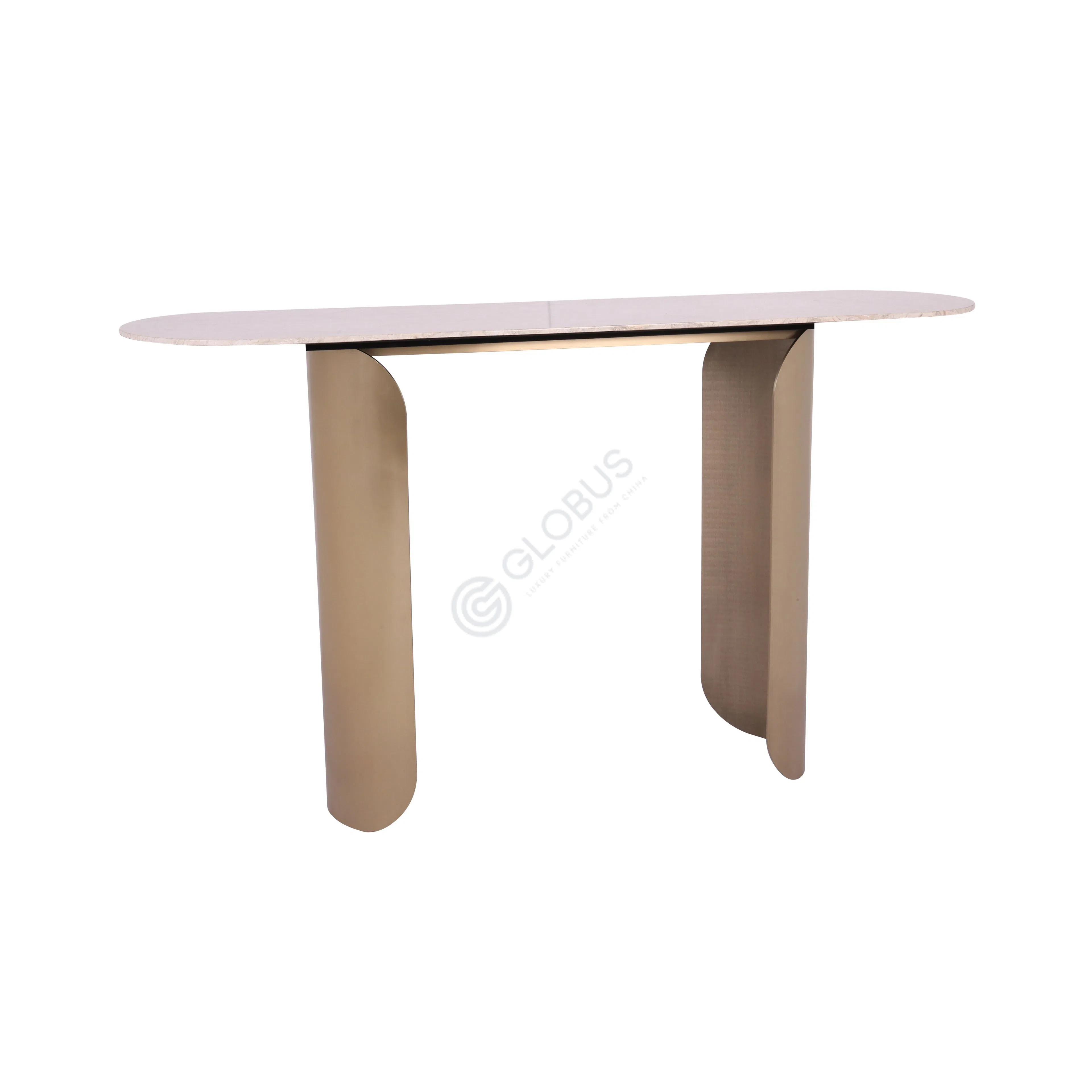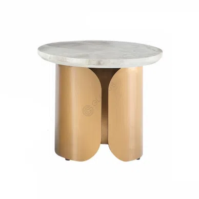 Модель выполнена в современном стиле и сочетает натуральный мрамор с нержавеющей сталью. Круглая столешница с тонкими прожилками придаёт изделию аккуратность и свежесть, а опора с рифлёной поверхностью обеспечивает стабильность и игру света.
