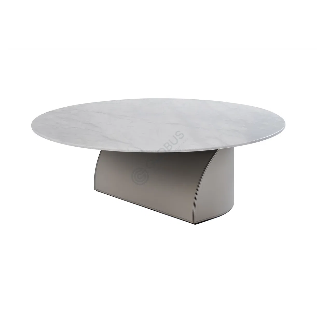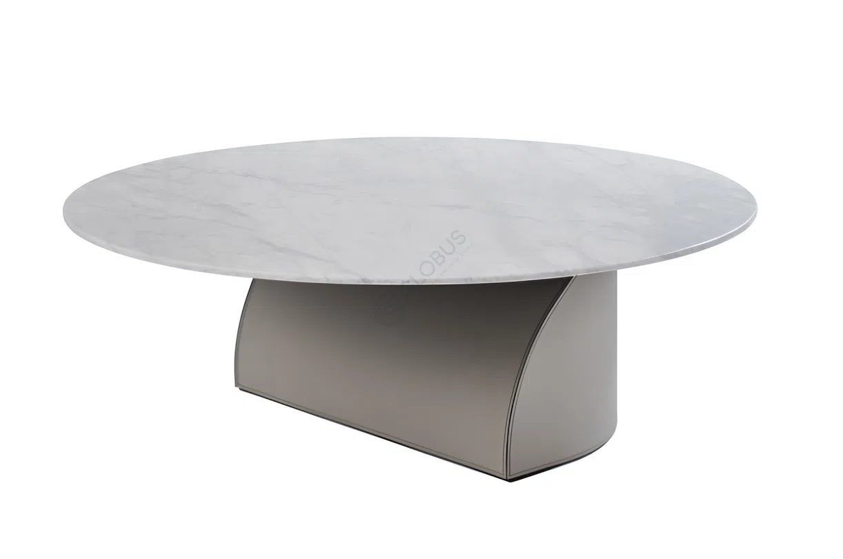 Опора выполнена из углеродистой стали и обтянута шорно-седельной кожей, благодаря чему сочетается визуальная легкость конструкции и высокая прочность. Гармония текстур и четкость линий позволяют столу легко интегрироваться как в лаконичные, так и в насыщенные интерьеры.