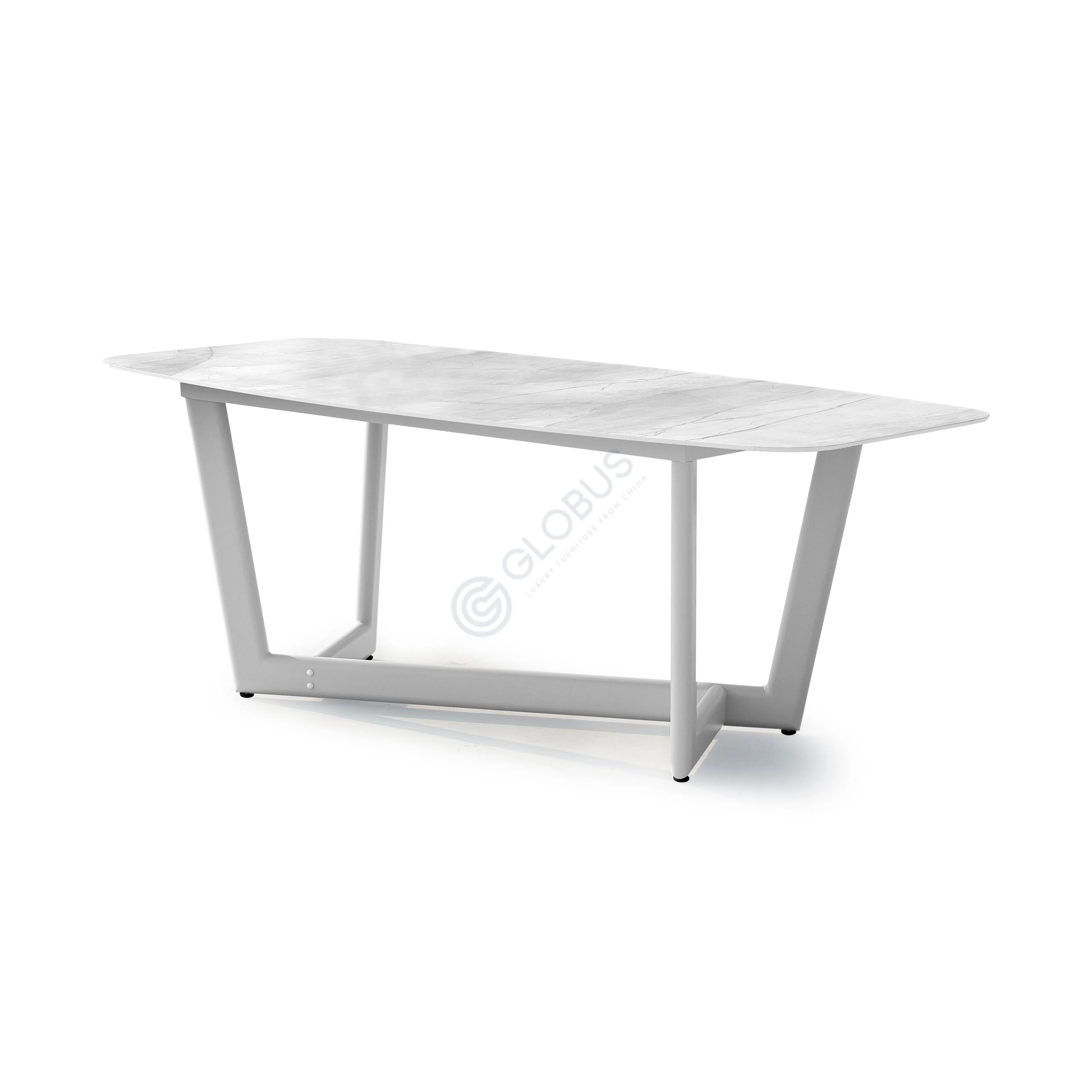 Основа стола выполнена из прочного алюминия, который гарантирует долговечность и устойчивость к внешним воздействиям. Столешница покрыта изысканной стеклокерамикой, имитирующей натуральный камень. Этот материал не только придает изделию благородный вид, но и обладает исключительной стойкостью к царапинам, пятнам и перепадам температур, делая уход за поверхностью максимально простым.