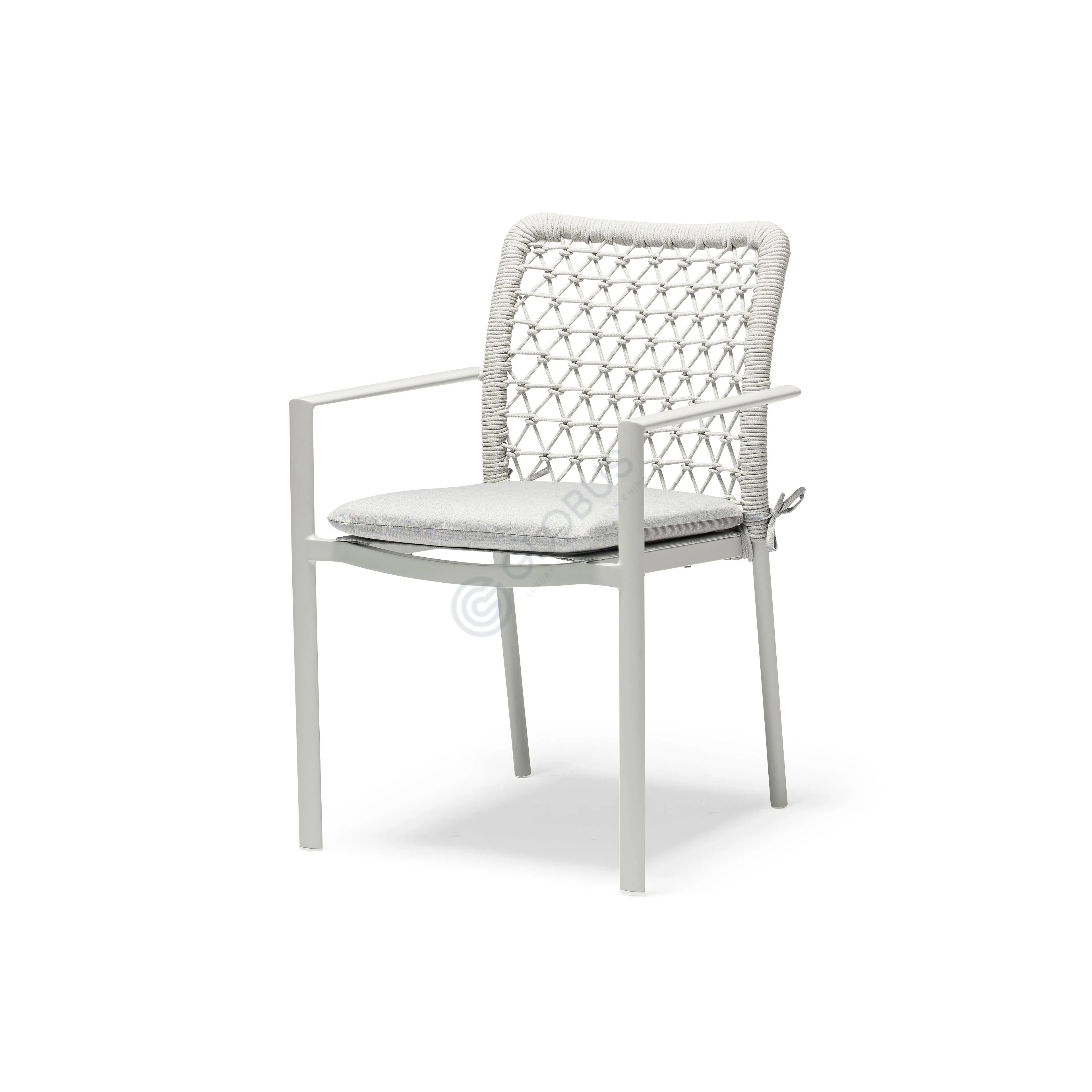 Конструкция основывается на прочном алюминиевом каркасе, обеспечивающем легкость и устойчивость к воздействию окружающей среды. Столешница выполнена из стеклокерамики, материала, который не только придает предмету изысканный вид благодаря своему узору, но и обладает высокой долговечностью и простотой в уходе.