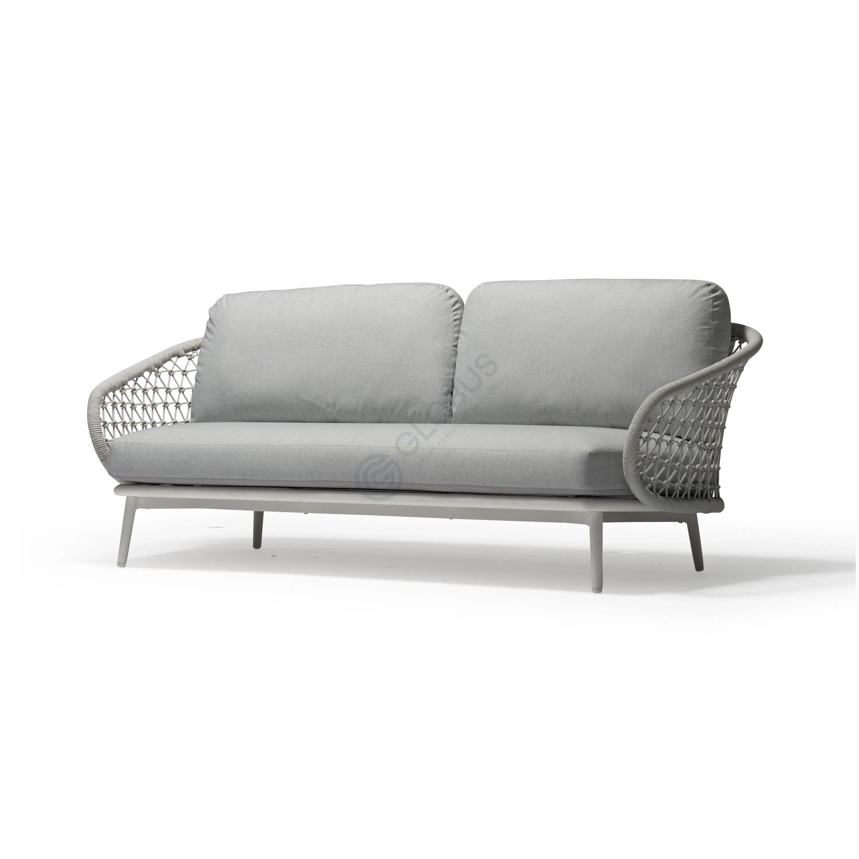 Основание изделия выполнено из прочного алюминия, обеспечивающего долговечность и устойчивость в условиях переменчивой погоды. Спинка оформлена изящным плетением из качественной веревки, что придает предмету легкость и визуальную воздушность, а также гармонично сочетается с общим современным стилем. Мягкое ложе и комплект подушек, обтянутых приятным на ощупь текстилем, предлагают исключительный комфорт.