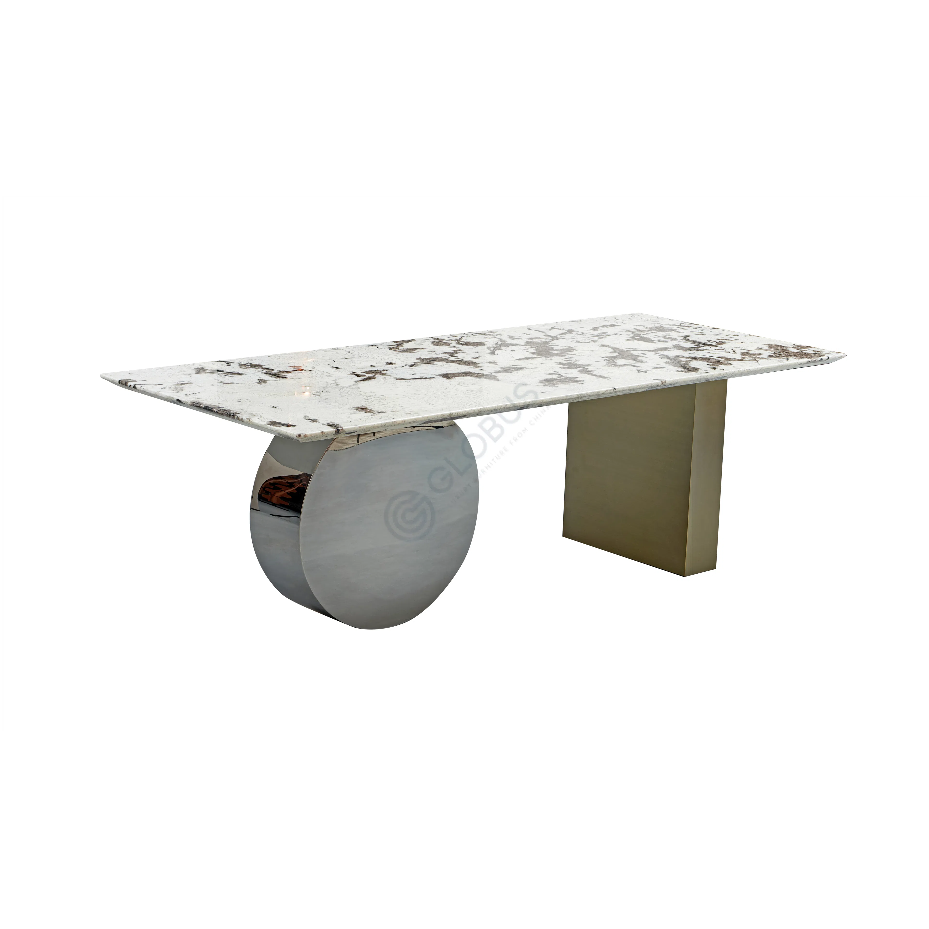 Рабочая поверхность изделия выполнена из натурального мрамора, демонстрирующего уникальный рисунок прожилок, каждая из которых является свидетельством подлинности природного камня. Глянцевая отделка столешницы подчеркивает его благородную текстуру. В центральной части органично интегрирована система для заваривания чая, представляющая собой элегантное решение для традиционного чаепития. Опора конструкции составлена из двух геометрических форм, выполненных из прочной стали. Одна часть имеет вид мощного цилиндра с фактурной поверхностью, другая – строгий прямоугольный блок. Это асимметричное решение придает столу динамичность и скульптурную завершенность.