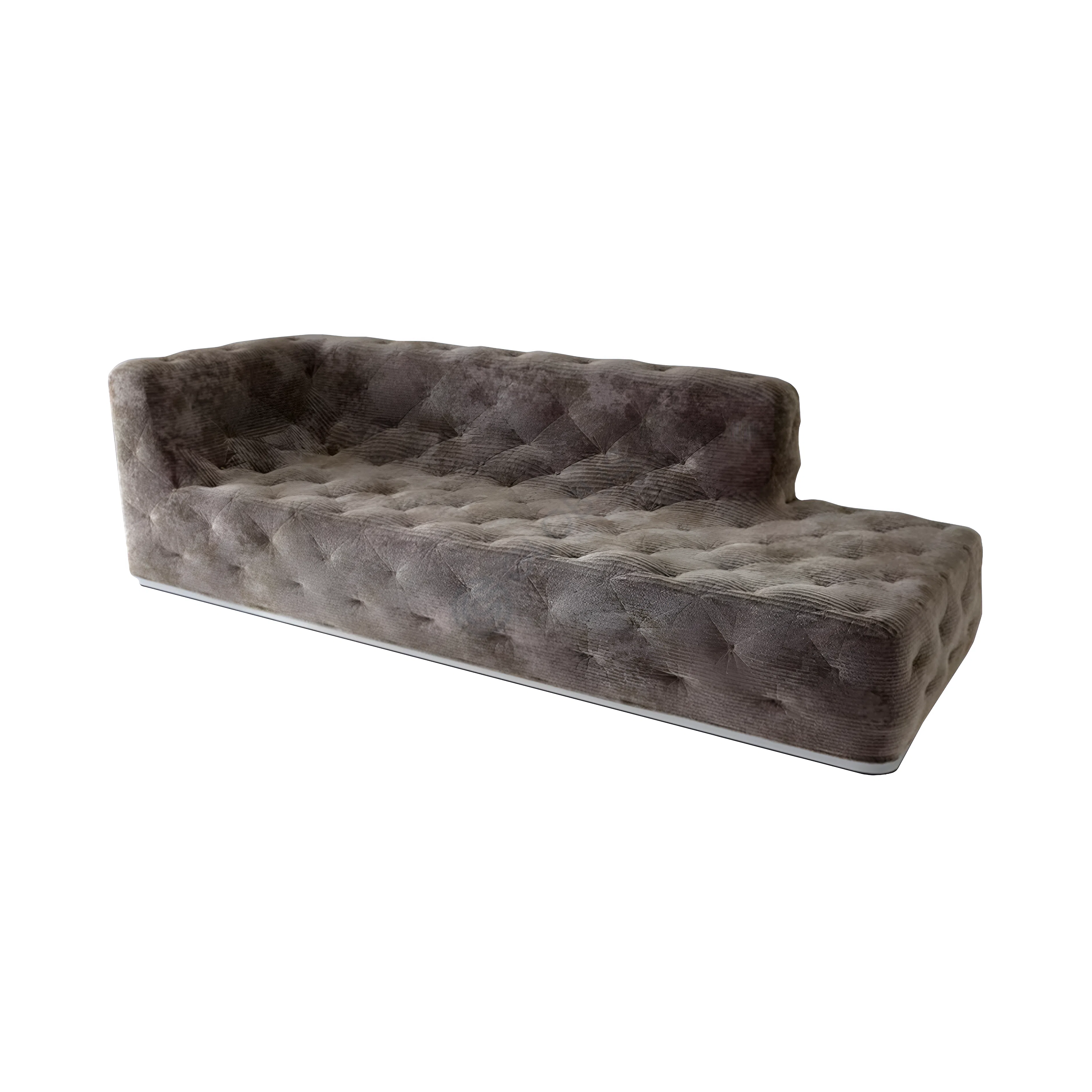 Его дизайн воплощает элегантное слияние эстетики ар-деко и лаконичности современного стиля, создавая центральный акцент в любой гостиной. Объемная каретная стяжка, деликатно покрывающая сиденье и спинку, придает ему глубокую, притягательную текстуру и выразительный объем. Эта утонченная отделка визуально преображает пространство, предлагая оазис для расслабления и созерцания.