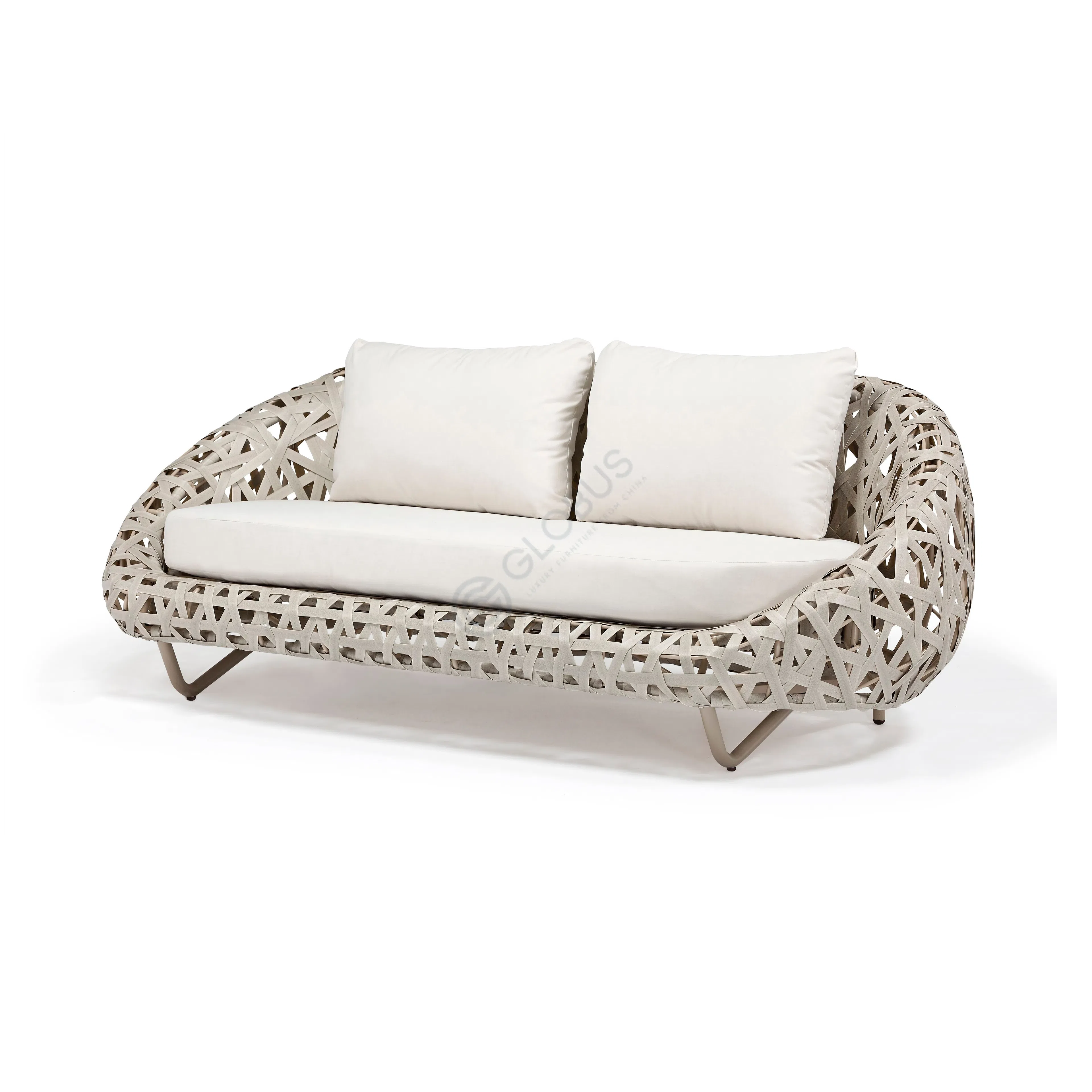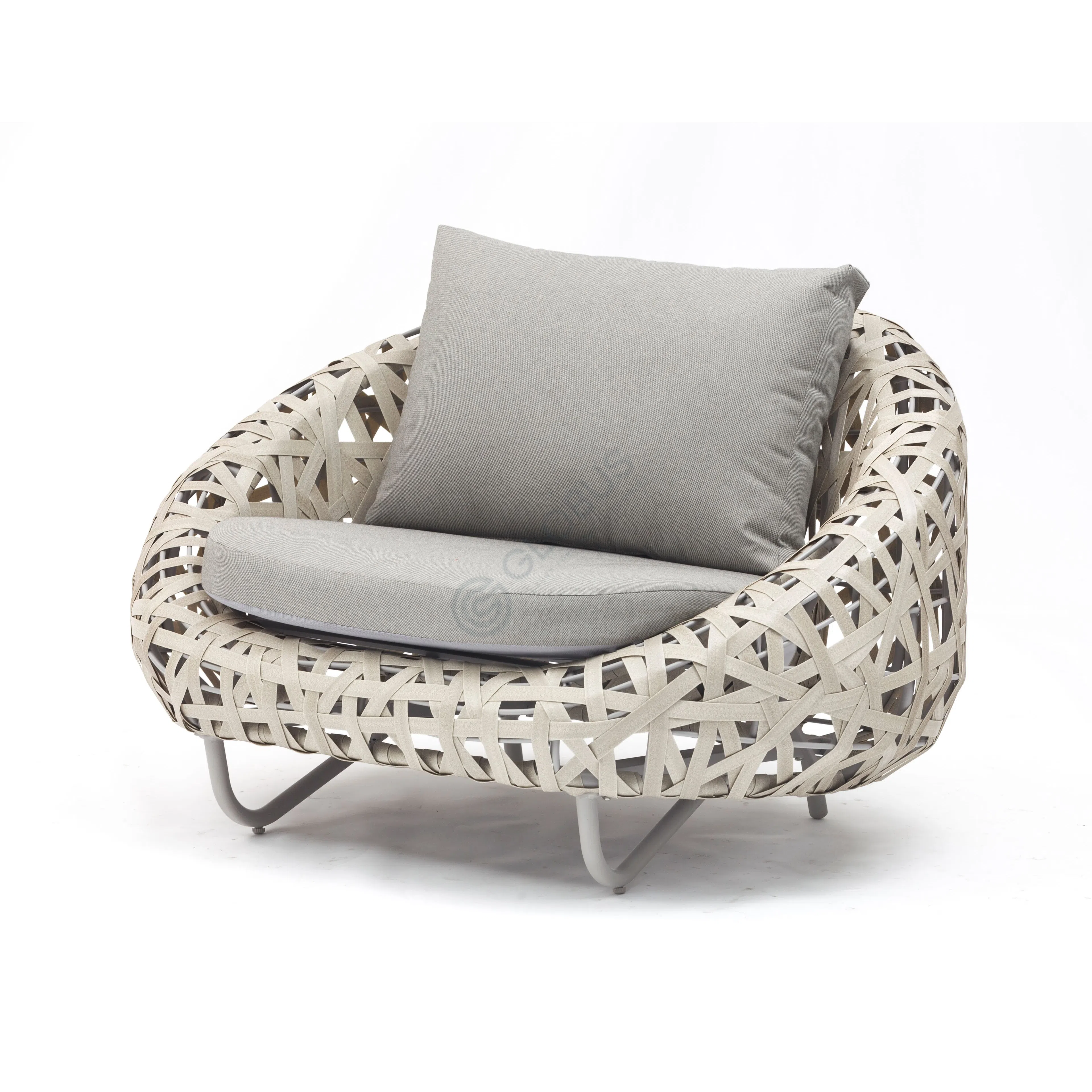 Изготовленный из высококачественных компонентов, каркас выполнен из прочного алюминия, умело оплетенного долговечным искусственным ротангом. Такое сочетание гарантирует устойчивость к различным погодным условиям, сохраняя при этом утонченный вид. Мягкие текстильные подушки завершают мебельное изделие, обещая исключительное удобство.