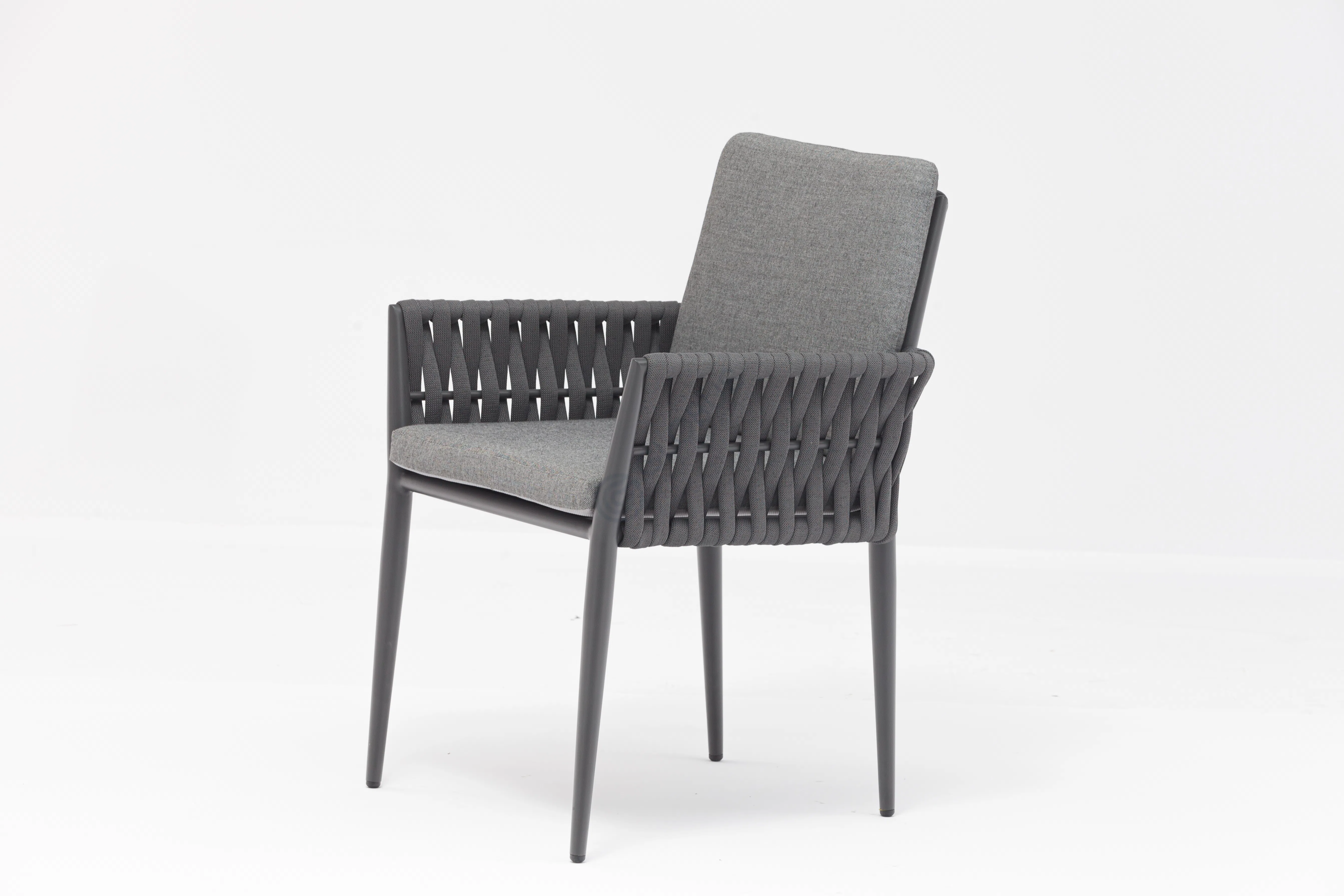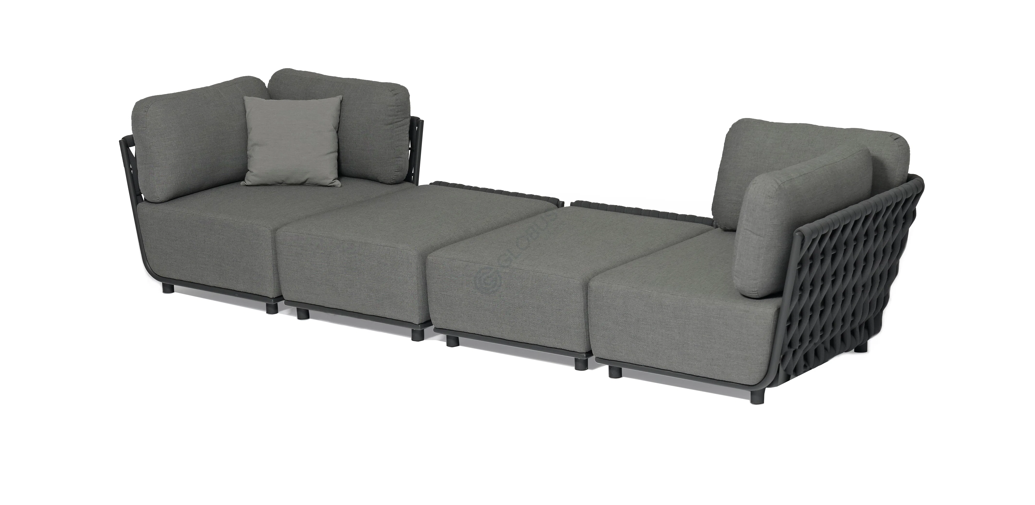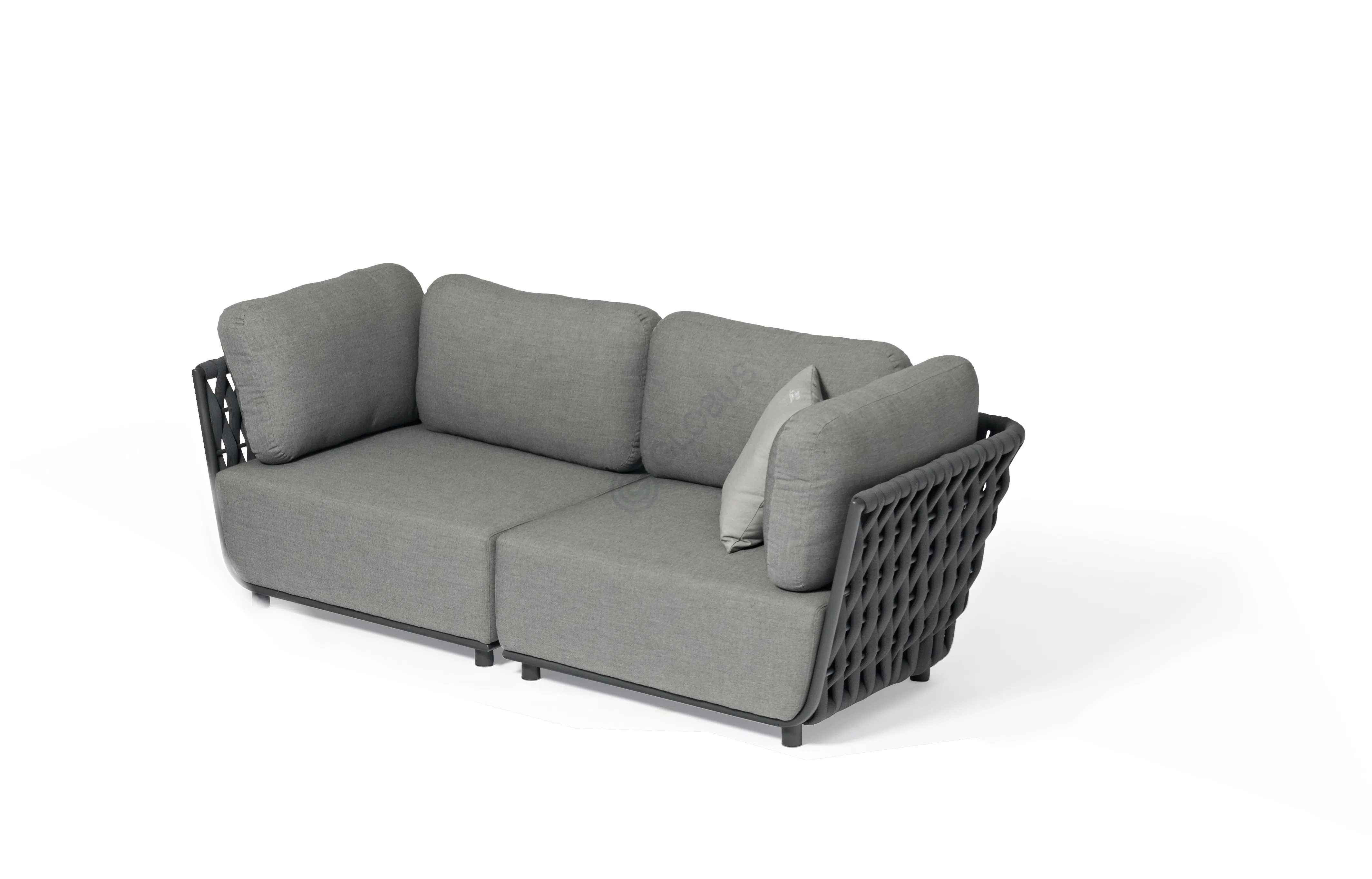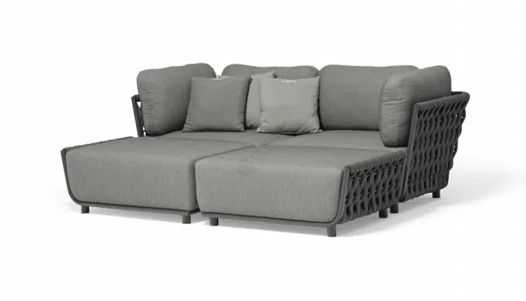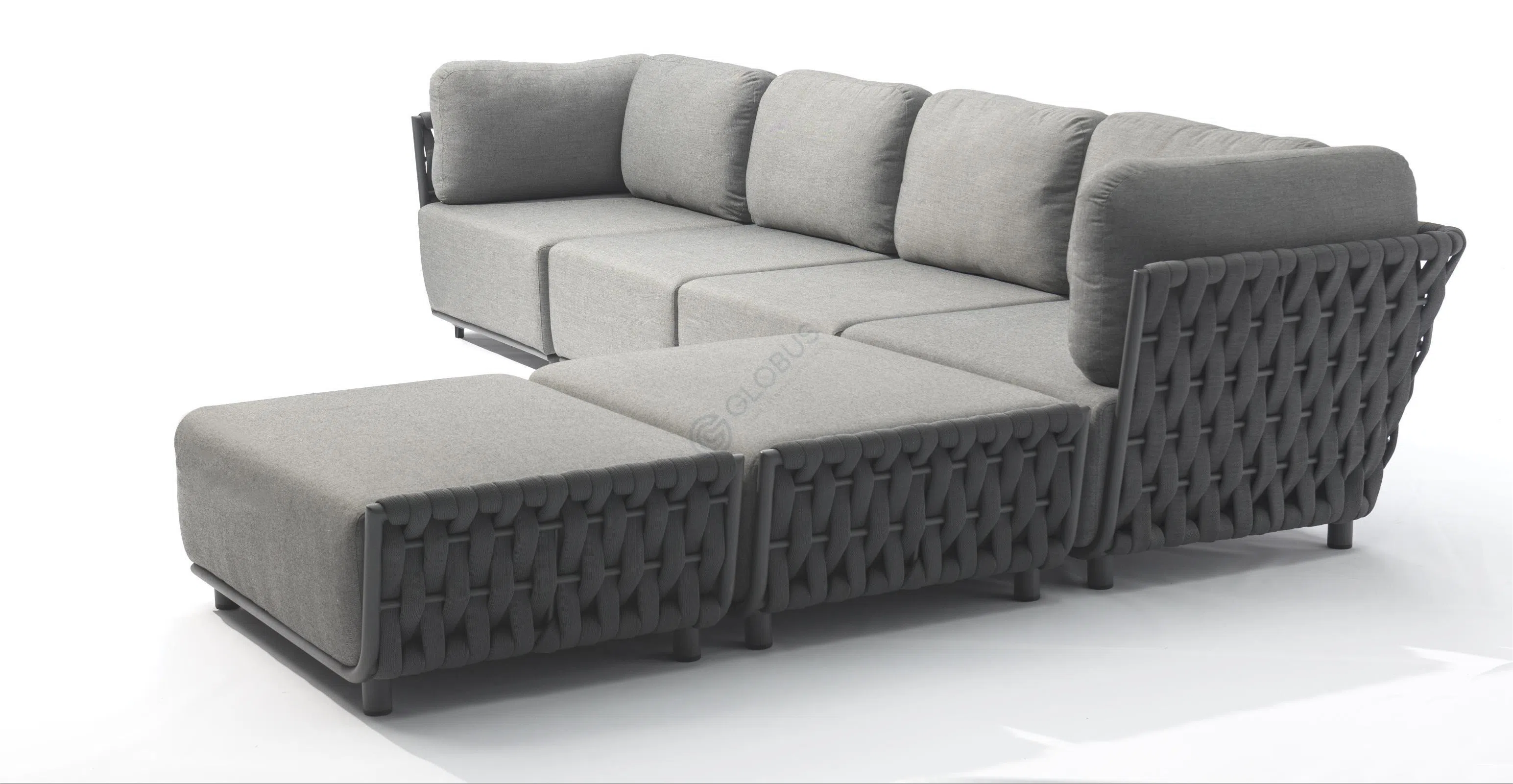 Основу конструкции составляет прочный алюминиевый каркас, обеспечивающий долговечность и стабильность. Боковые части и спинка выполнены с использованием оригинального плетения из веревки, что придает изделию особую выразительность и легкость. Дополняют образ мягкие текстильные подушки, предлагающие непревзойденный уют.