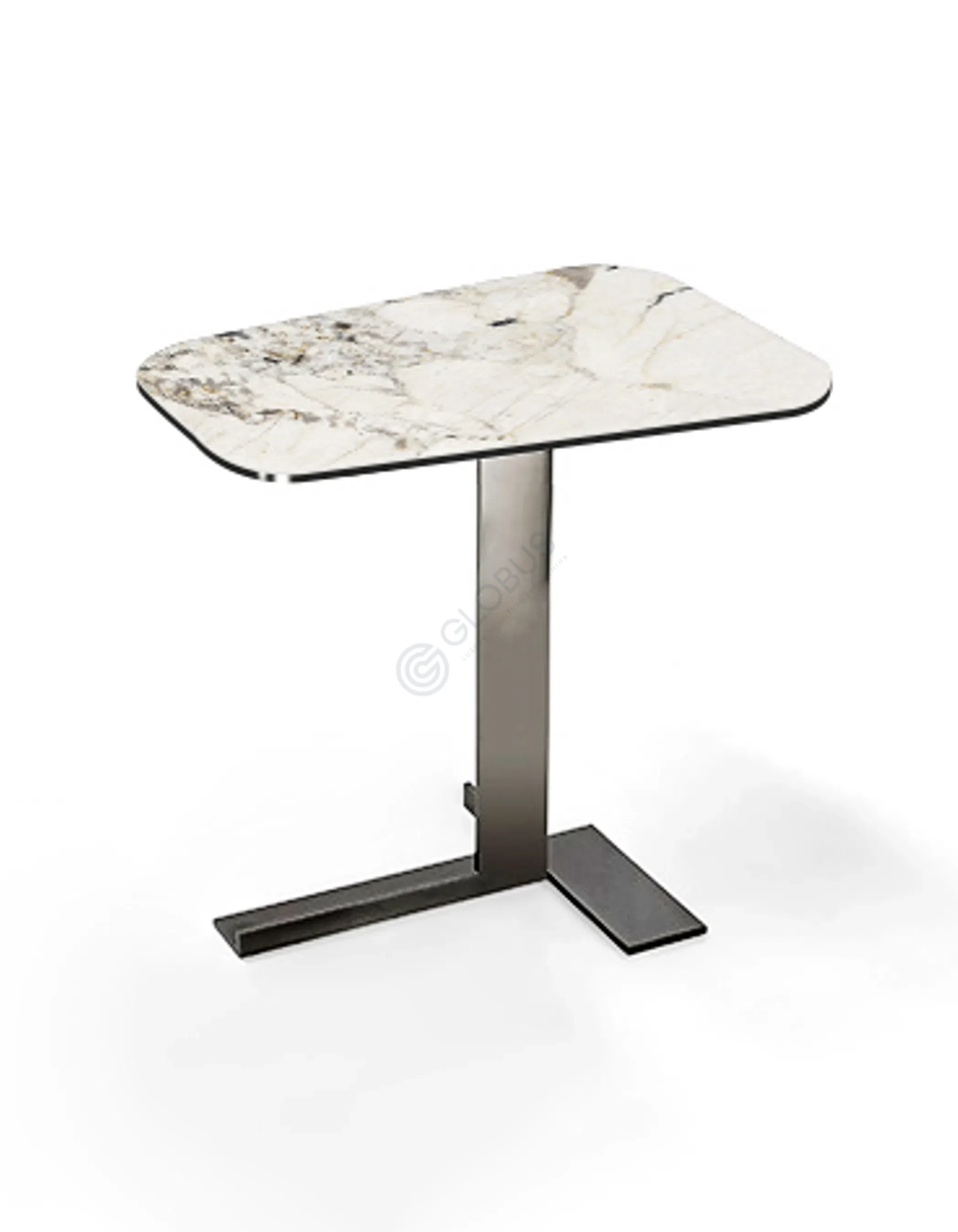 Основание столика сформировано из двух изящных опор, изготовленных из титана. Этот металл известен своей исключительной прочностью и легкостью, что обеспечивает конструкции надежность при сохранении минималистичного и утонченного облика. Глубокий оттенок титана безупречно контрастирует со светлой поверхностью мрамора, подчеркивая чистоту геометрических форм и современную эстетику дизайна.