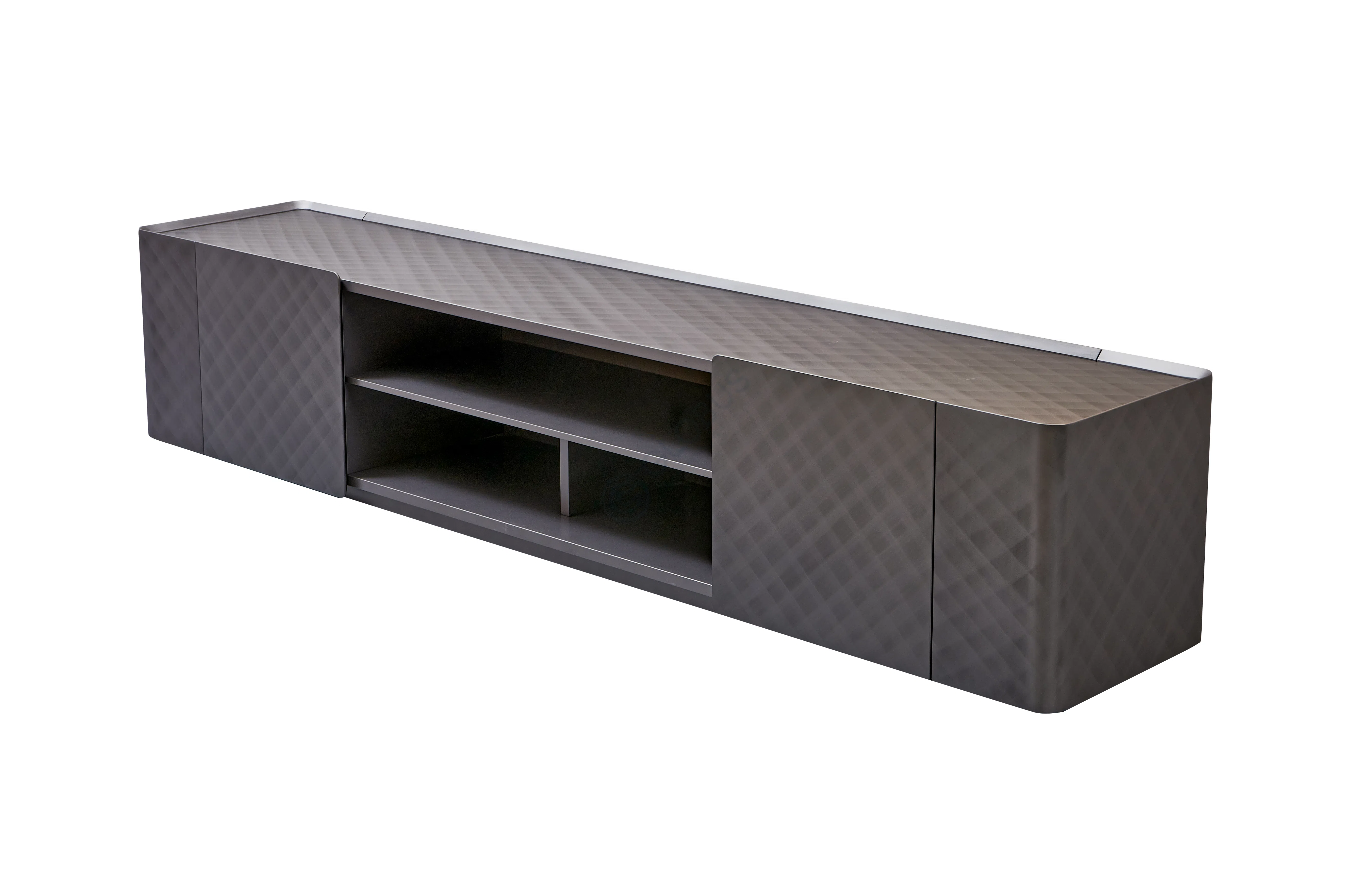 Изготовленный из прочной фанеры и отделанный высококачественной сталью, это изделие излучает надежность и эстетику модерна. Его поверхность украшает тонкий, едва уловимый рельефный орнамент, придающий глубину и динамику металлическому оттенку. Продуманная конструкция объединяет закрытые отсеки по краям с центральной секцией, где расположены три функциональных выдвижных ящика и открытая ниша для утонченного размещения декоративных предметов.