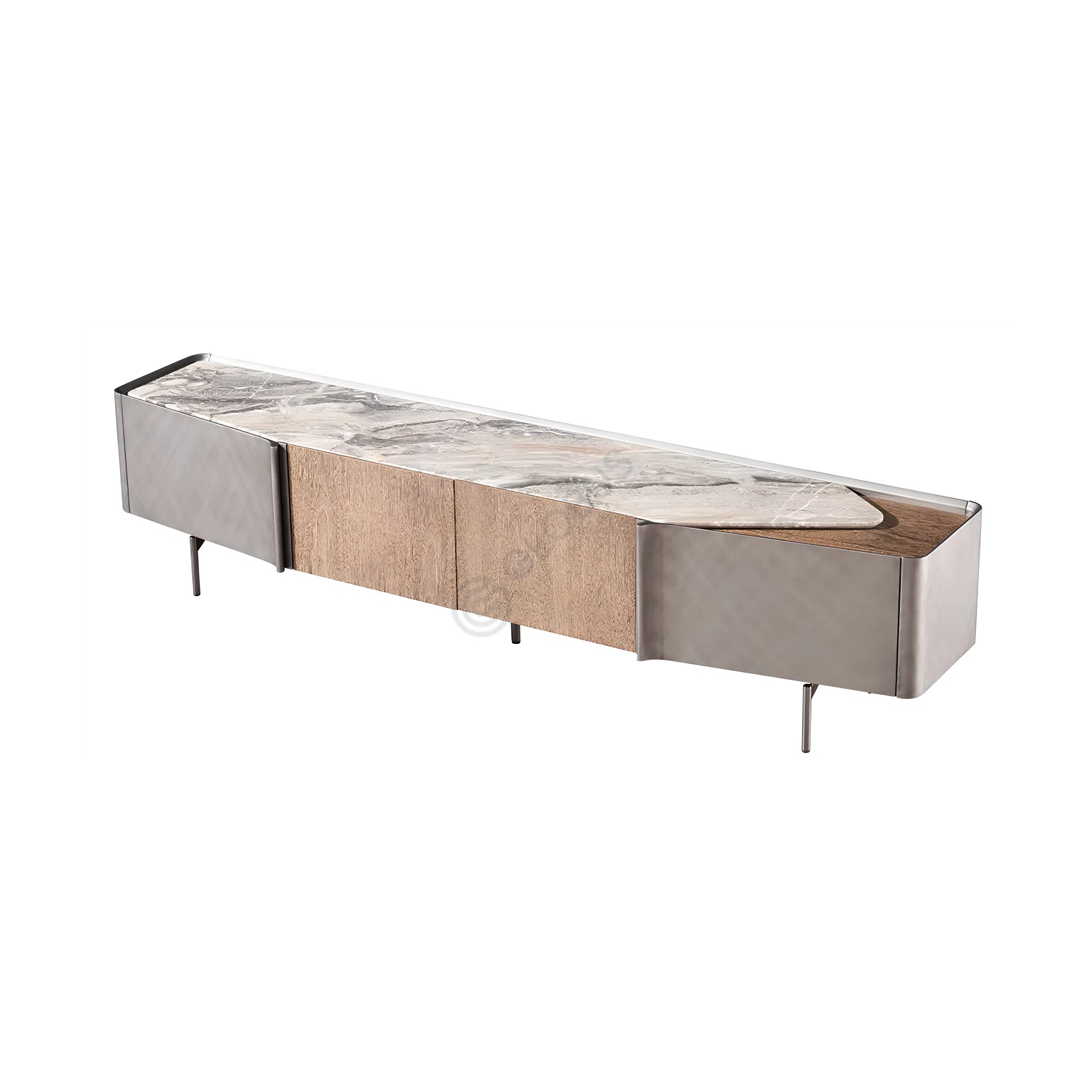 Корпус этого изделия искусно выполнен из прочной фанеры и покрыт изысканным шпоном, придающим поверхности характерную, едва уловимую фактуру. Тщательно обработанные закругленные края обеспечивают приятные тактильные ощущения и визуальную мягкость, подчеркивая мастерство исполнения. Каждая деталь – от деликатных линий фасада до тонких, точеных ножек из нержавеющей стали – подчеркивает безупречное качество и приверженность минималистичному дизайну.