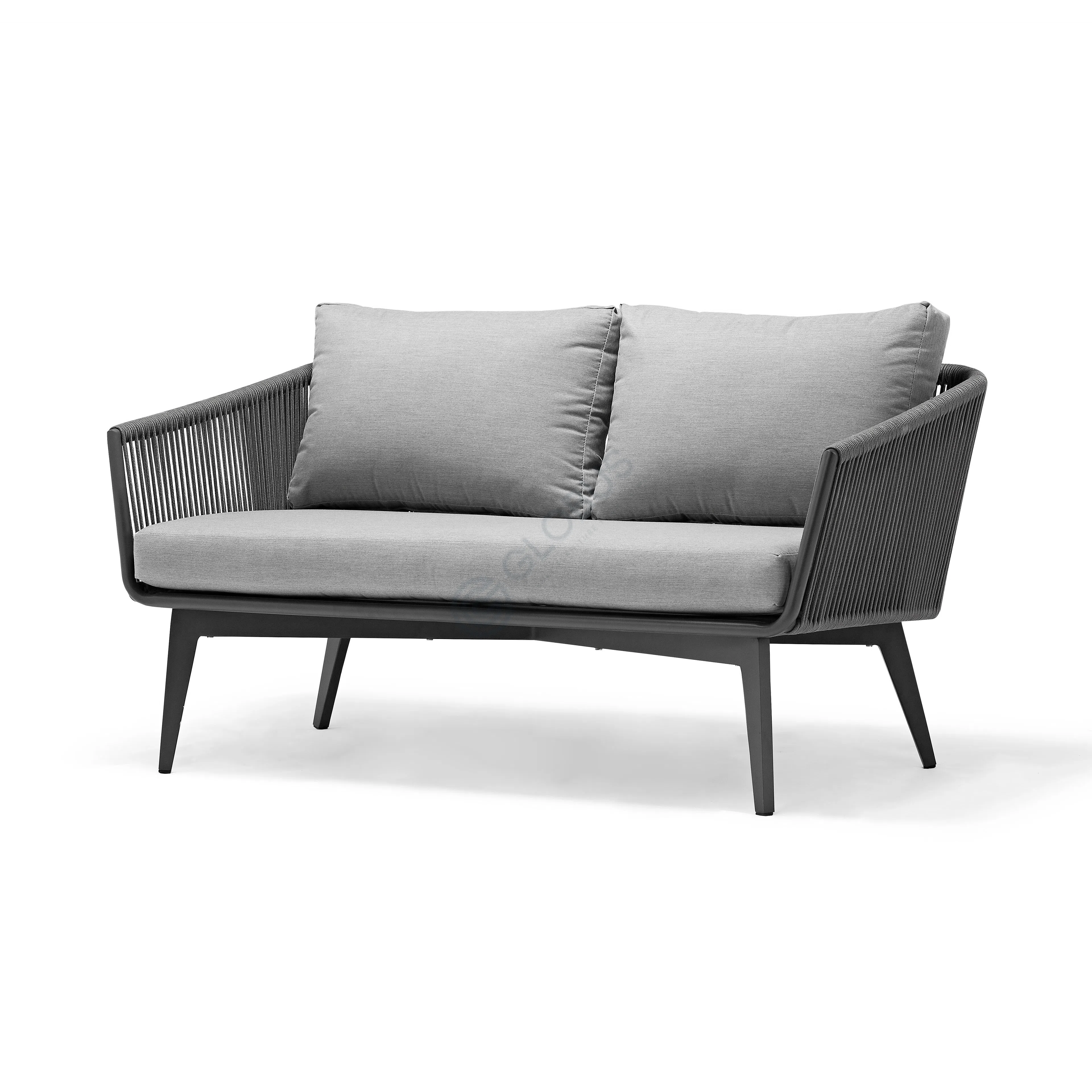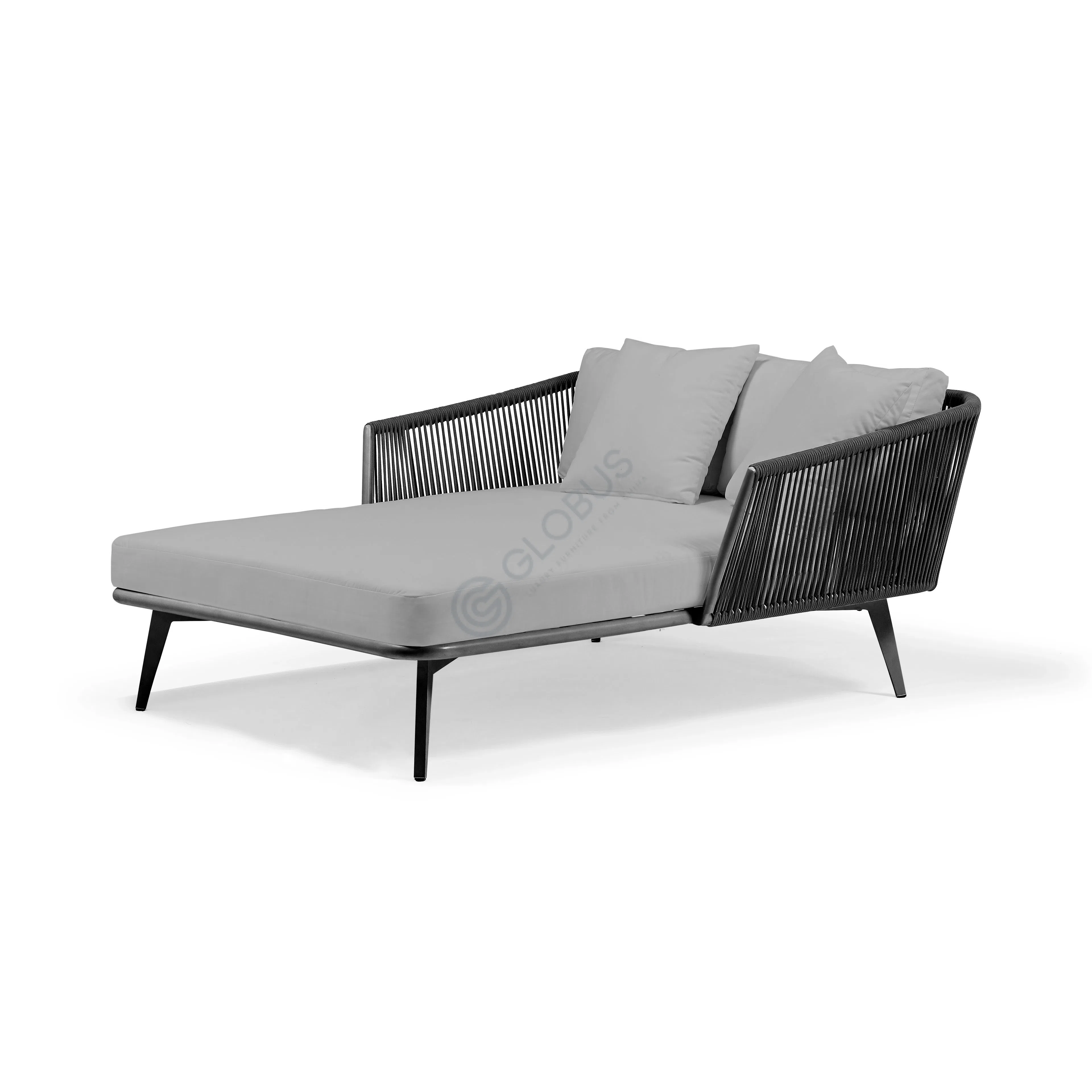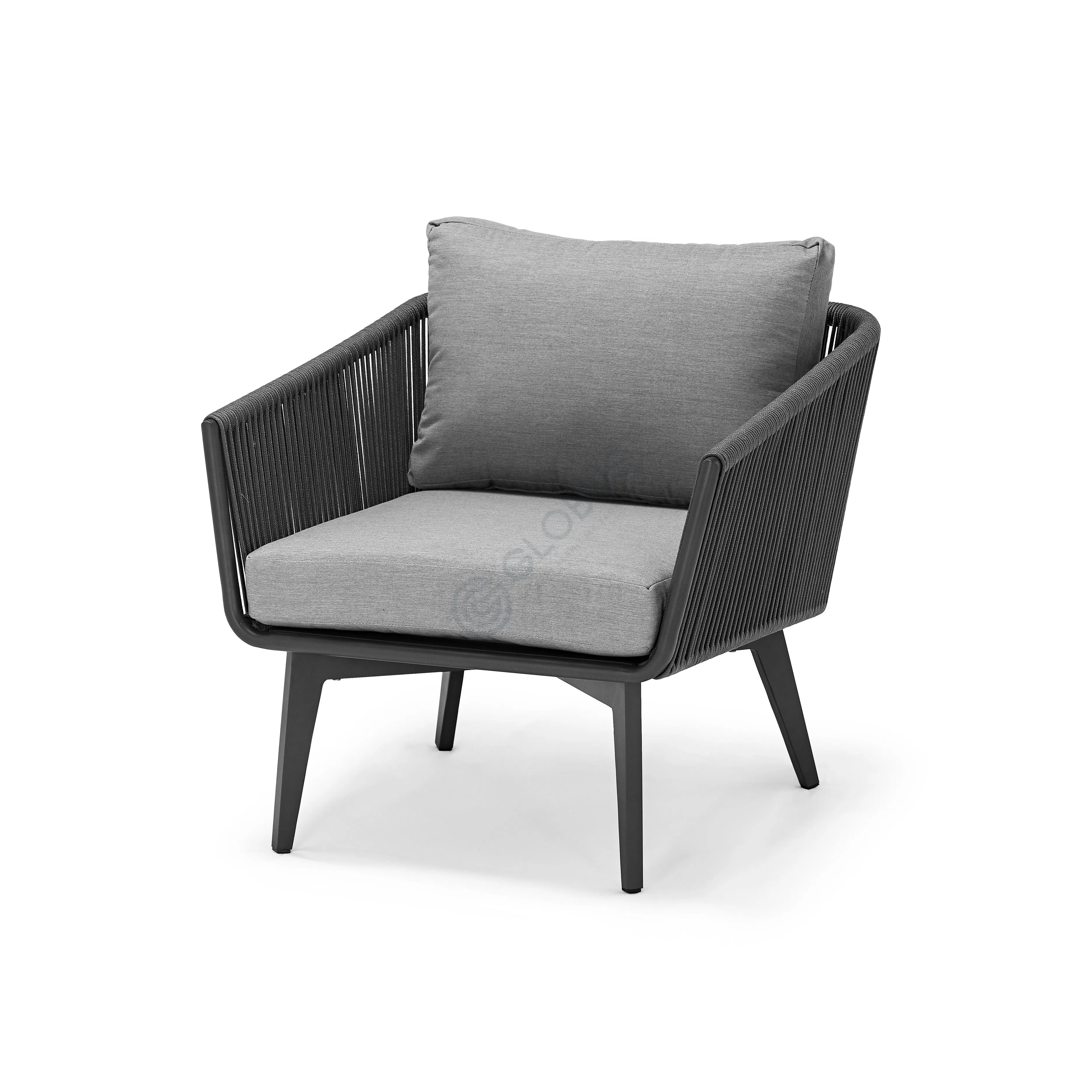 Конструкция изделия выполнена из прочного алюминия и железа, обеспечивая надежность и долговечность. Сиденье и спинка украшены элегантным плетением из веревки, добавляющим фактурности и изящества. Мягкие подушки из качественного текстиля предлагают исключительный уют.