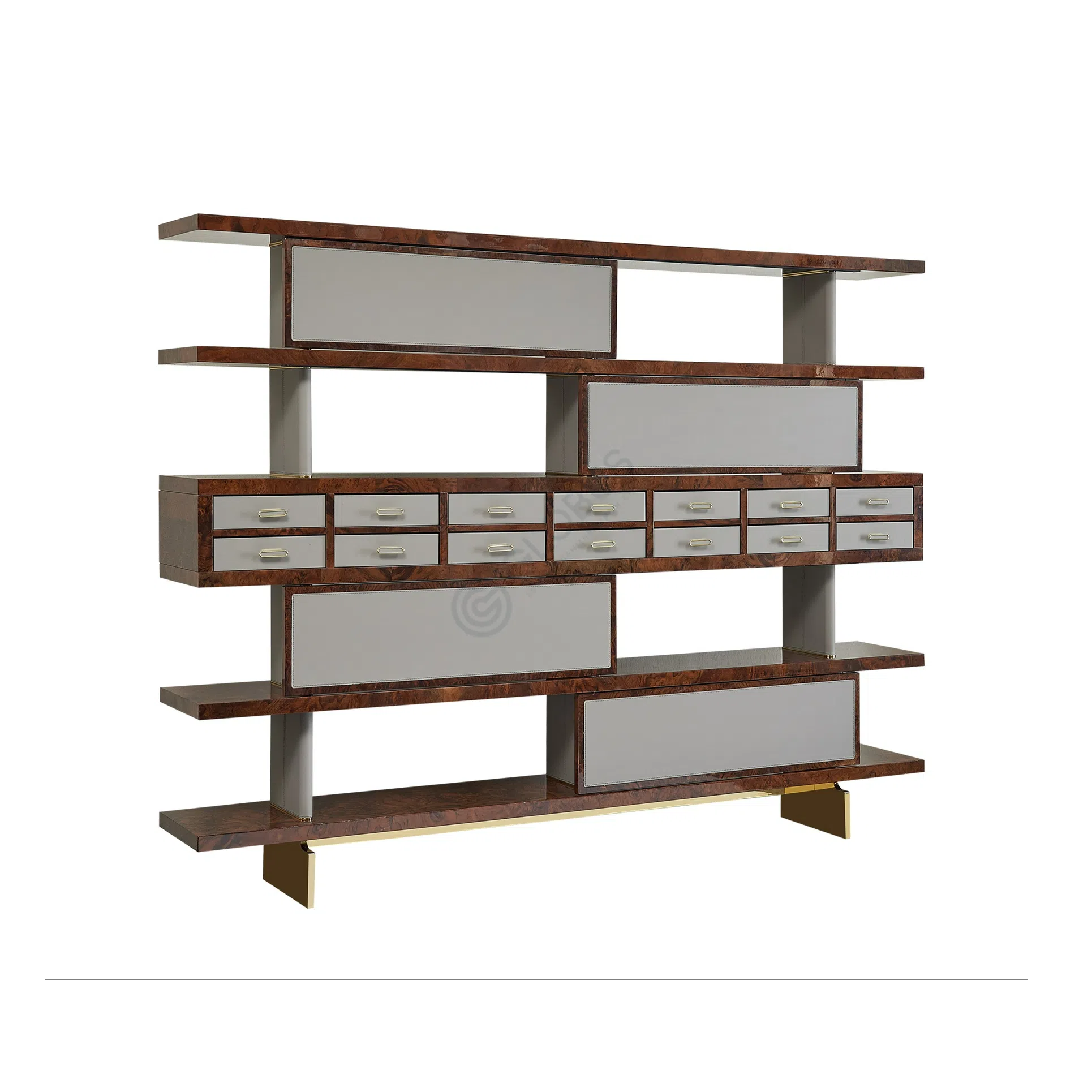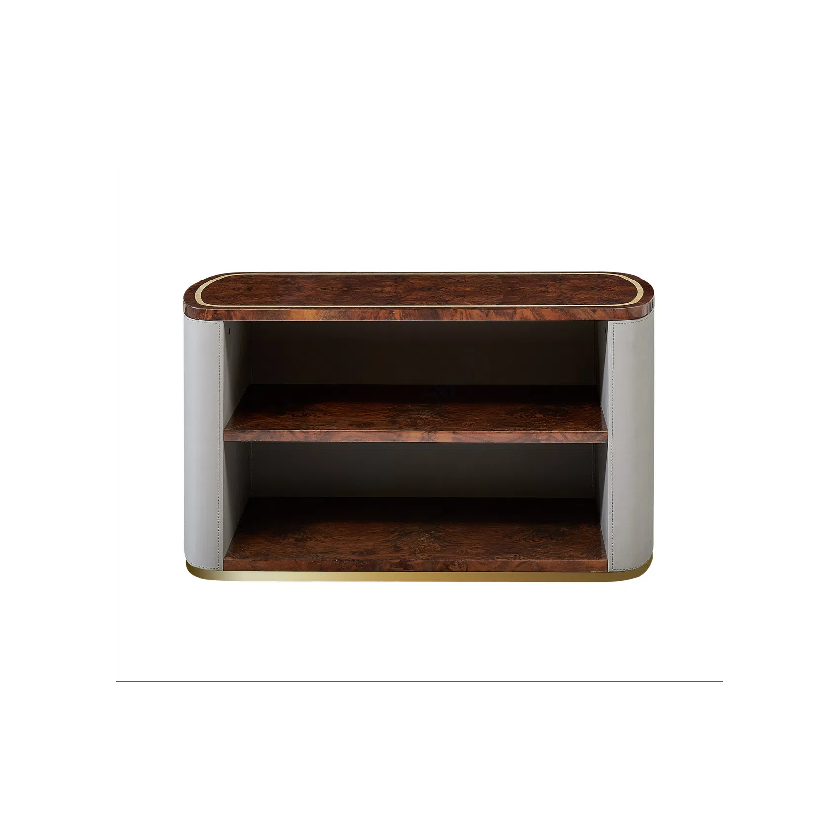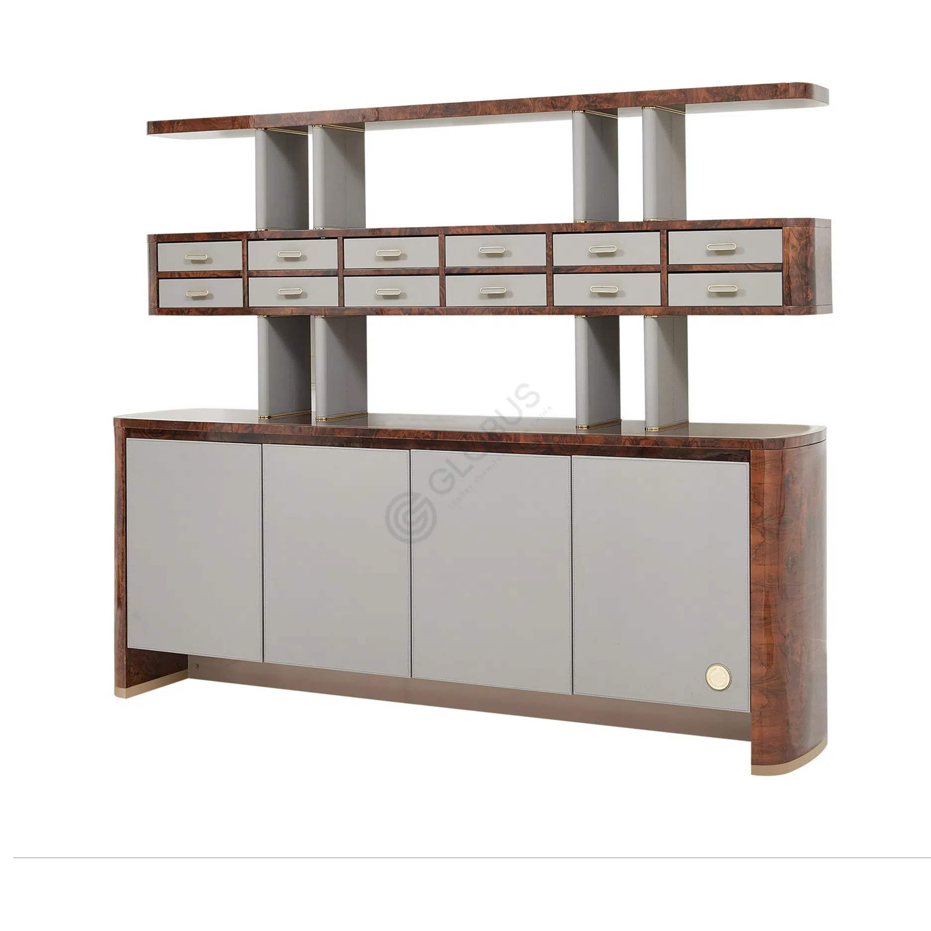 Столешница этого предмета мебели покрыта великолепным шпоном, который демонстрирует изысканную текстуру природного дерева, создавая теплую и привлекательную поверхность. В центральной части столешницы интегрирована вставка из натурального камня, предлагающая идеальное место для чайных принадлежностей и добавляющая контрастный тактильный и визуальный акцент.