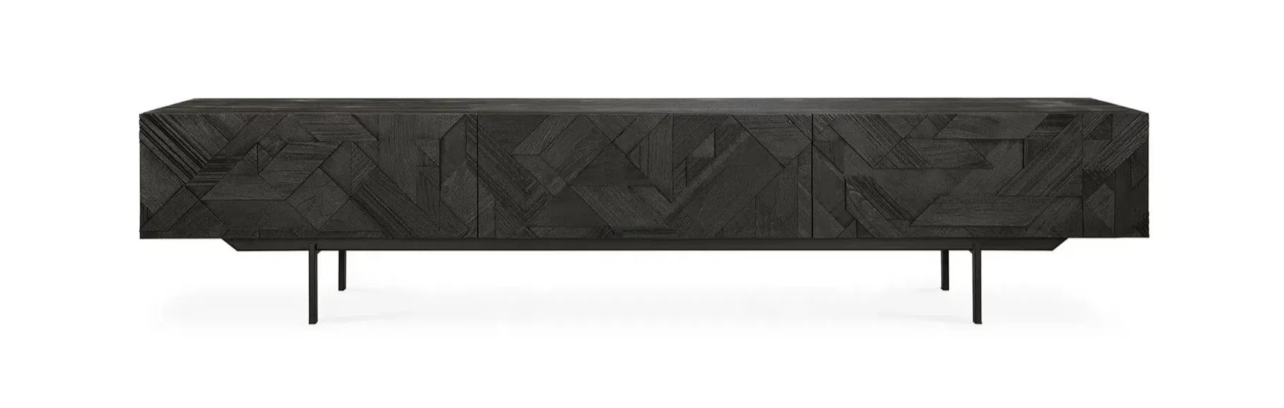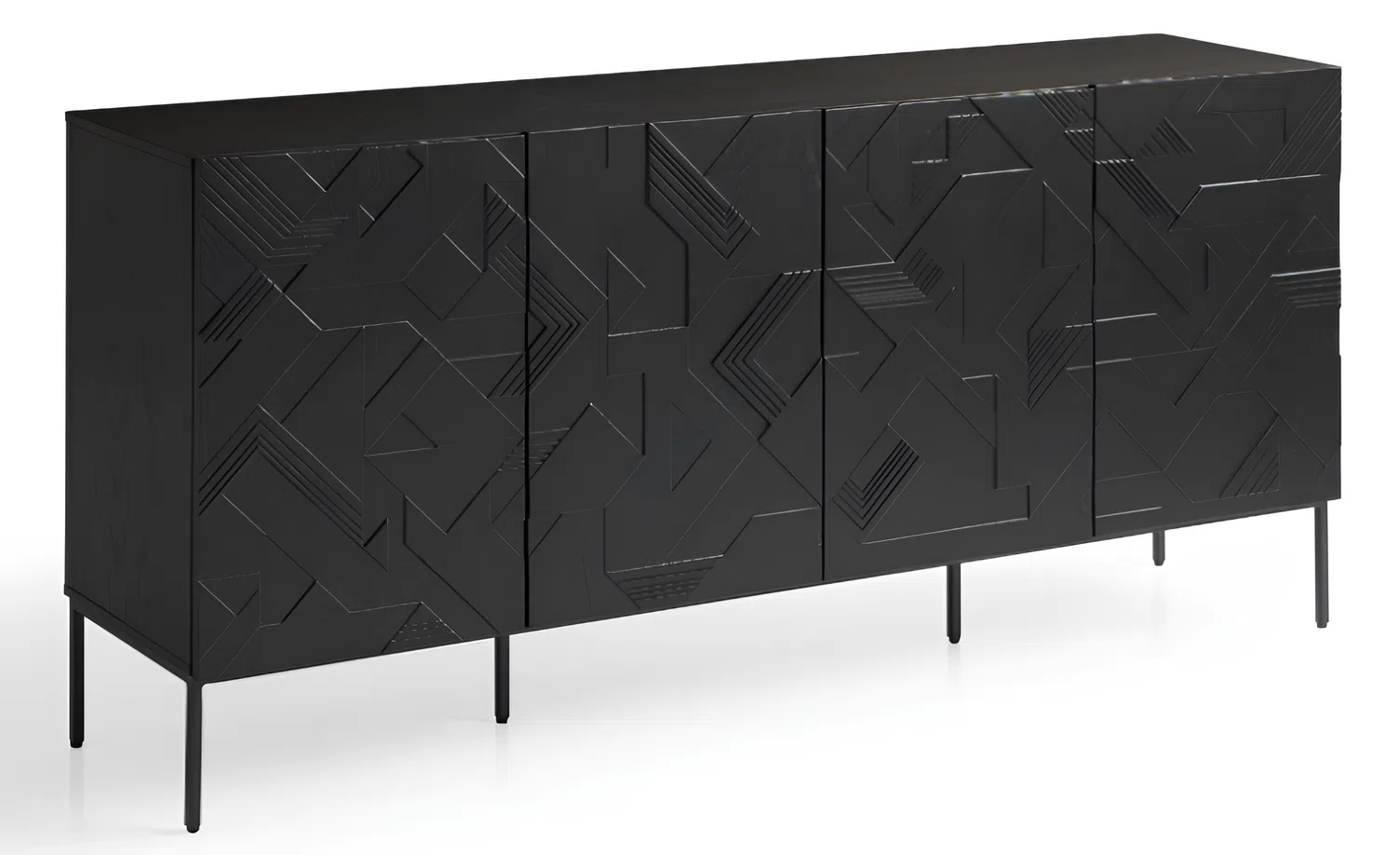 Этот комод сразу привлекает взгляд своим выразительным фасадом. Его поверхность украшает уникальный геометрический узор, вырезанный на темном дереве, который создает завораживающую игру света и тени, придавая предмету особую глубину.