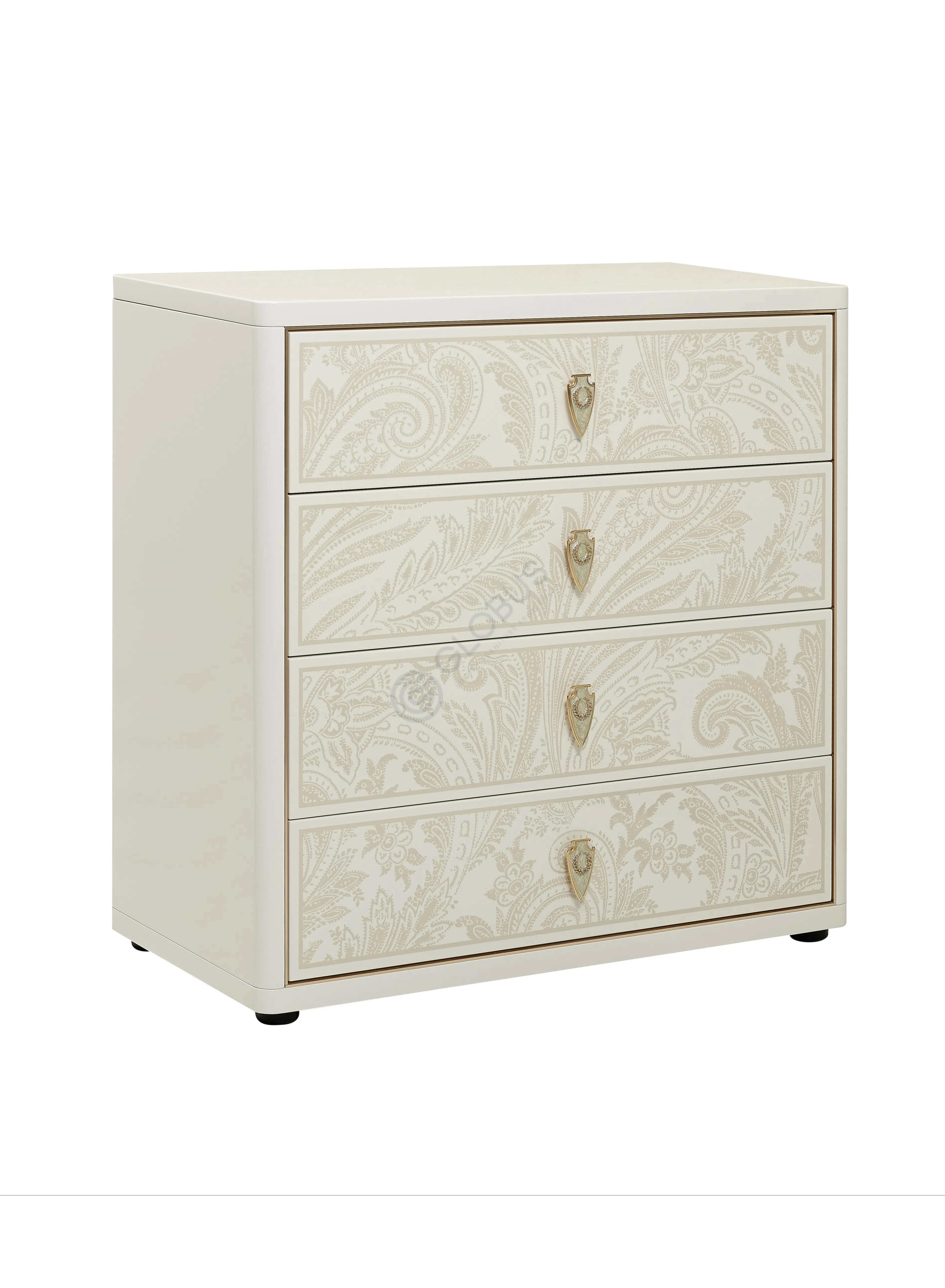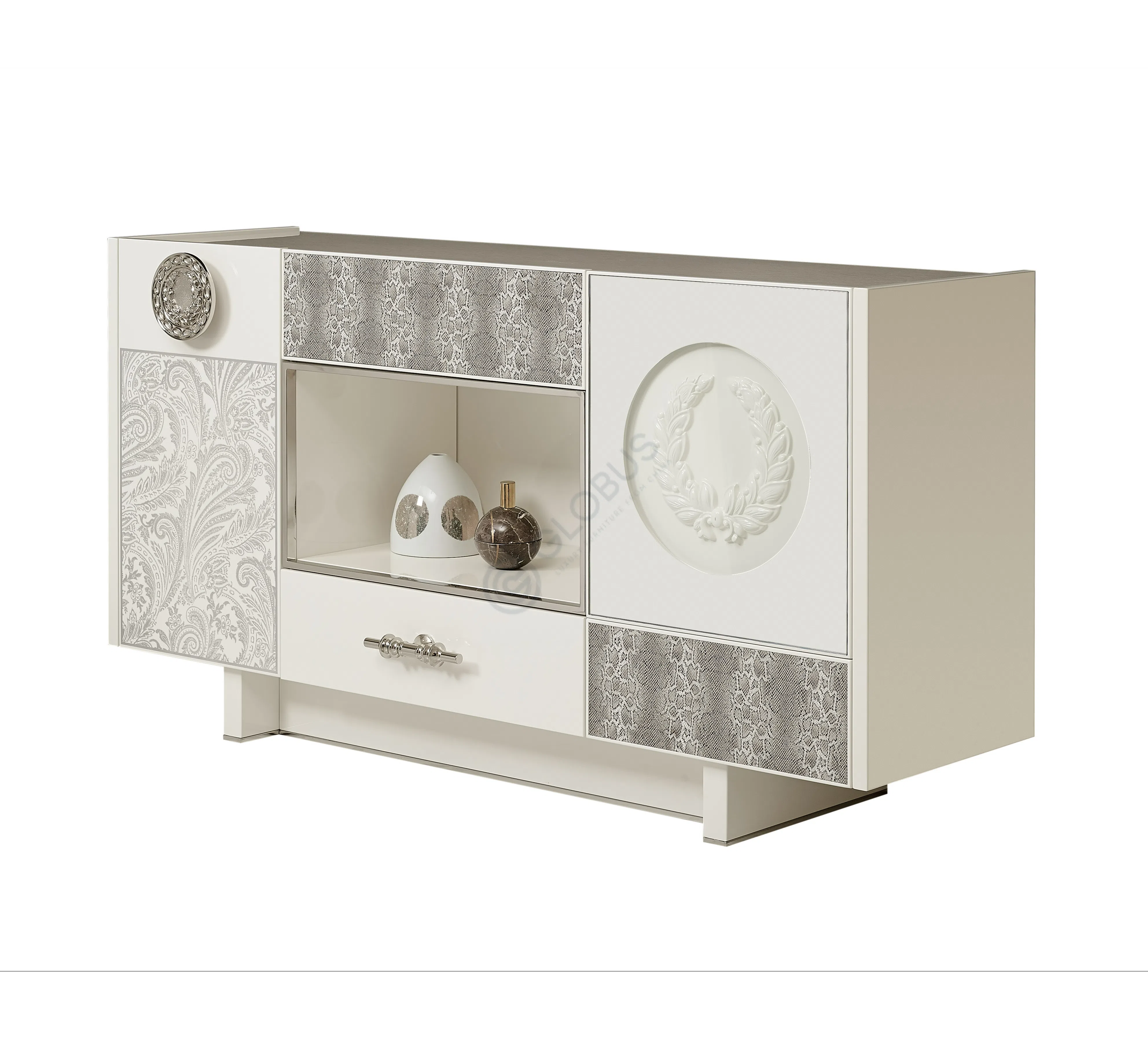 Дизайн продуман до мелочей: вместительные отделения для хранения дополняются открытой нишей и выдвижным ящиком, предлагая удобное размещение медиаоборудования и аксессуаров. Декоративные элементы, такие как изящные ручки и уникальная круглая деталь на дверце, добавляют индивидуальности и подчеркивают высокий статус изделия. Каждая линия и каждый акцент свидетельствуют о безупречном вкусе.