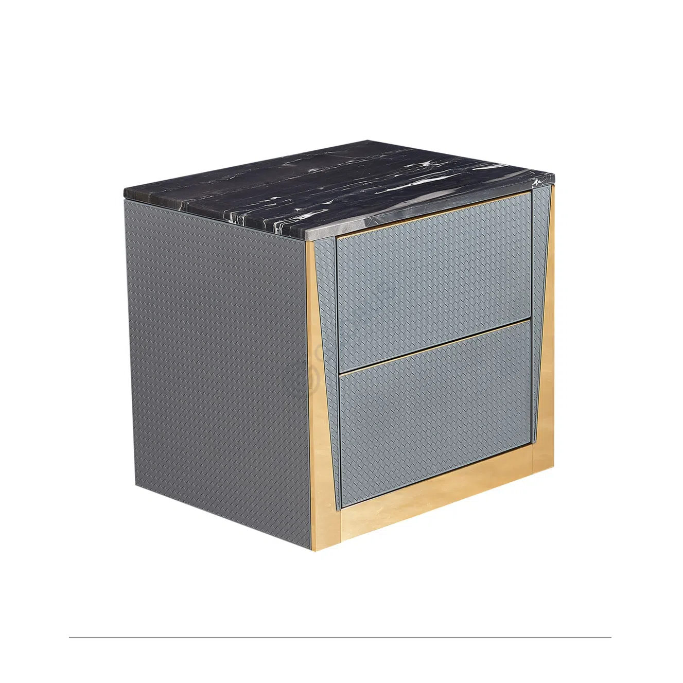 Верхняя часть тумбы выполнена из натурального мрамора, чей уникальный узор придает каждому изделию неповторимый облик. Гладкая полированная поверхность камня контрастирует с текстурным фасадом, покрытым высококачественной экокожей на микрофибровой основе, что добавляет визуальный и тактильный интерес. Основание и декоративные элементы, выполненные из нержавеющей стали, подчеркивают современную эстетику и добавляют элегантного блеска.