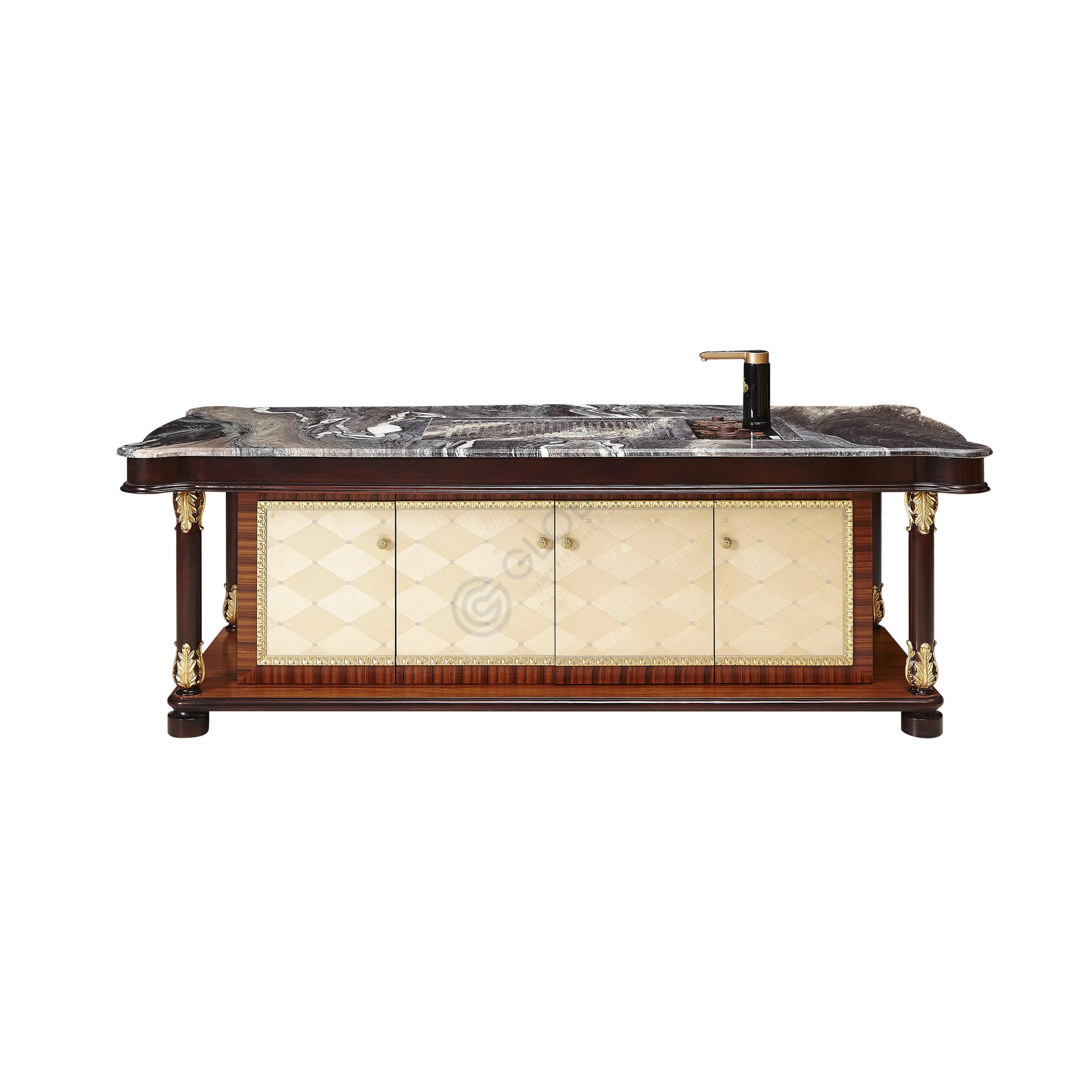 Материалы, использованные в конструкции, подчеркивают высокий статус изделия. Натуральное дерево в сочетании с искусно подобранным шпоном придает поверхности глубокий, насыщенный оттенок и уникальную текстуру. Применение патины добавляет винтажной благородности, выделяя детали и придавая шкафу вид антикварной реликвии с историей. Элементы из фанеры обеспечивают прочность и долговечность конструкции.