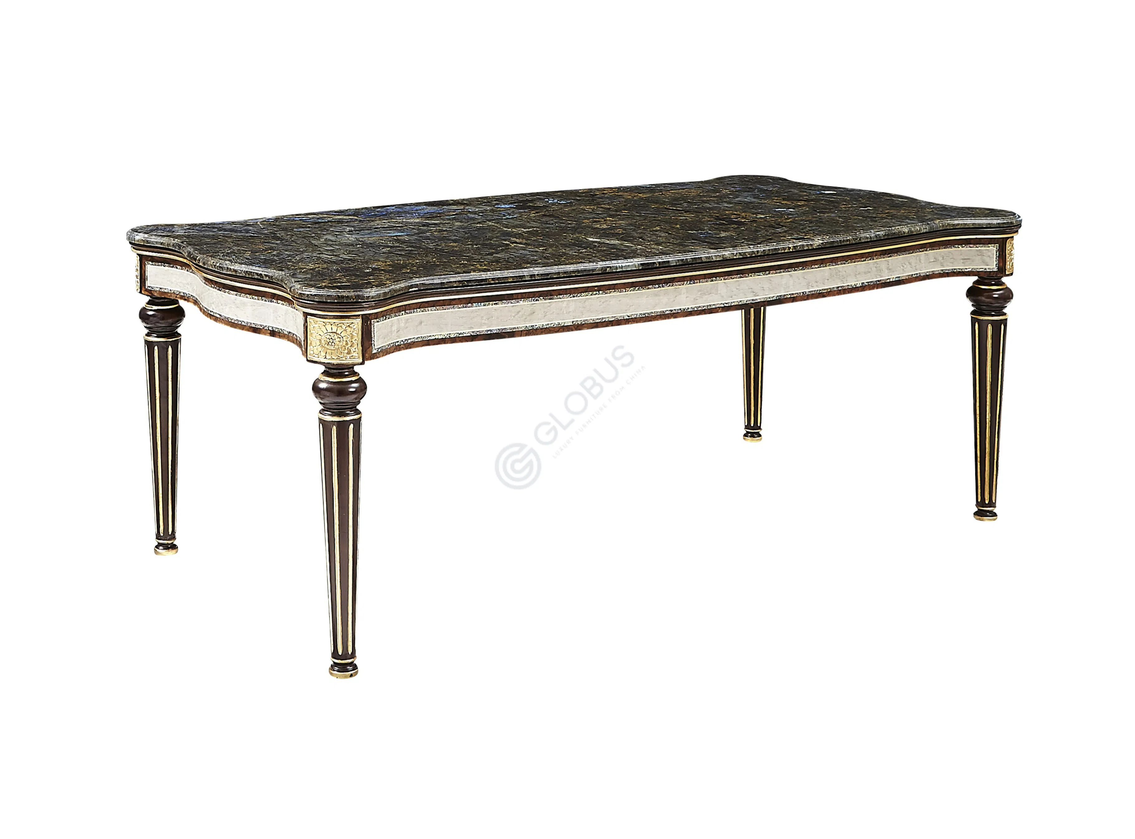 Изготовленная из натурального дерева и фанеры, тумба покрыта благородным шпоном, демонстрирующим красоту древесной текстуры. Ее столешница выполнена из природного мрамора, чей уникальный узор придает каждому изделию неповторимость. Деликатная патина подчеркивает утонченные детали отделки, создавая ощущение антикварной ценности.