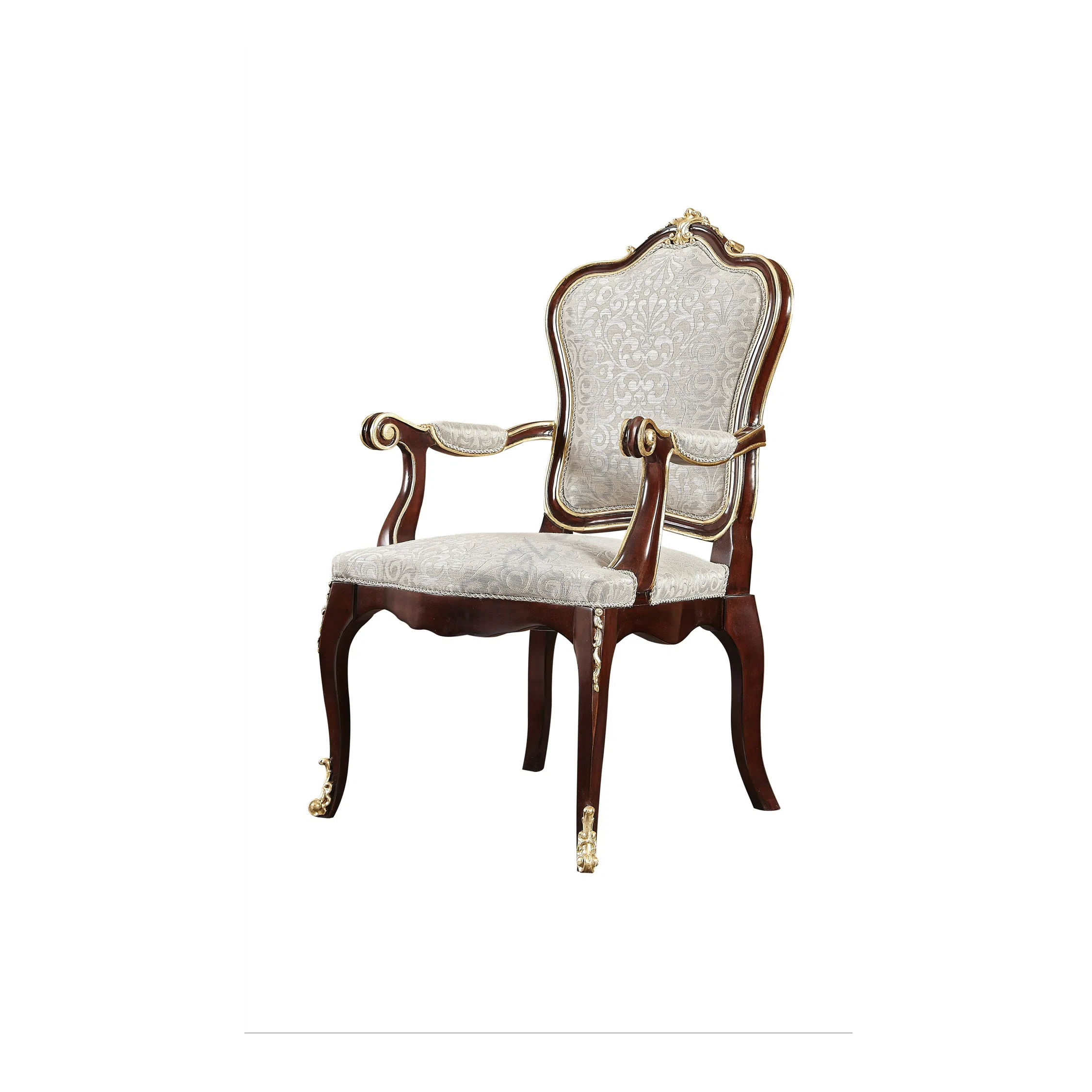 Особое внимание уделено декоративным элементам. Грациозно изогнутые ножки стула и верхний край спинки украшены деталями с патиной, имитирующей состаренное золото, что придает изделию особый шарм и антикварный вид. Эта отделка подчеркивает изящество форм и мастерство исполнения.