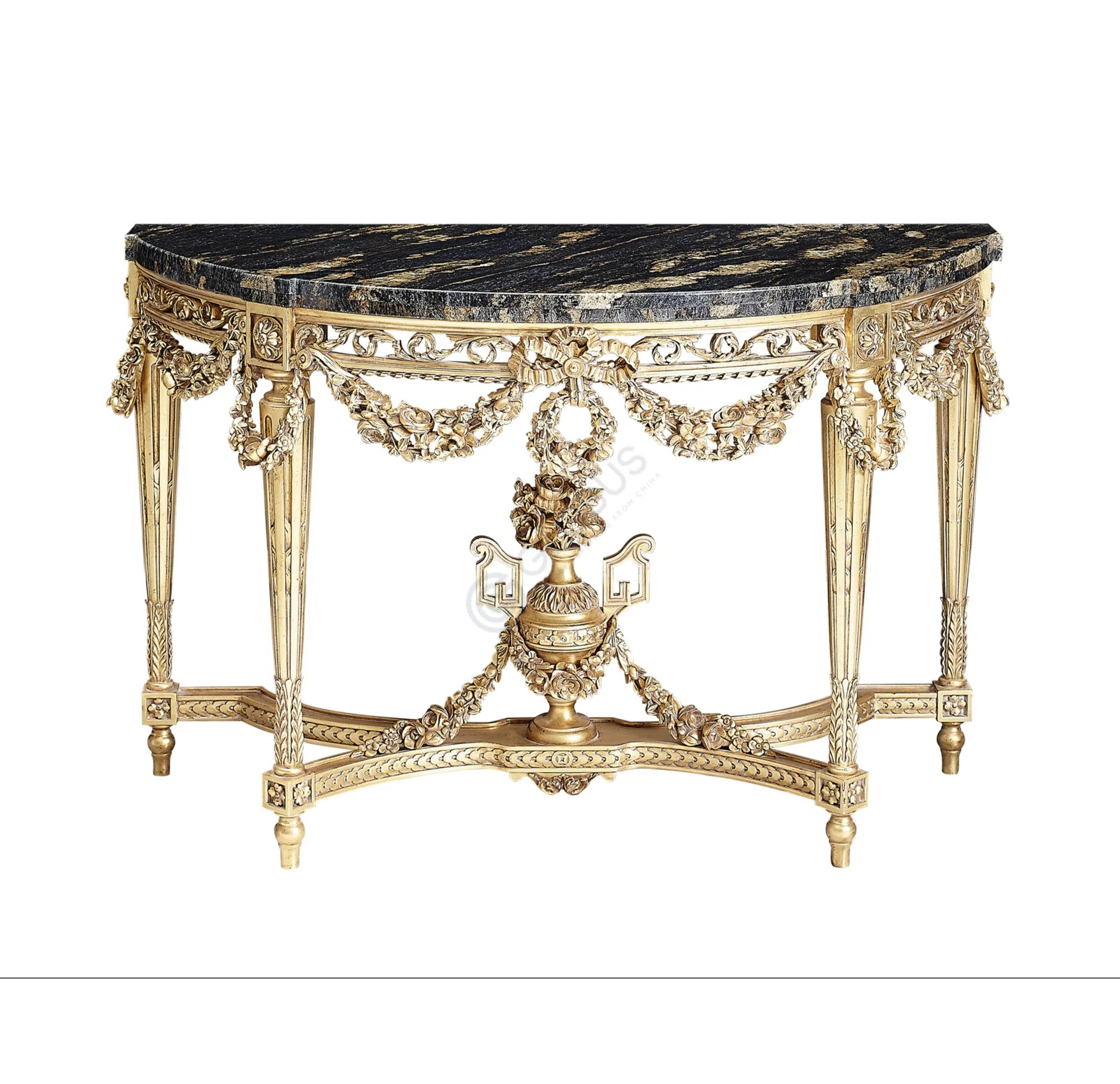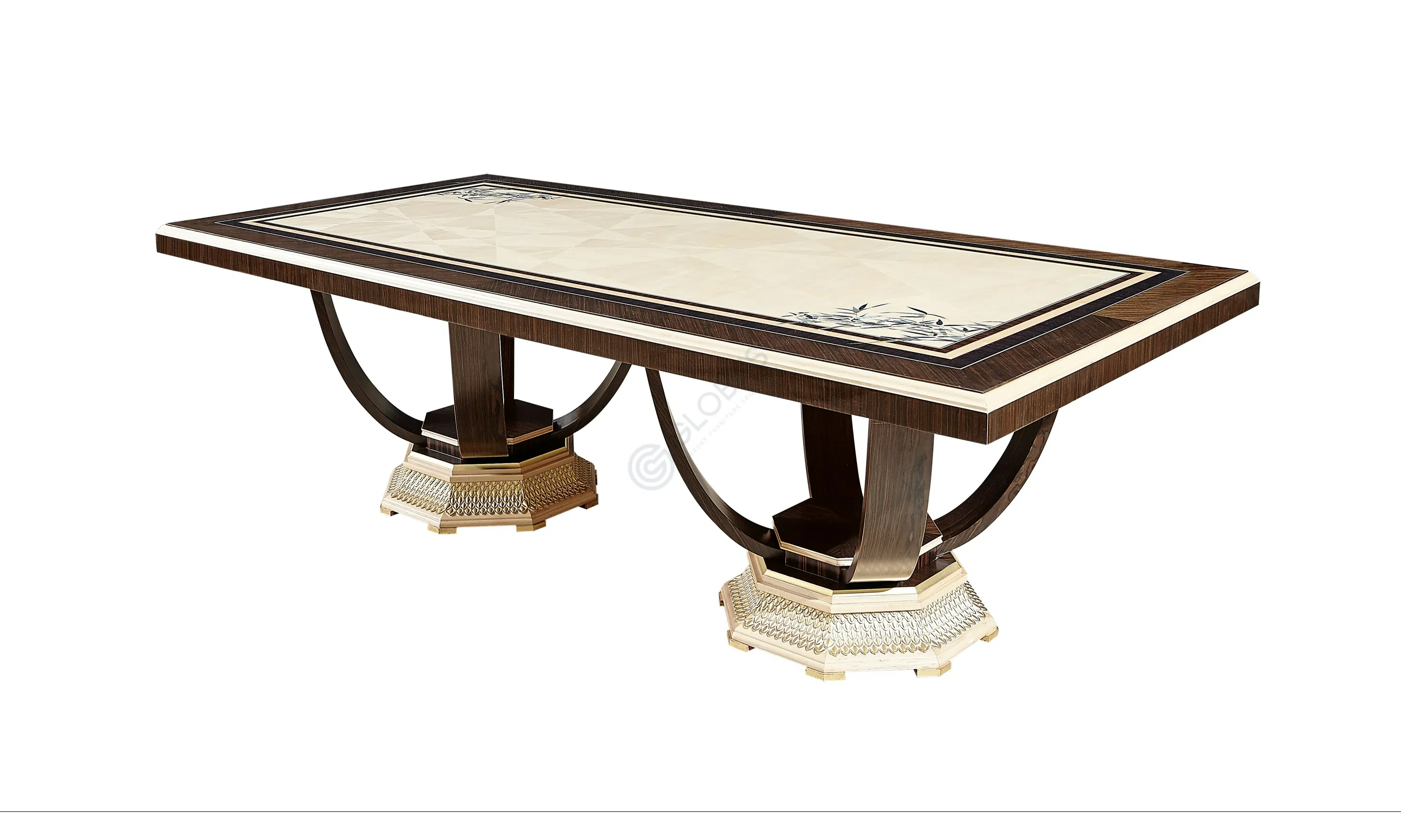 В производстве использованы натуральное дерево и шпон, что придает изделию особую текстуру и теплоту. Искусно выполненный узор маркетри на фасадах ящиков и столешнице подчеркивает высокое мастерство. Добавление металлических элементов придает конструкции прочность и служит выразительным декоративным акцентом, усиливая ощущение премиальности.