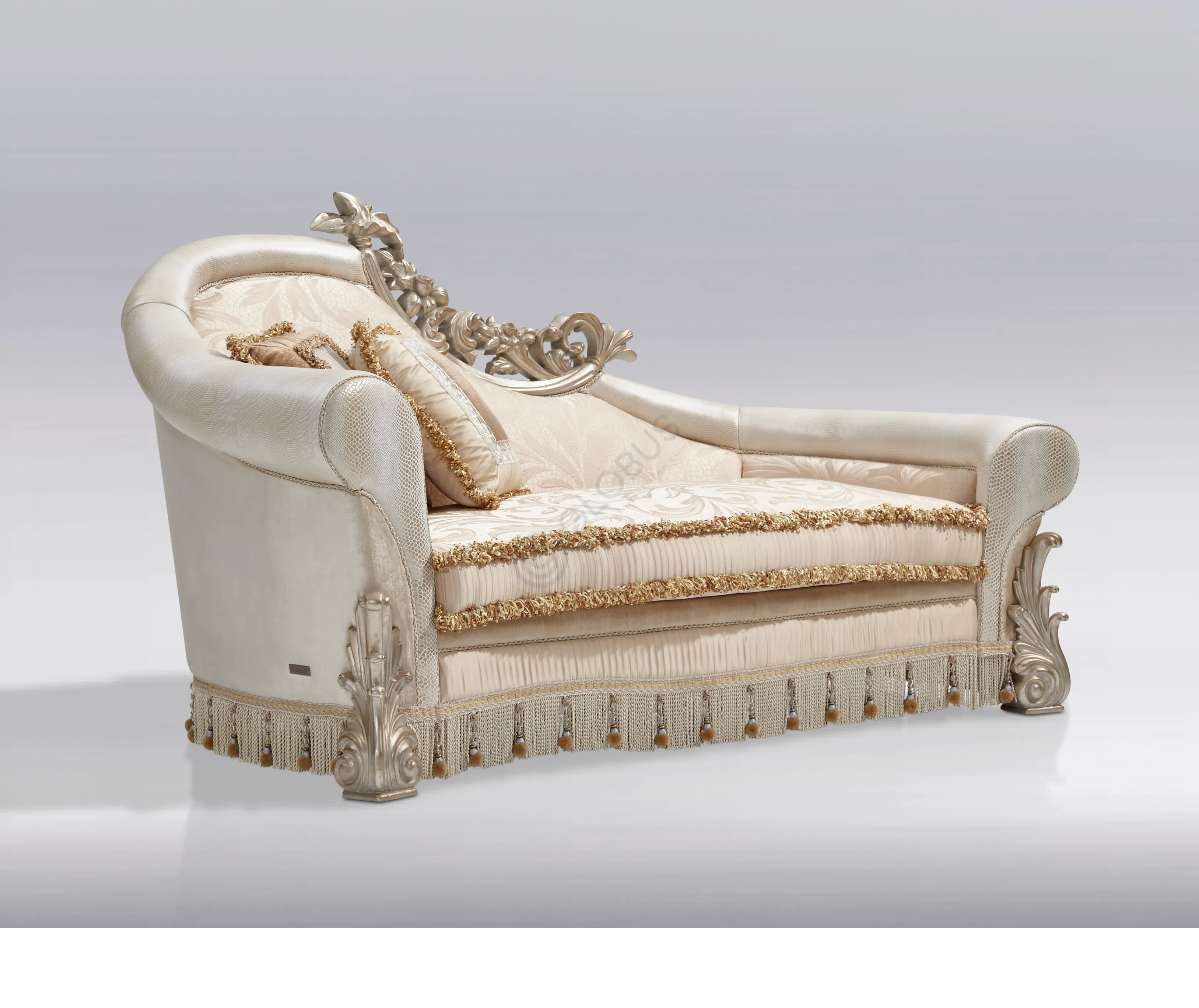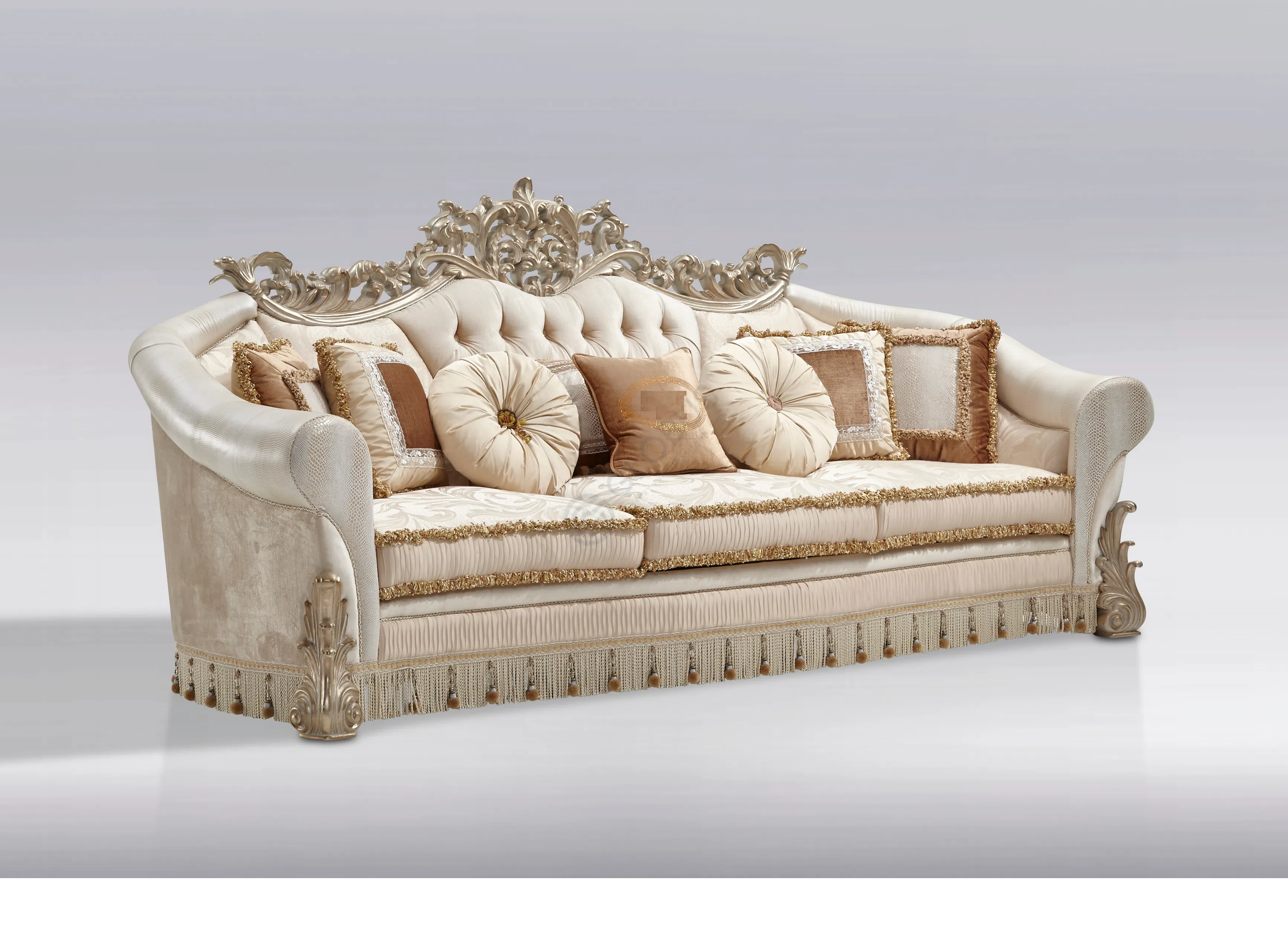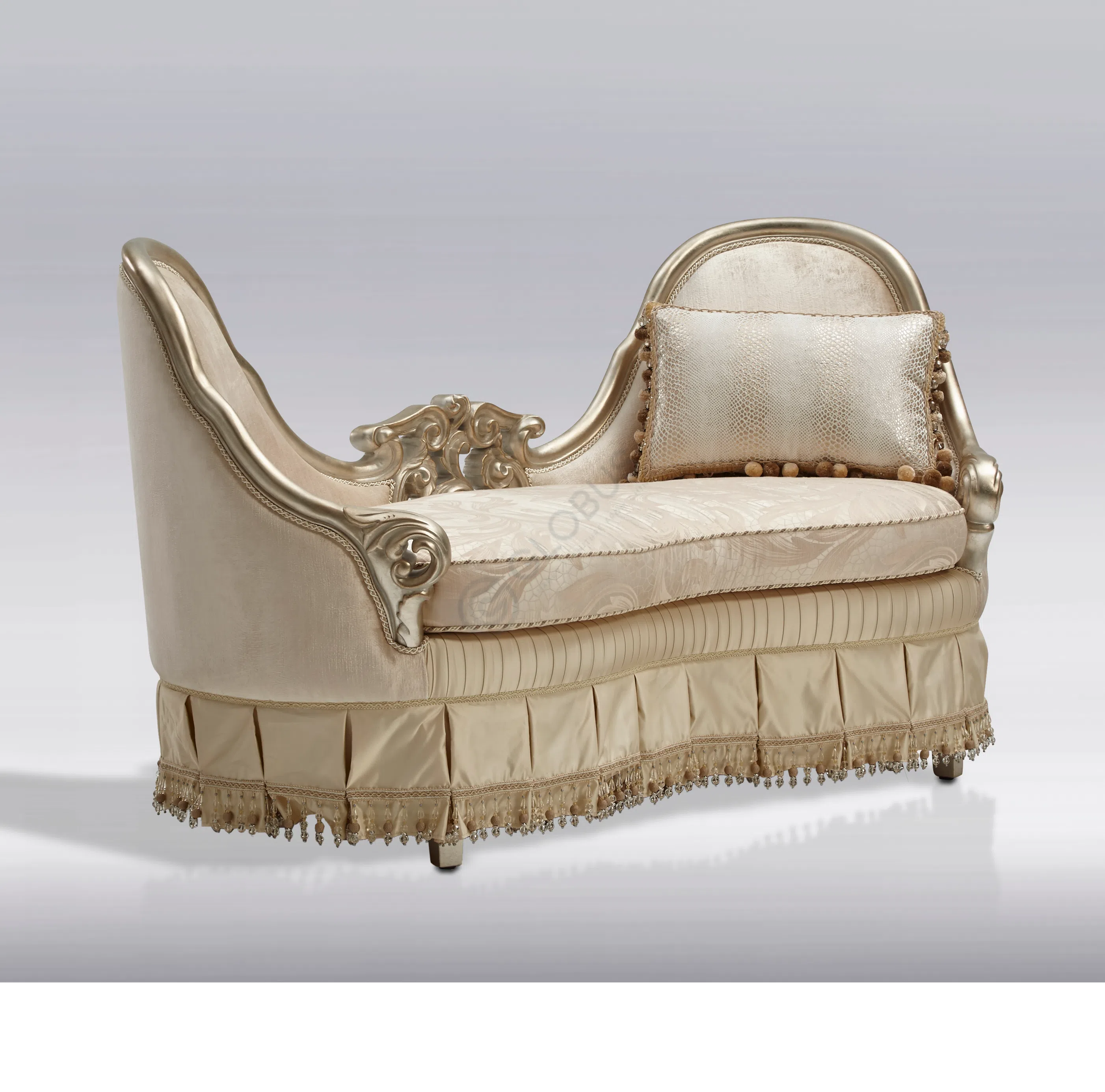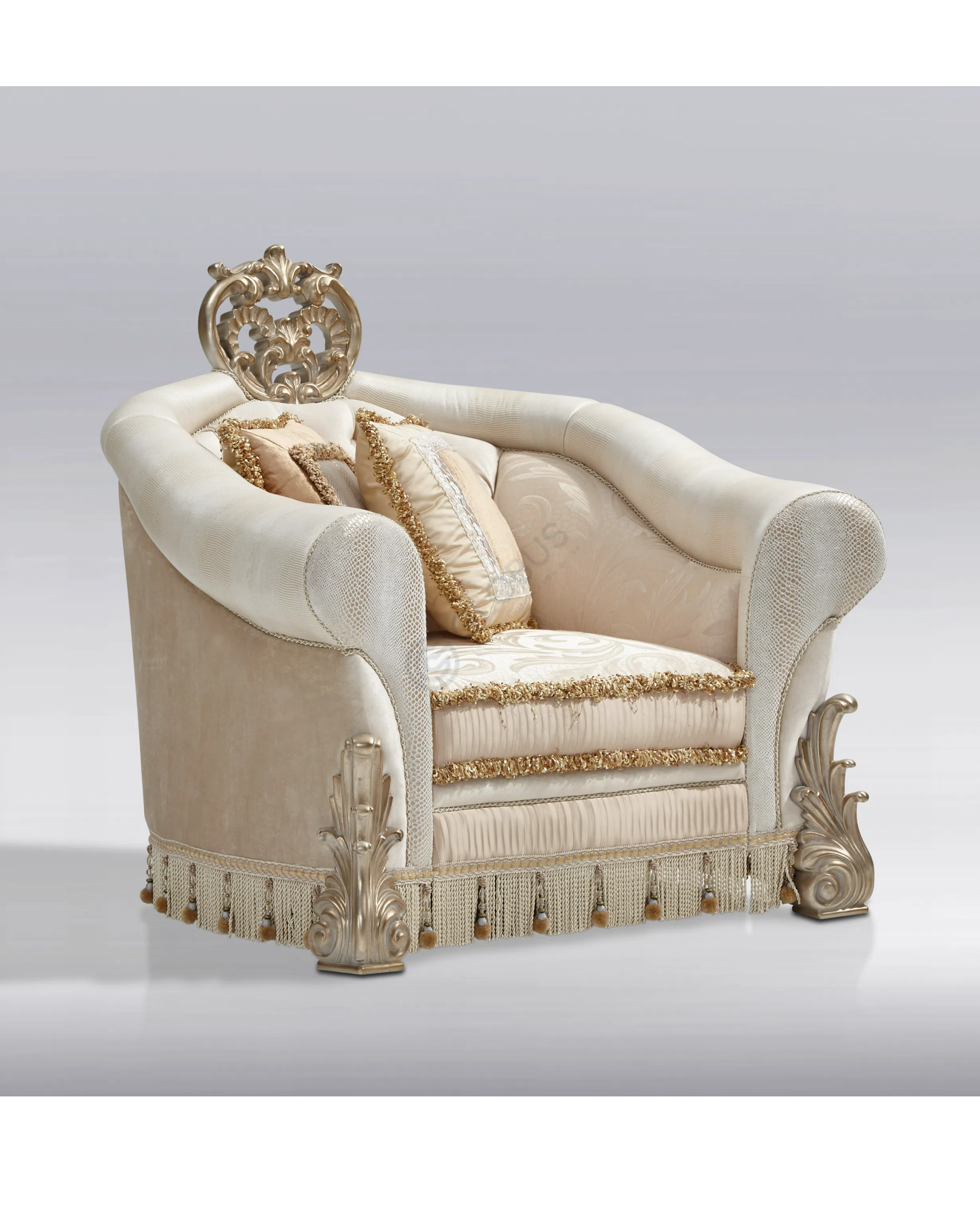 Внимание к деталям проявляется в каждой мелочи. Искусная каретная стяжка на спинке формирует объемный узор, добавляя предмету визуальной мягкости и глубины. Нижняя часть изделия скрыта пышной юбкой с деликатной бахромой, завершающей образ и придающей ему дополнительную парадность. Фигурная форма подлокотников и спинки создает гармоничный силуэт, располагающий к отдыху.
