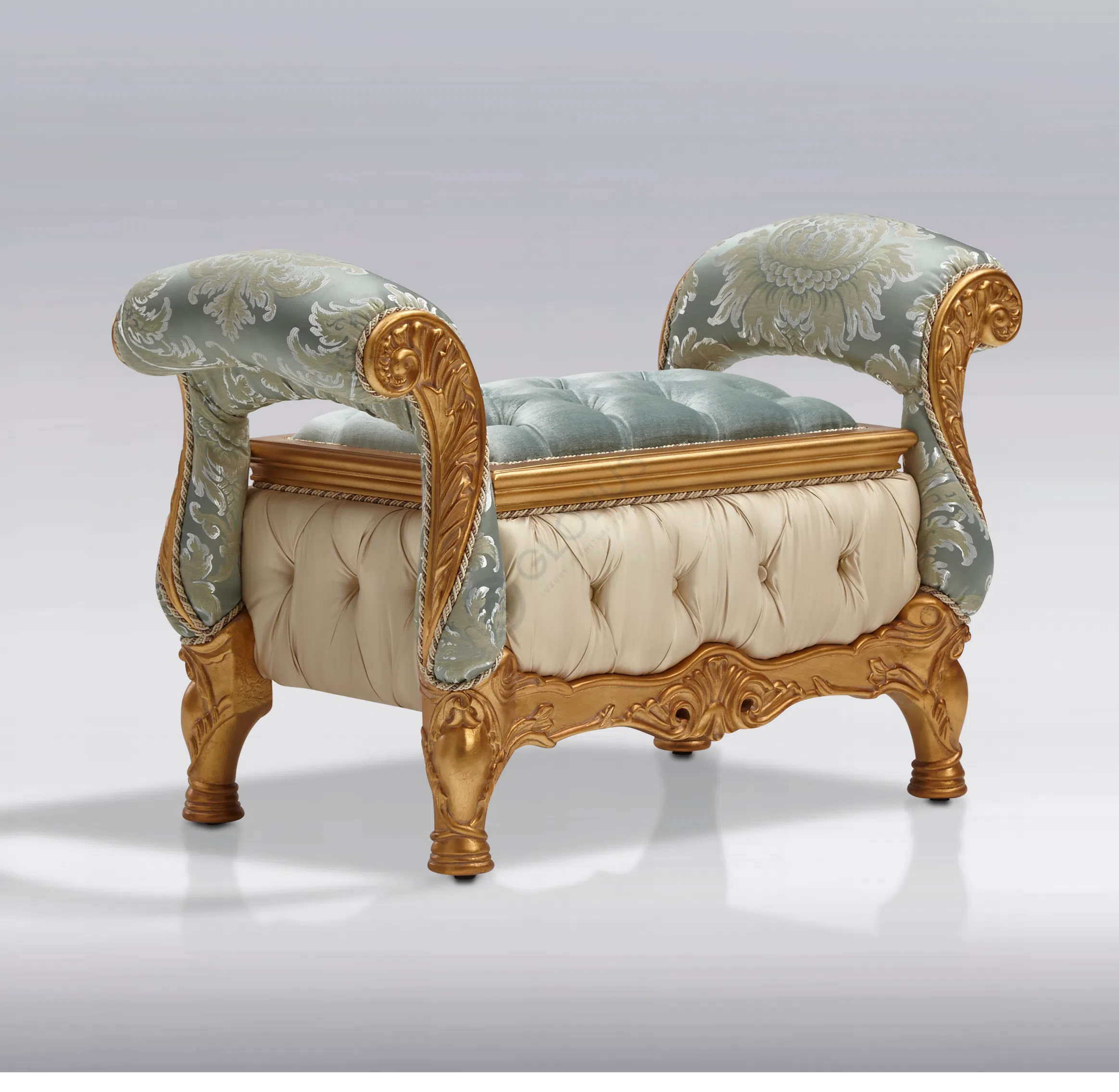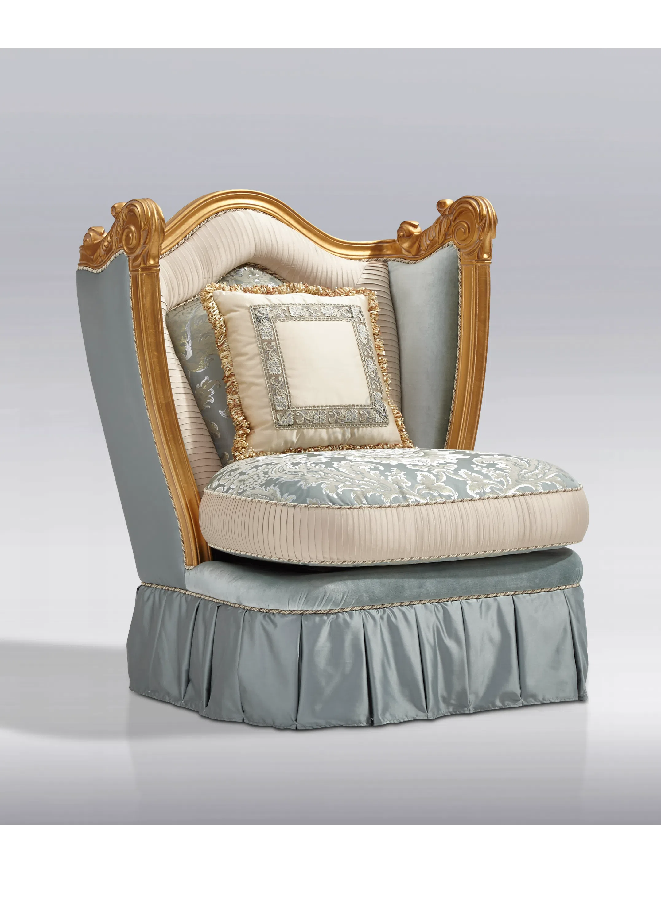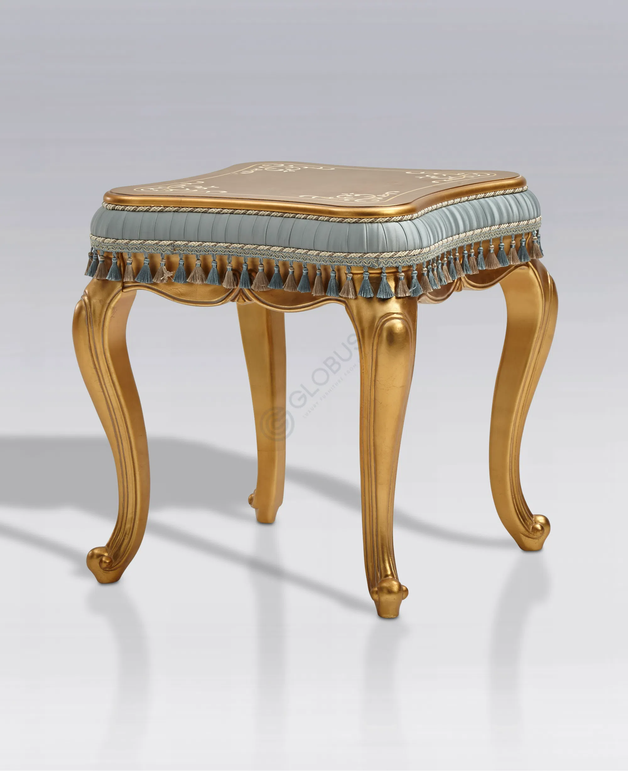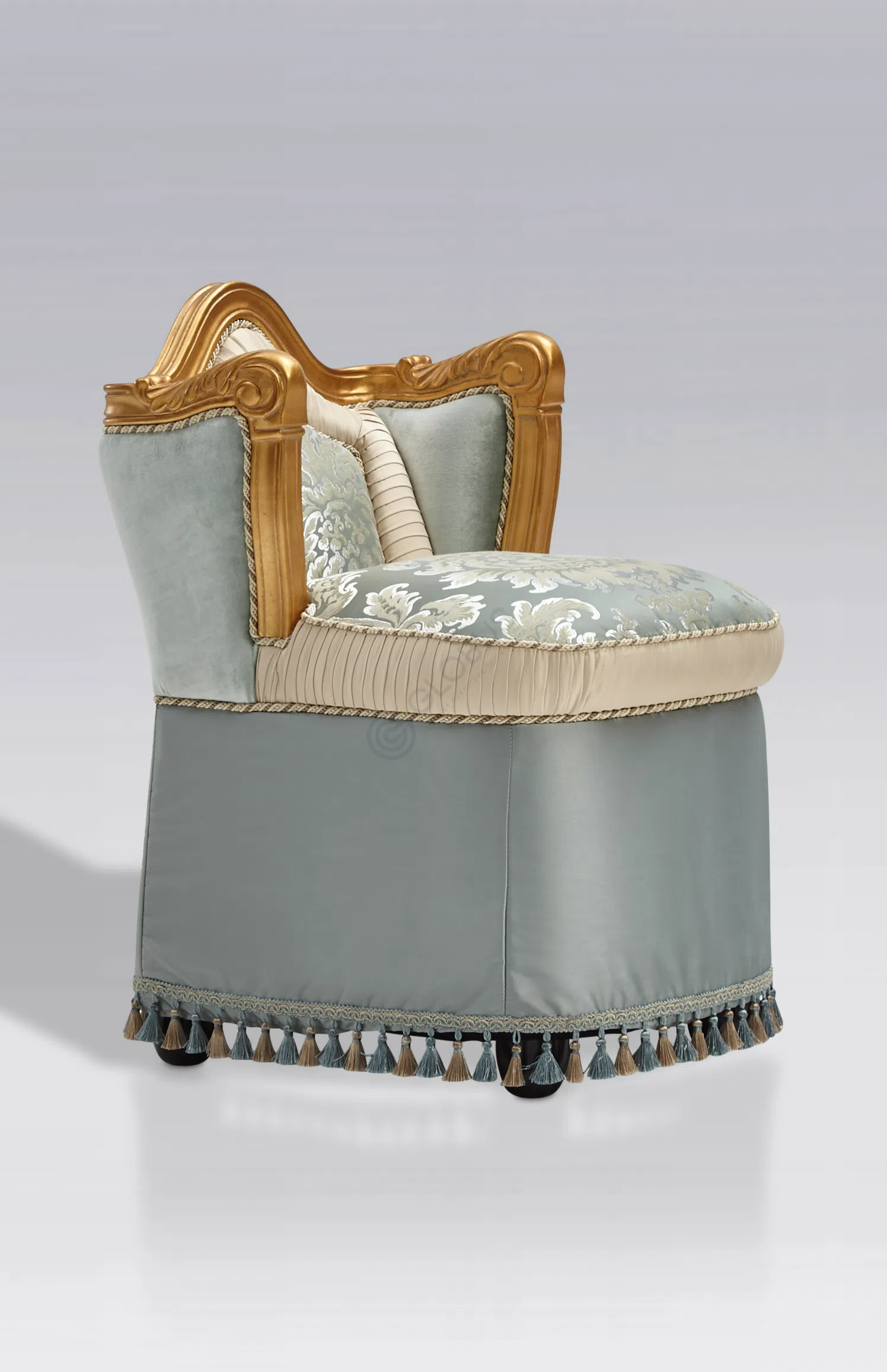 Основа стула выполнена из массива натурального дерева, что обеспечивает прочность и долговечность конструкции. Каркас дополнен обивкой из высококачественного текстиля, приятного на ощупь и визуально привлекательного. Особое внимание уделено отделке: элементы из дерева покрыты патиной, которая придает ножкам золотистый оттенок и эффект легкой старины, подчеркивая классический стиль.