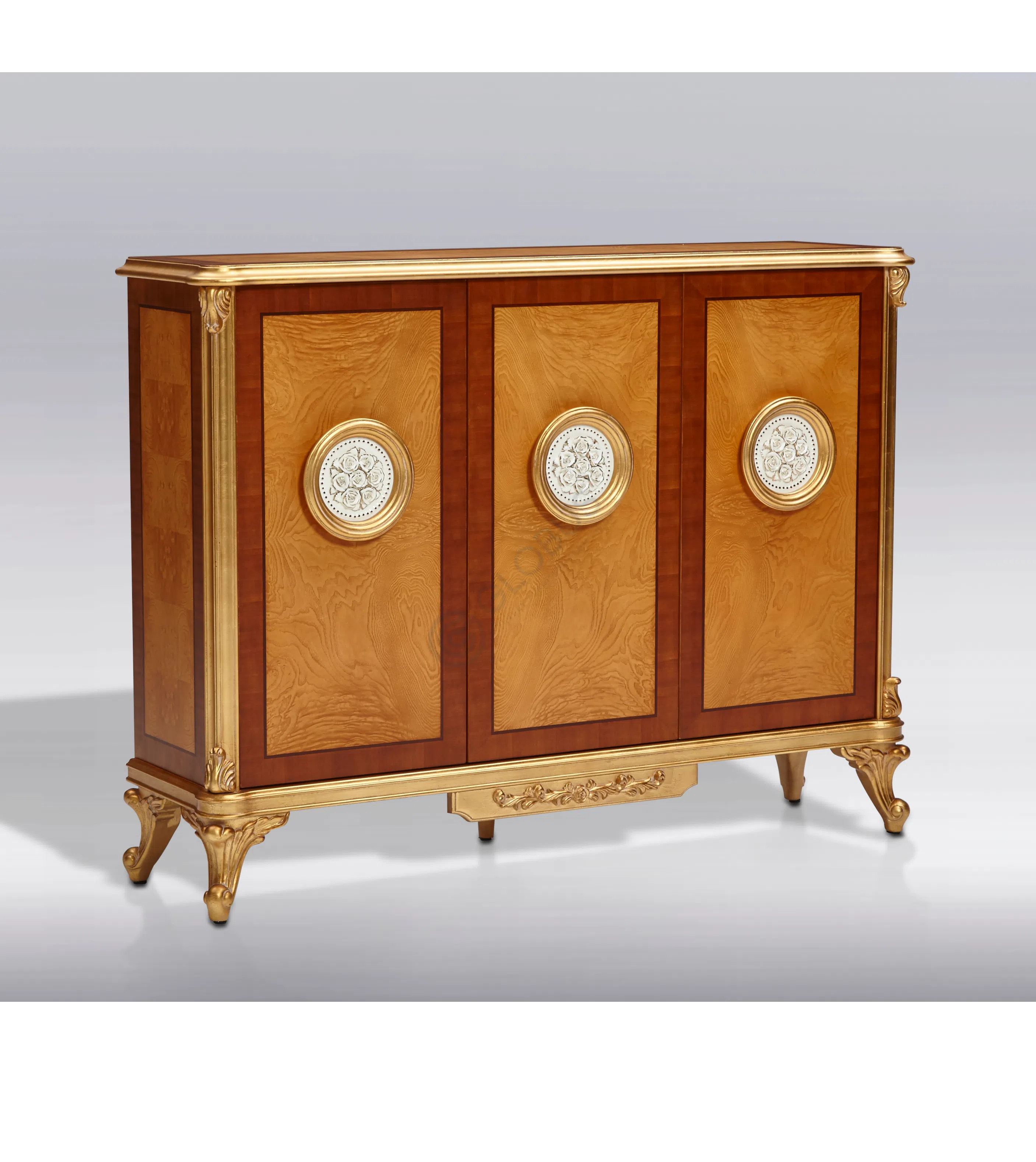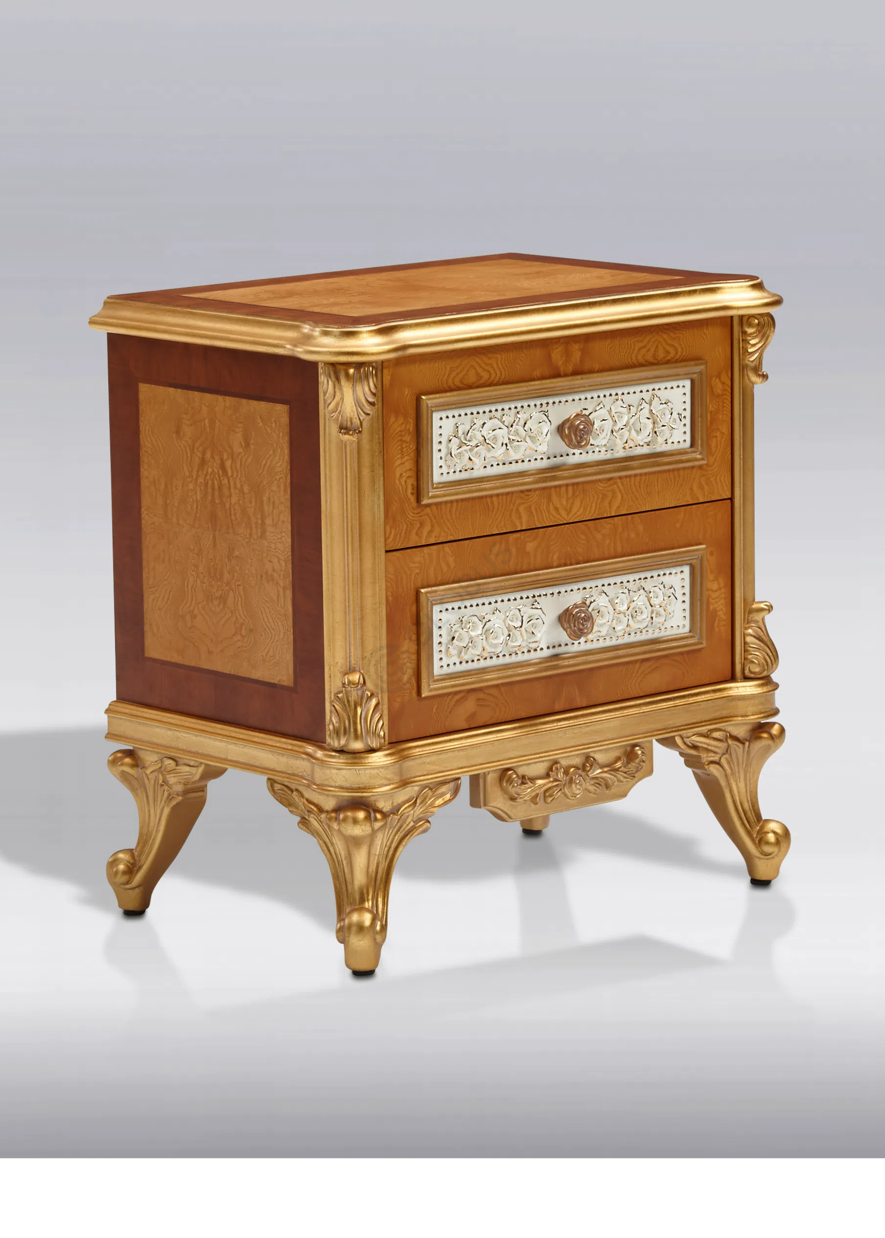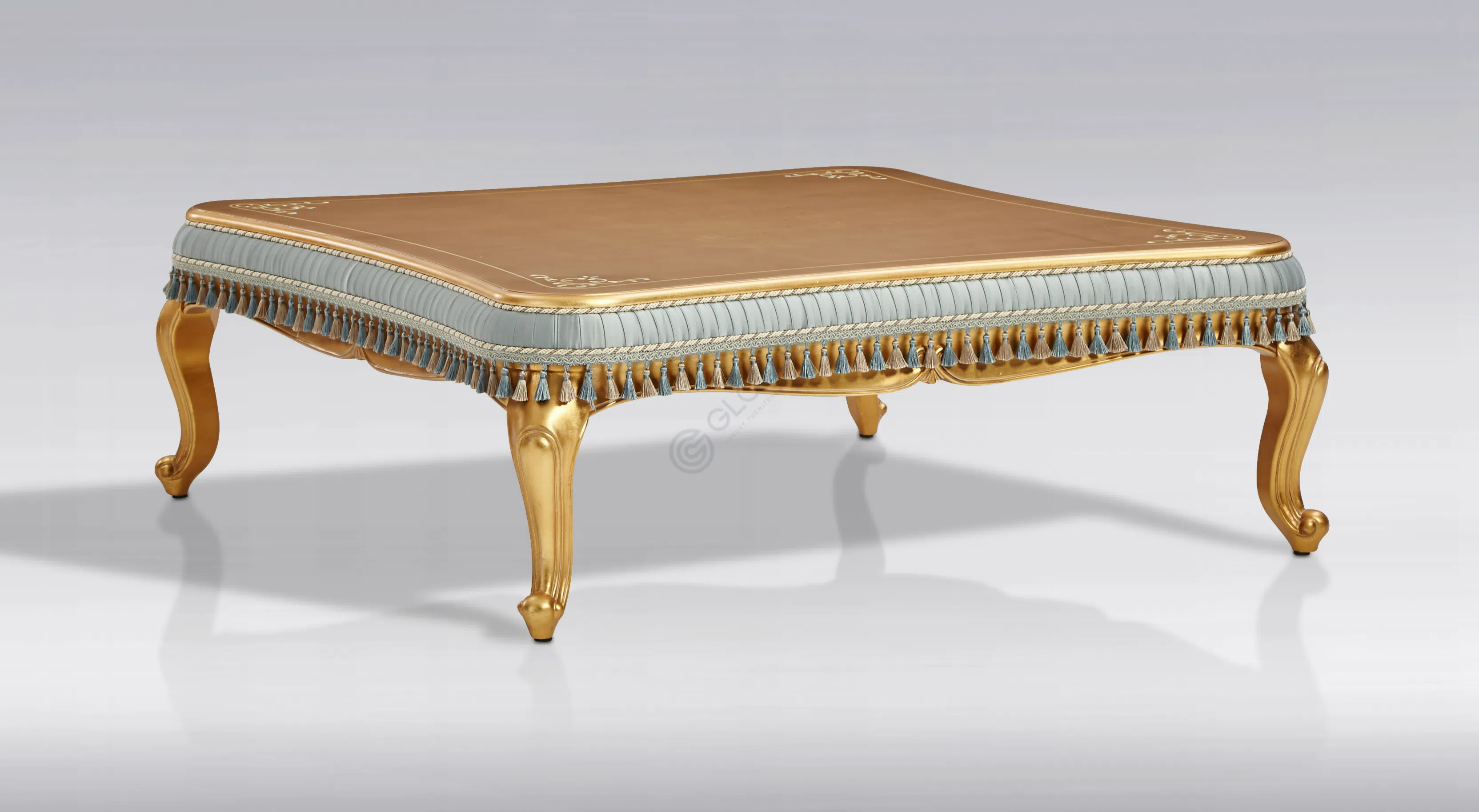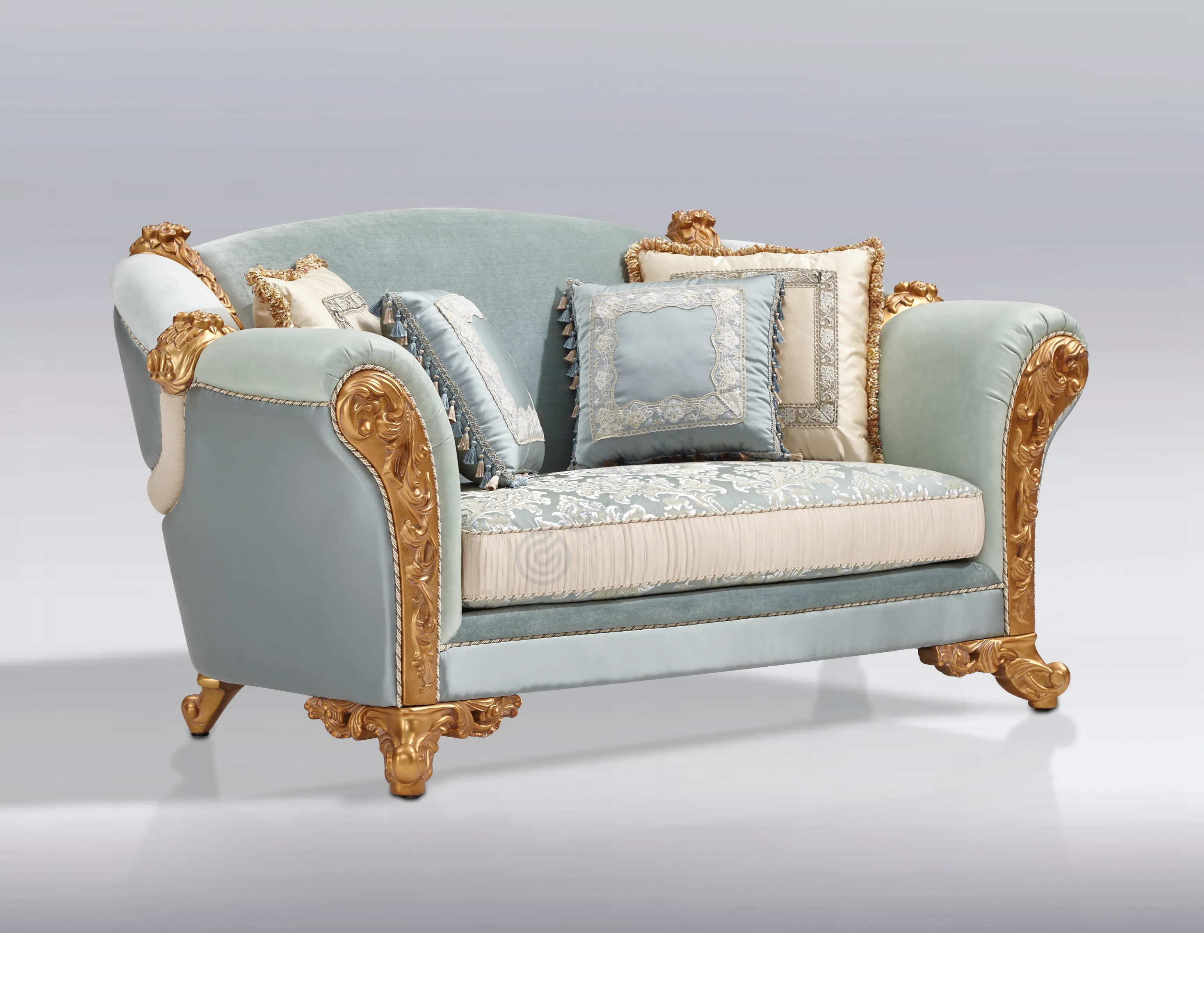 Основа стула выполнена из массива натурального дерева, что обеспечивает прочность и долговечность конструкции. Каркас дополнен обивкой из высококачественного текстиля, приятного на ощупь и визуально привлекательного. Особое внимание уделено отделке: элементы из дерева покрыты патиной, которая придает ножкам золотистый оттенок и эффект легкой старины, подчеркивая классический стиль.