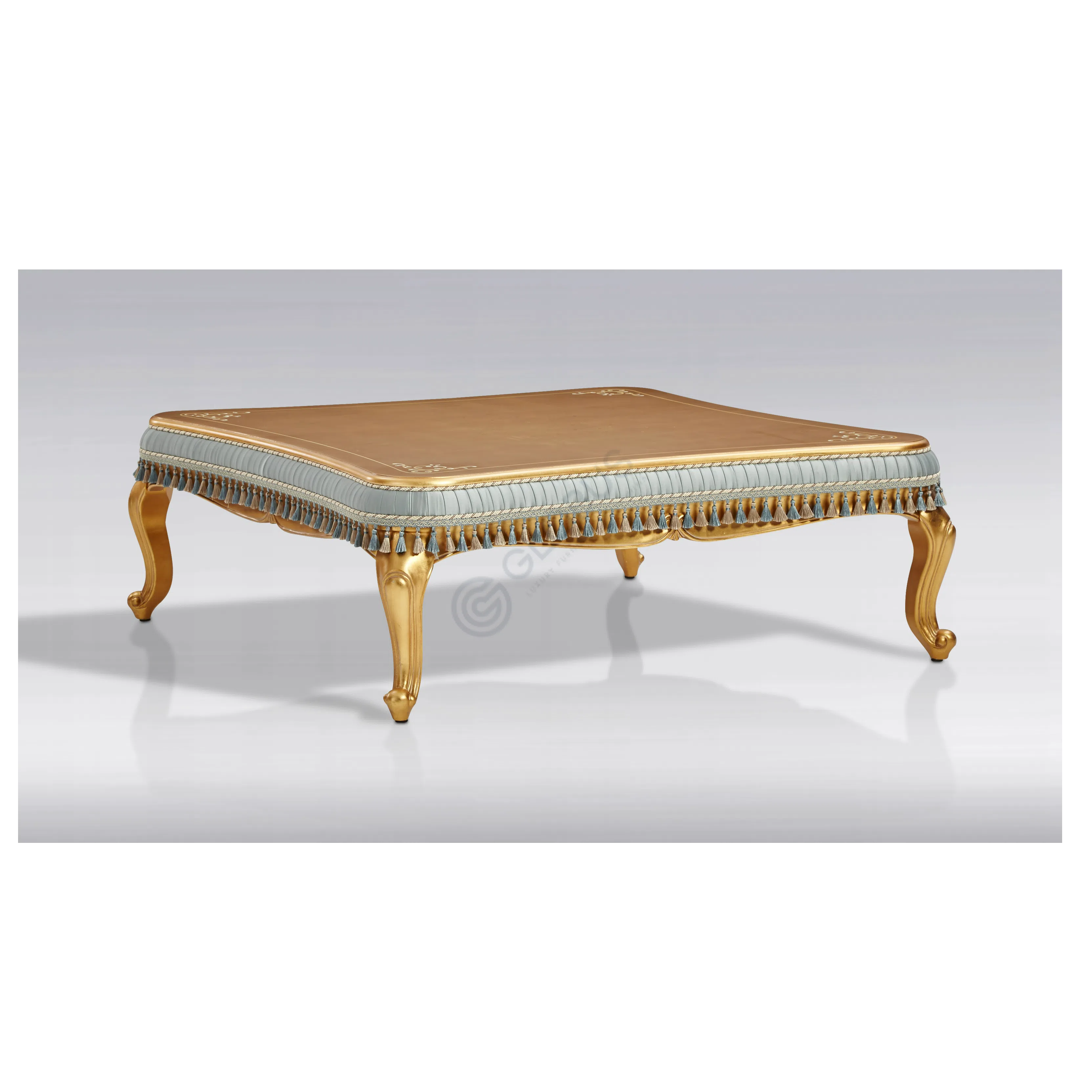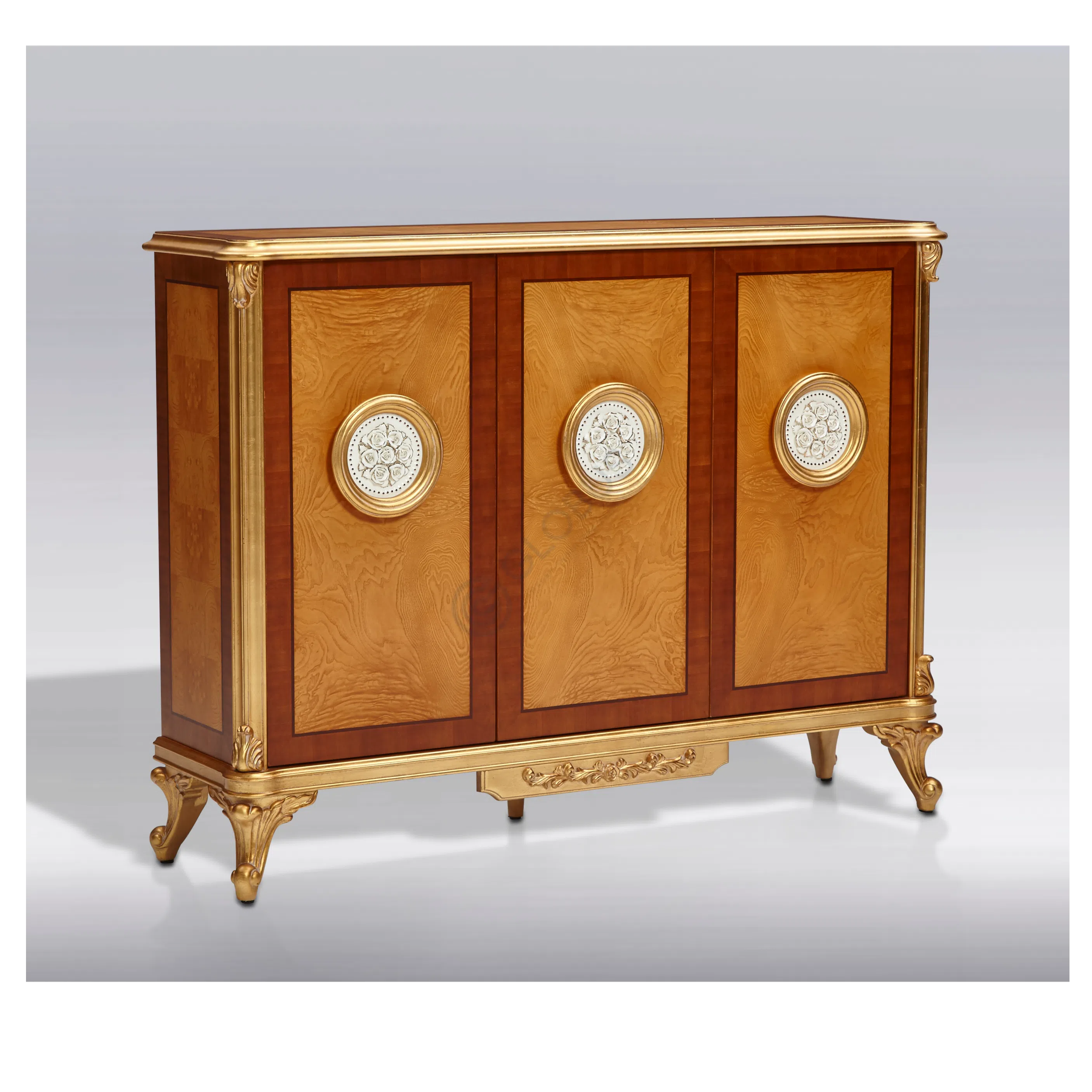 Основу изделия составляет прочный каркас из натурального дерева, фанеры и шпона, что гарантирует его долговечность. Искусно нанесенная патина придает поверхности золотистый оттенок и эффект легкой старины, подчеркивая классический характер.