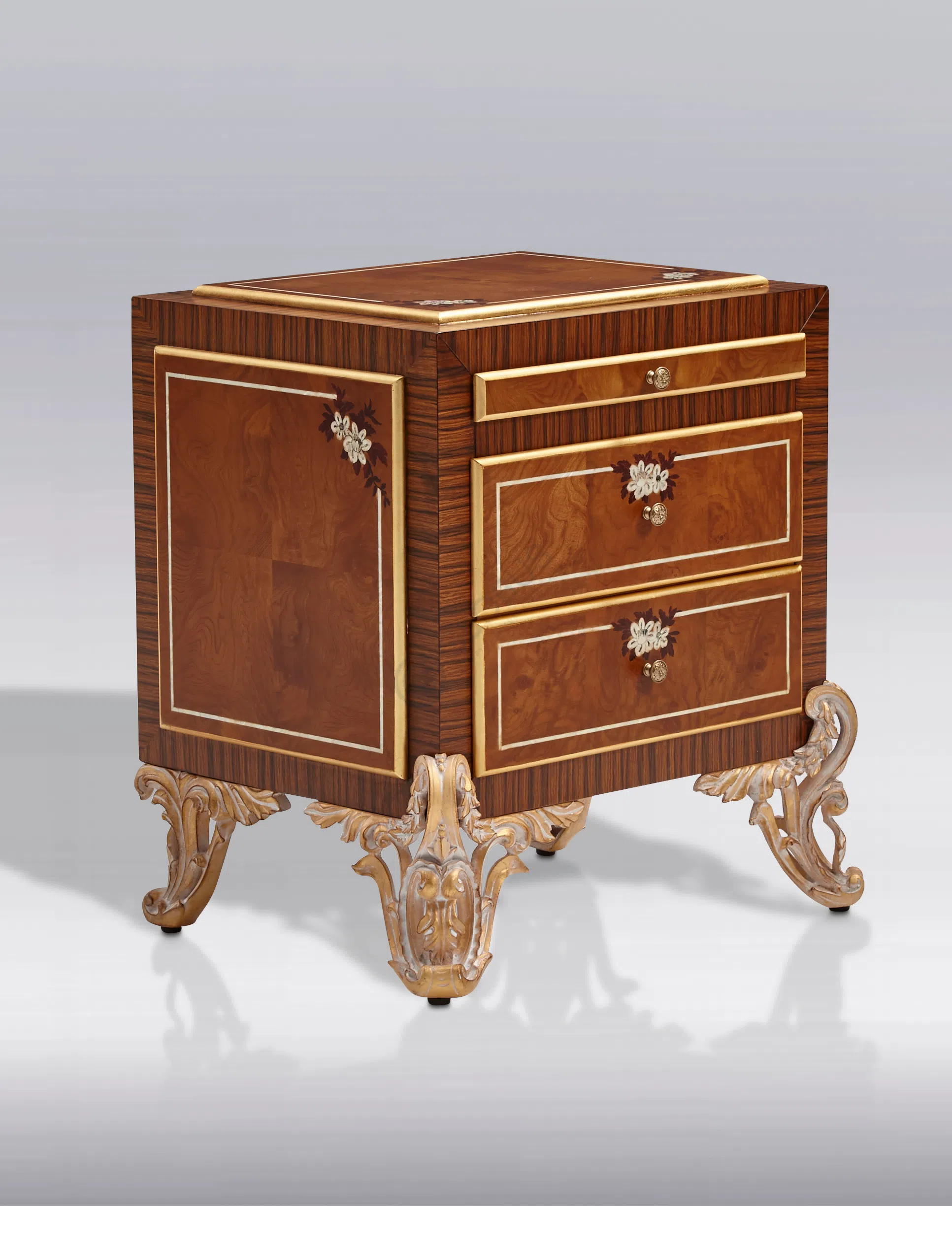 Корпус этого предмета мебели выполнен из прочных и качественных материалов, таких как натуральное дерево и фанера, обеспечивая долговечность и надежность конструкции. Фасады ящиков и боковые панели облицованы великолепным шпоном, чей рисунок обладает выразительной текстурой и глубоким оттенком. Тонкие декоративные линии светлого оттенка подчеркивают контуры ящиков, добавляя визуальной легкости.