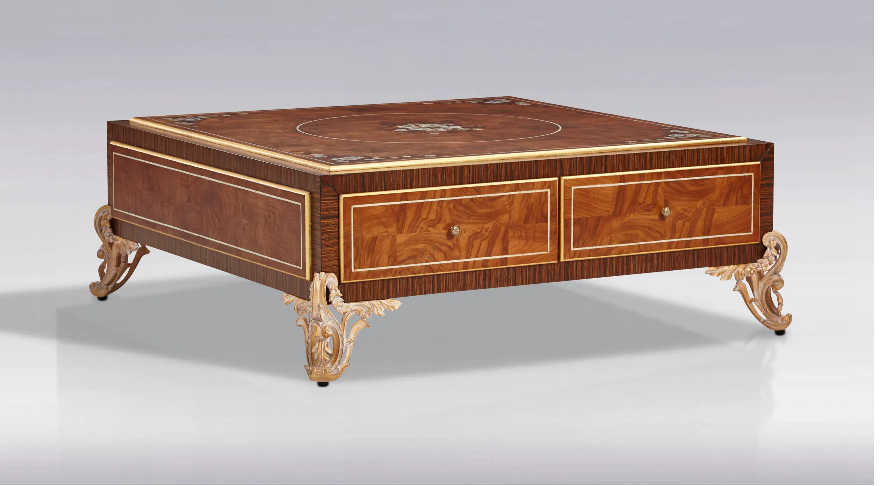 Завершающие штрихи в виде патины на резных ножках придают комоду благородный состаренный вид, словно передавая историю и наследие. Каждая деталь, от изящных ручек на ящиках до фигурных опор, тщательно проработана, свидетельствуя о высоком мастерстве исполнения.
