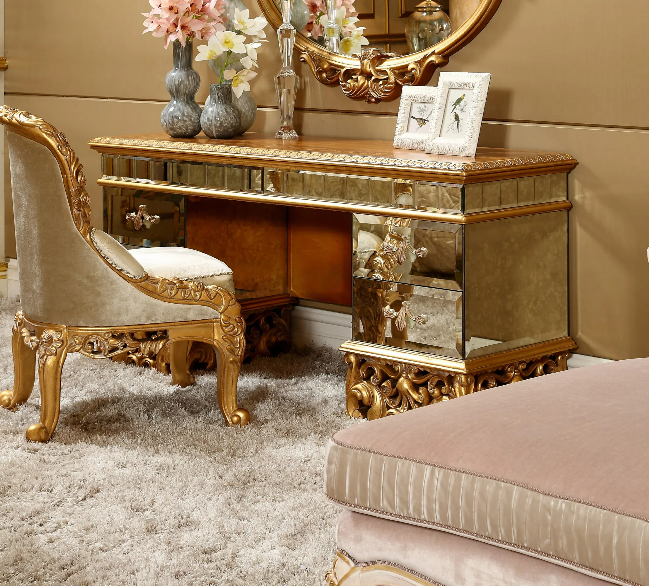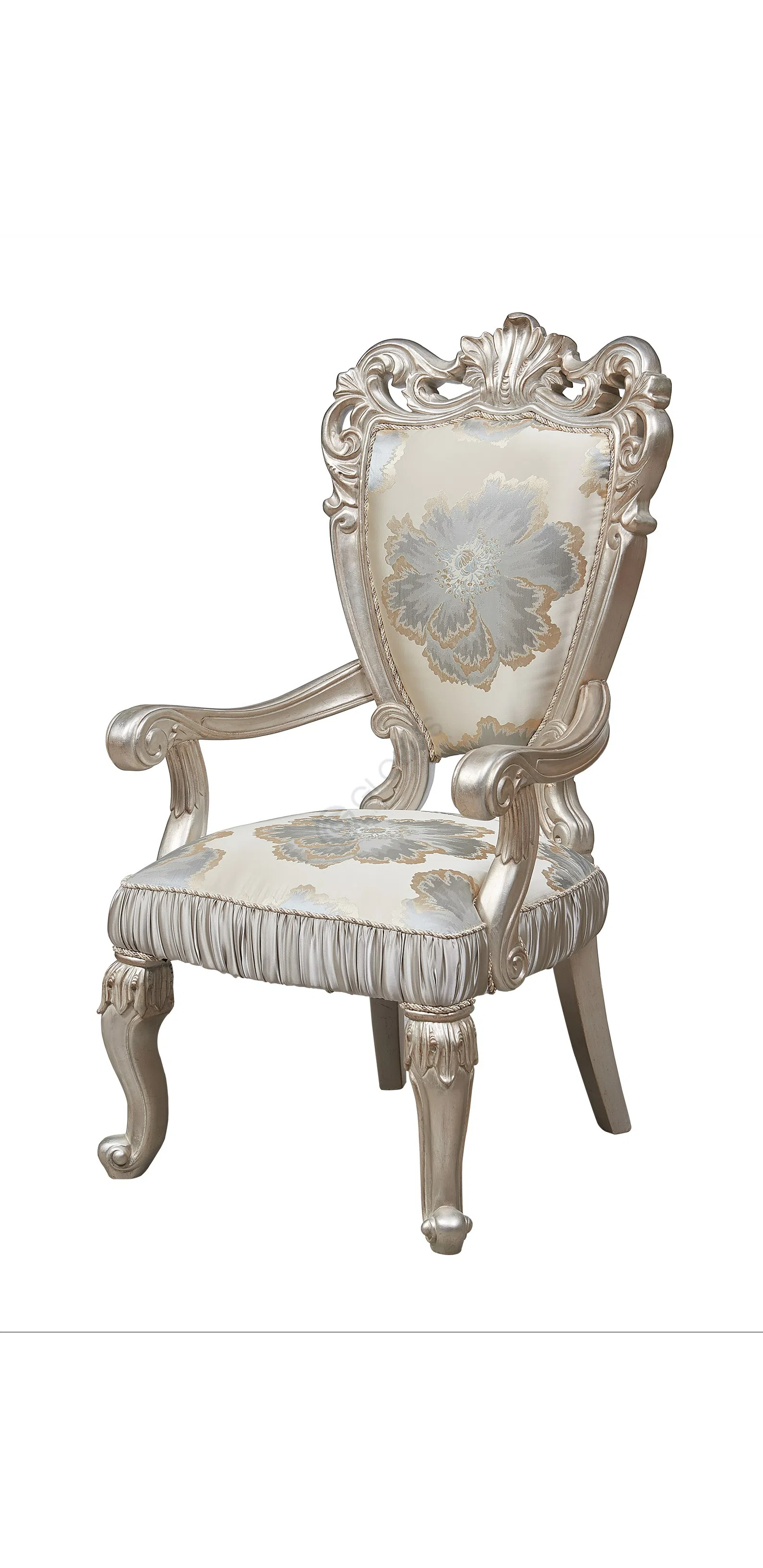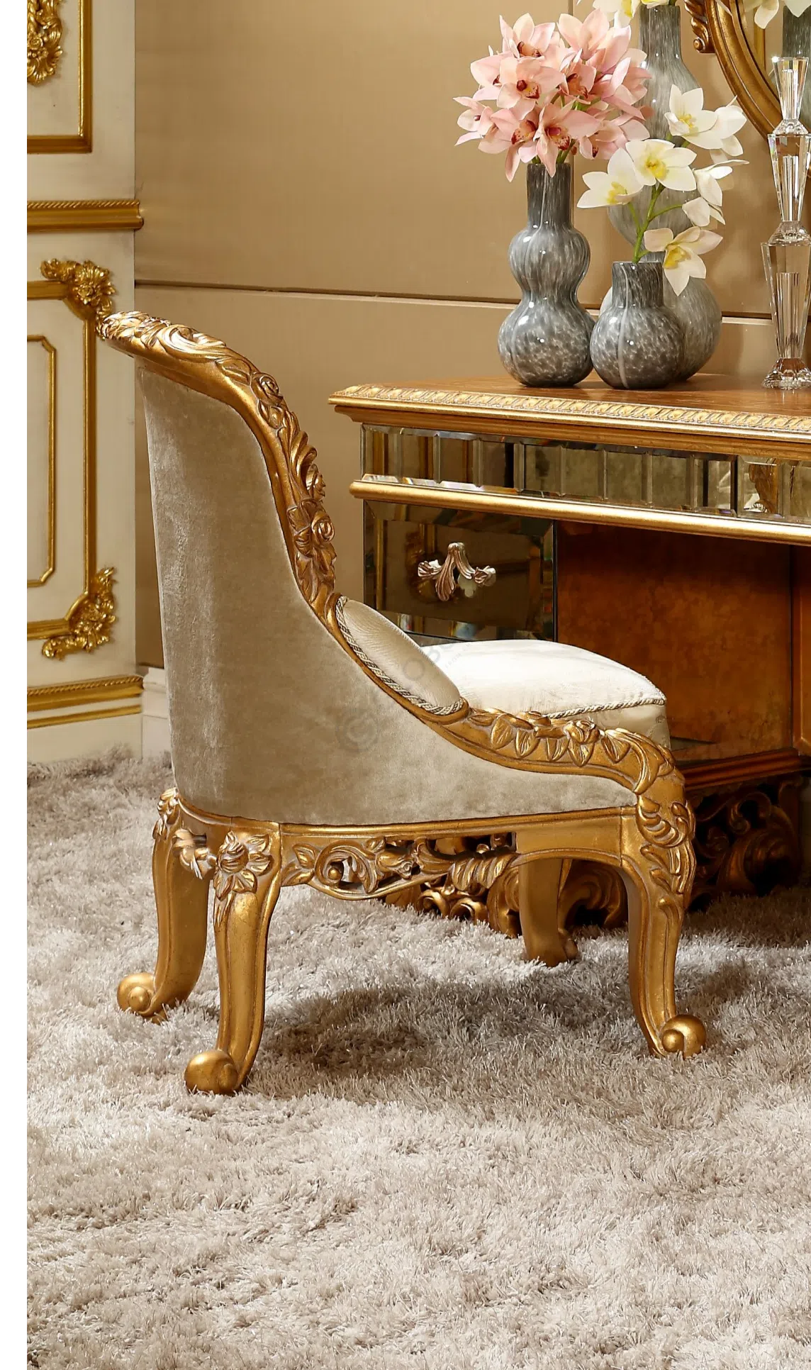 Представленная банкетка является воплощением утонченного вкуса и мастерства, созданного для интерьеров, где ценится подлинная красота и роскошь. Ее форма и декор отсылают к величественным эпохам европейской классики, внося в пространство нотки дворцового шарма и элегантности, характерные для стилей барокко и рококо.