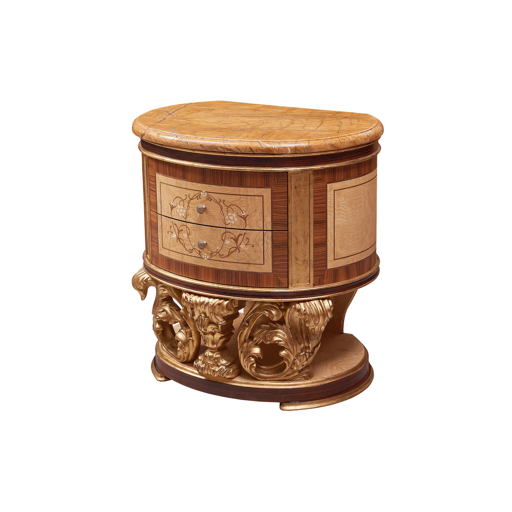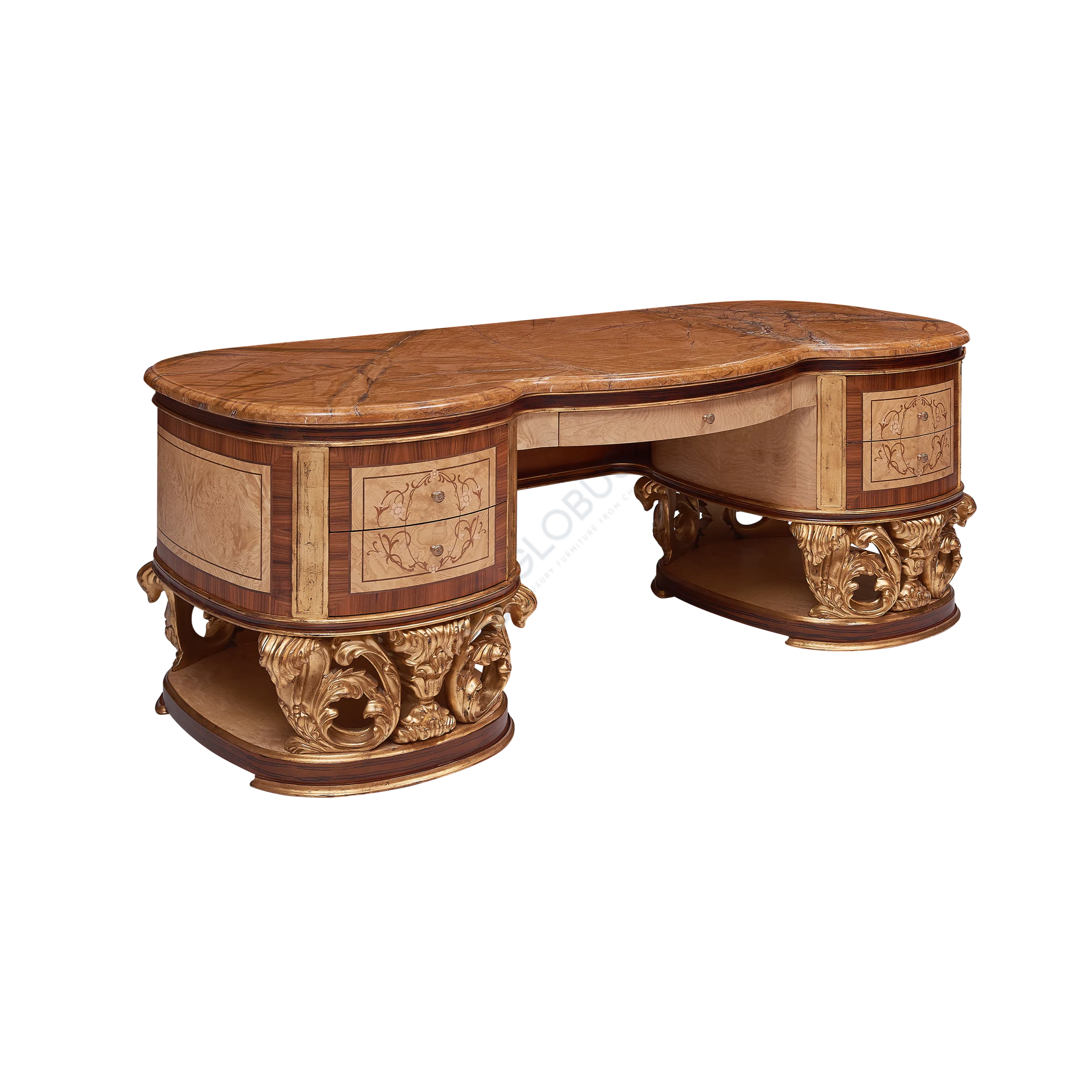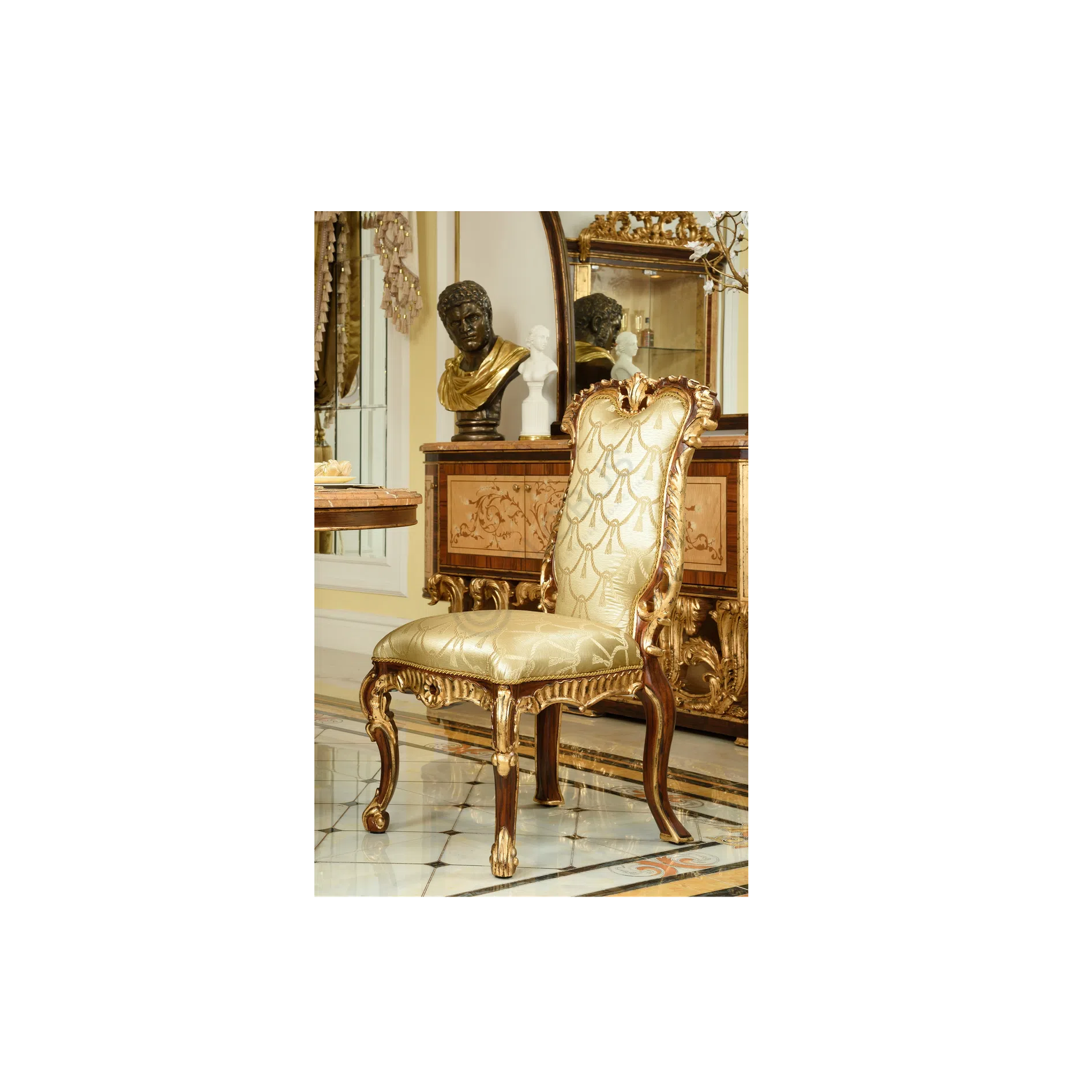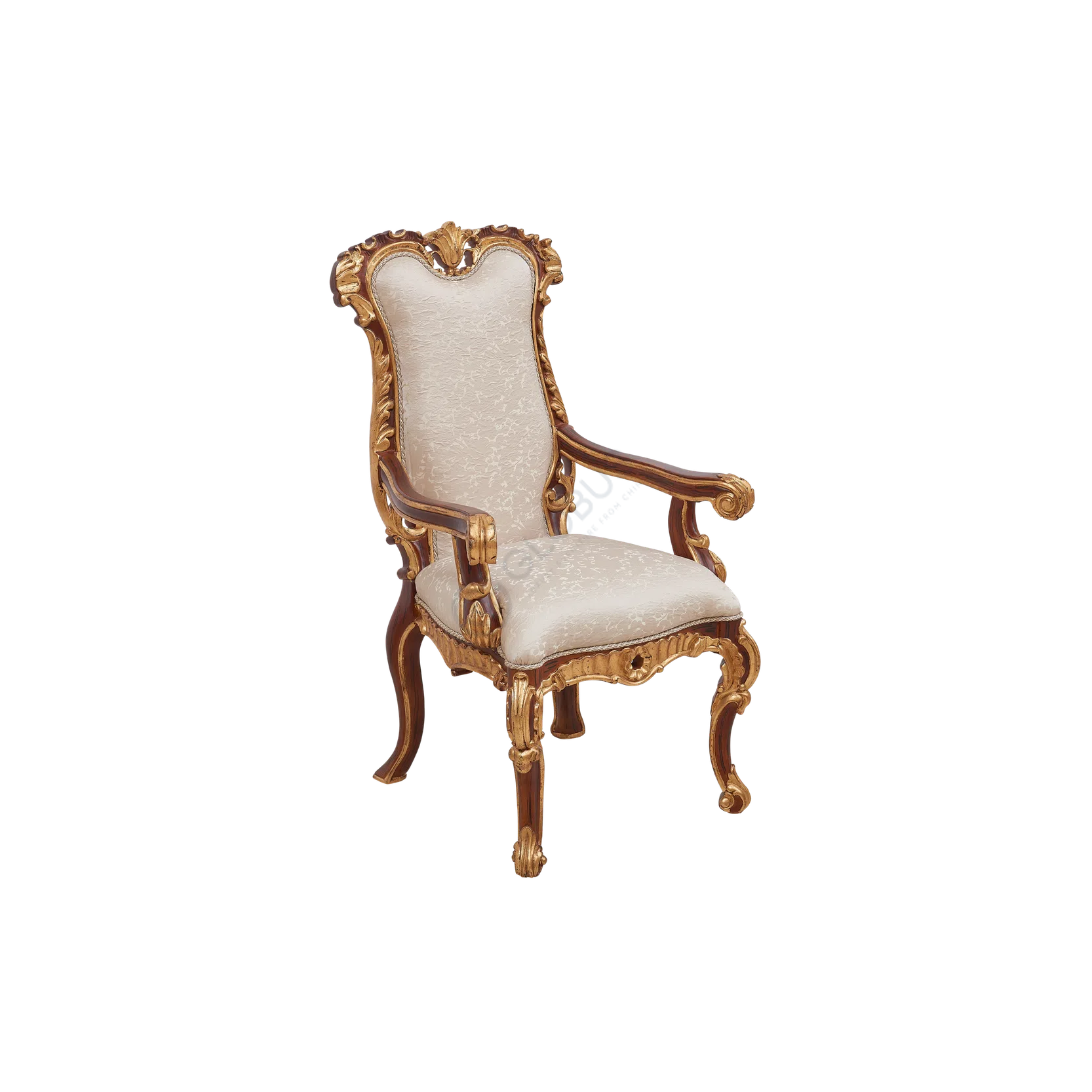 Его основа искусно выполнена из натурального дерева, украшенного витиеватой резьбой и покрытого благородной патиной, подчеркивающей глубину декора. Применение шпона в отделке добавляет поверхности особый шарм. Обивка из высококачественного текстиля обеспечивает мягкость и уют, в то время как скрытые элементы из фанеры и кожаные вставки в конструкции гарантируют прочность и долговечность.