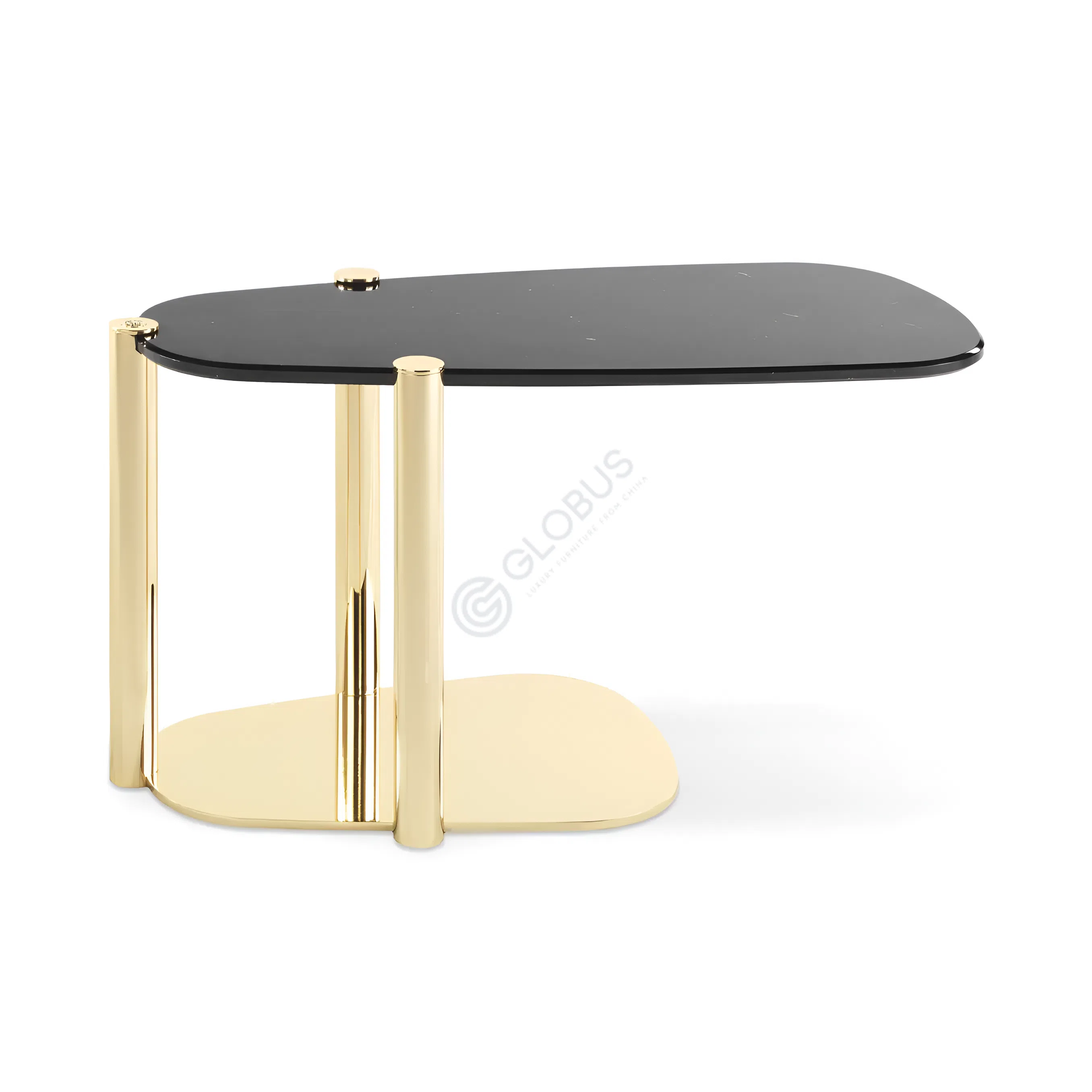 Верхняя поверхность представляет собой столешницу из натурального мрамора, где уникальный рисунок камня создает живописный переход от светлых к темным оттенкам. Основной корпус, обтянутый высококачественной экокожей на микрофибре, придает изделию приятную тактильность и визуальную мягкость, обеспечивая при этом долговечность и превосходный внешний вид.