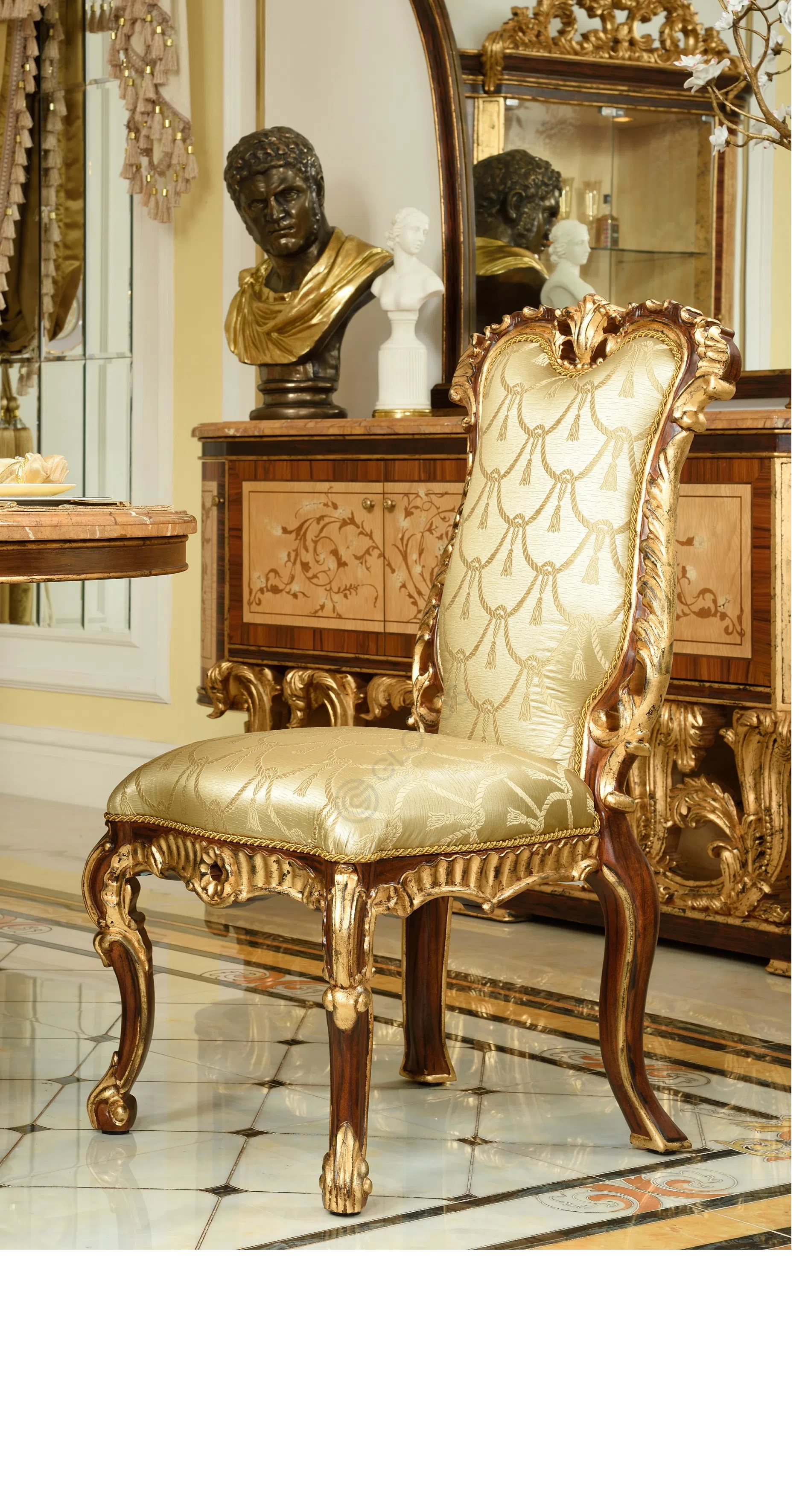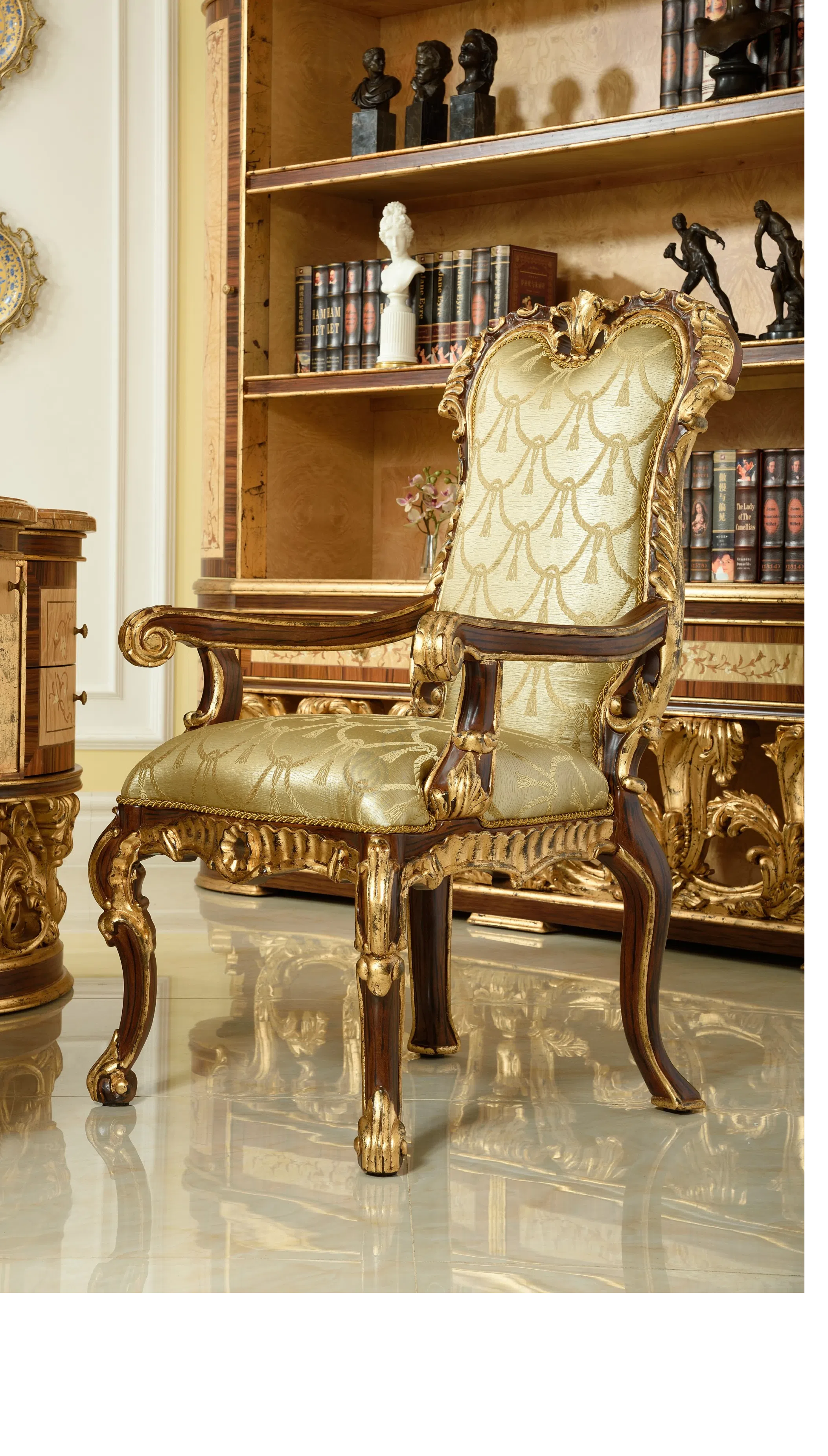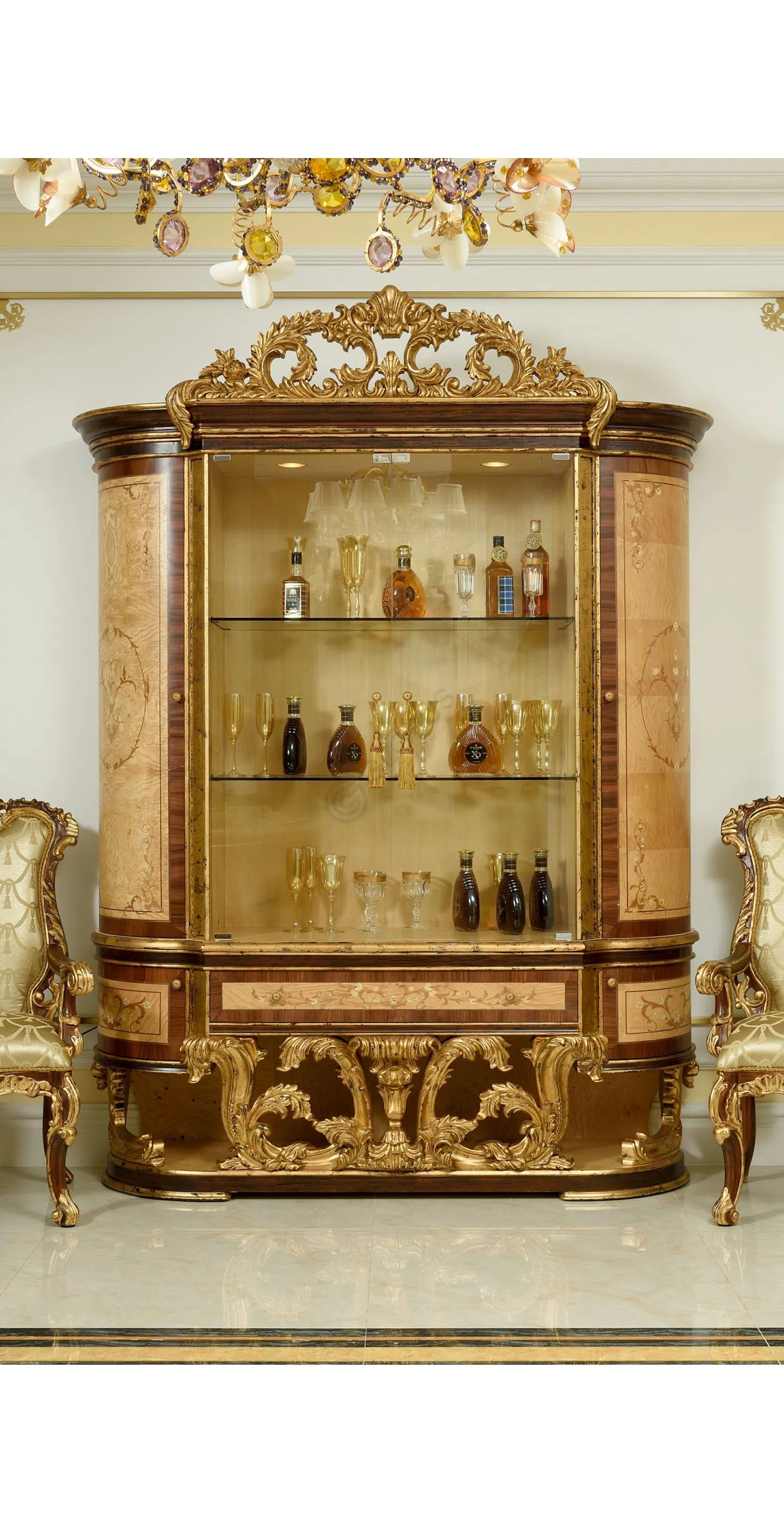 Этот книжный шкаф является воплощением изысканной классики и роскошного стиля барокко или рококо. Он создан не просто как функциональный предмет мебели, но как ключевой акцент, способный преобразить пространство и придать ему неповторимый шарм.