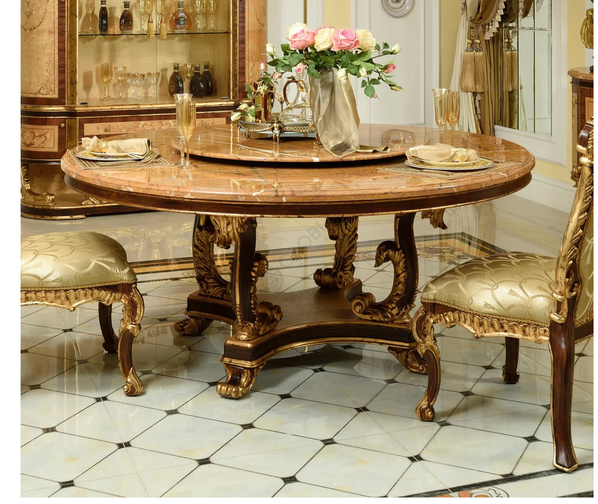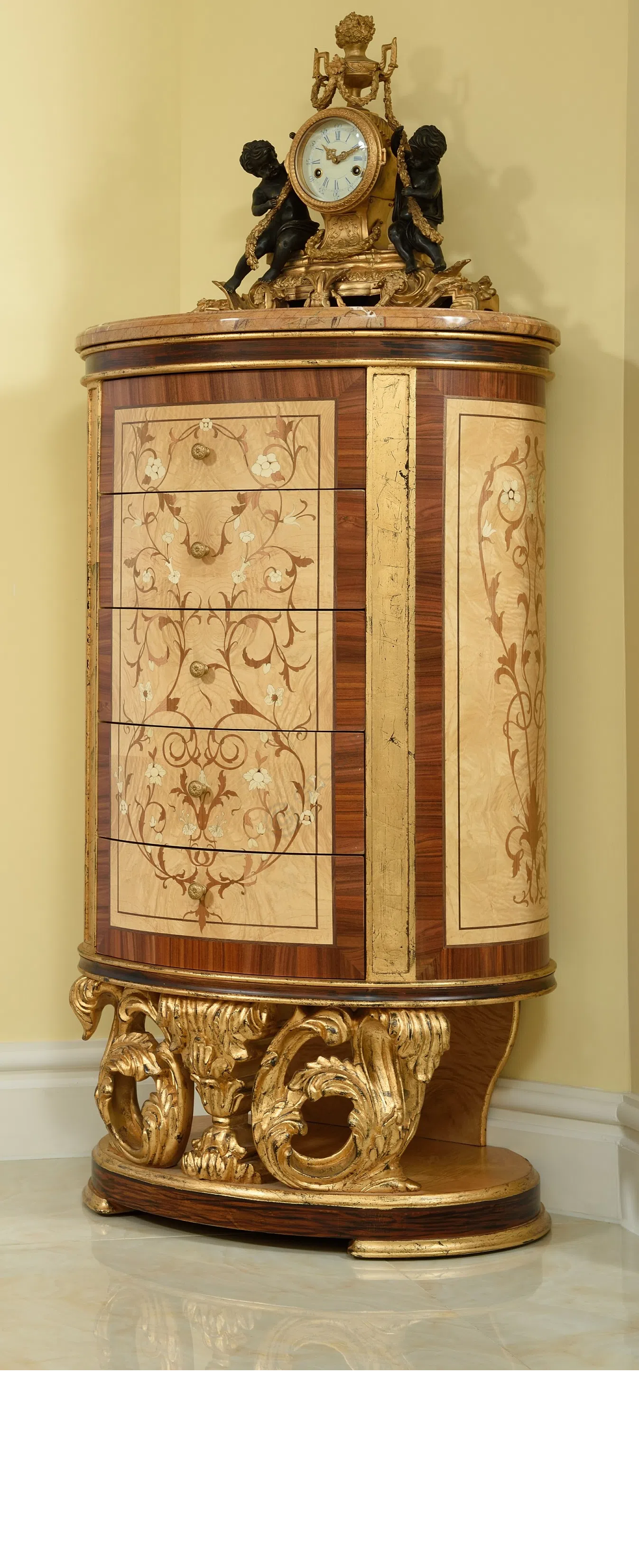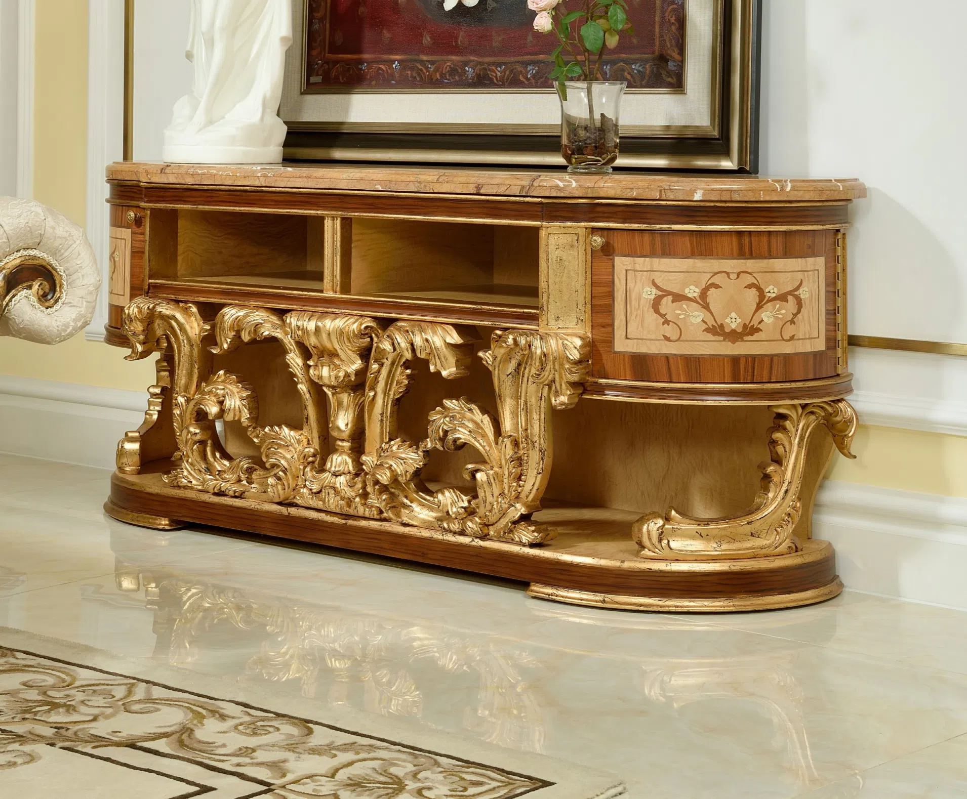 Этот книжный шкаф является воплощением изысканной классики и роскошного стиля барокко или рококо. Он создан не просто как функциональный предмет мебели, но как ключевой акцент, способный преобразить пространство и придать ему неповторимый шарм.