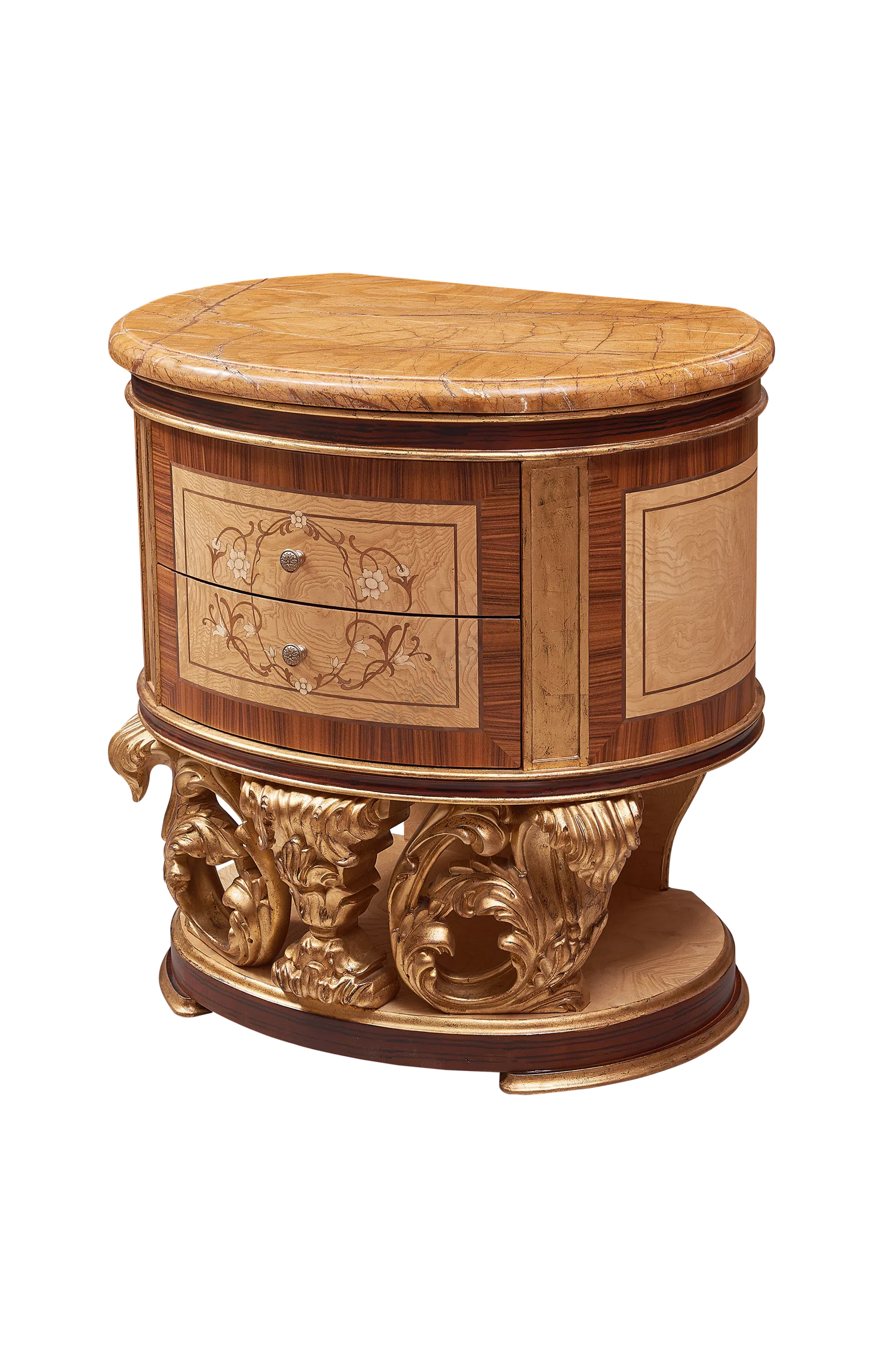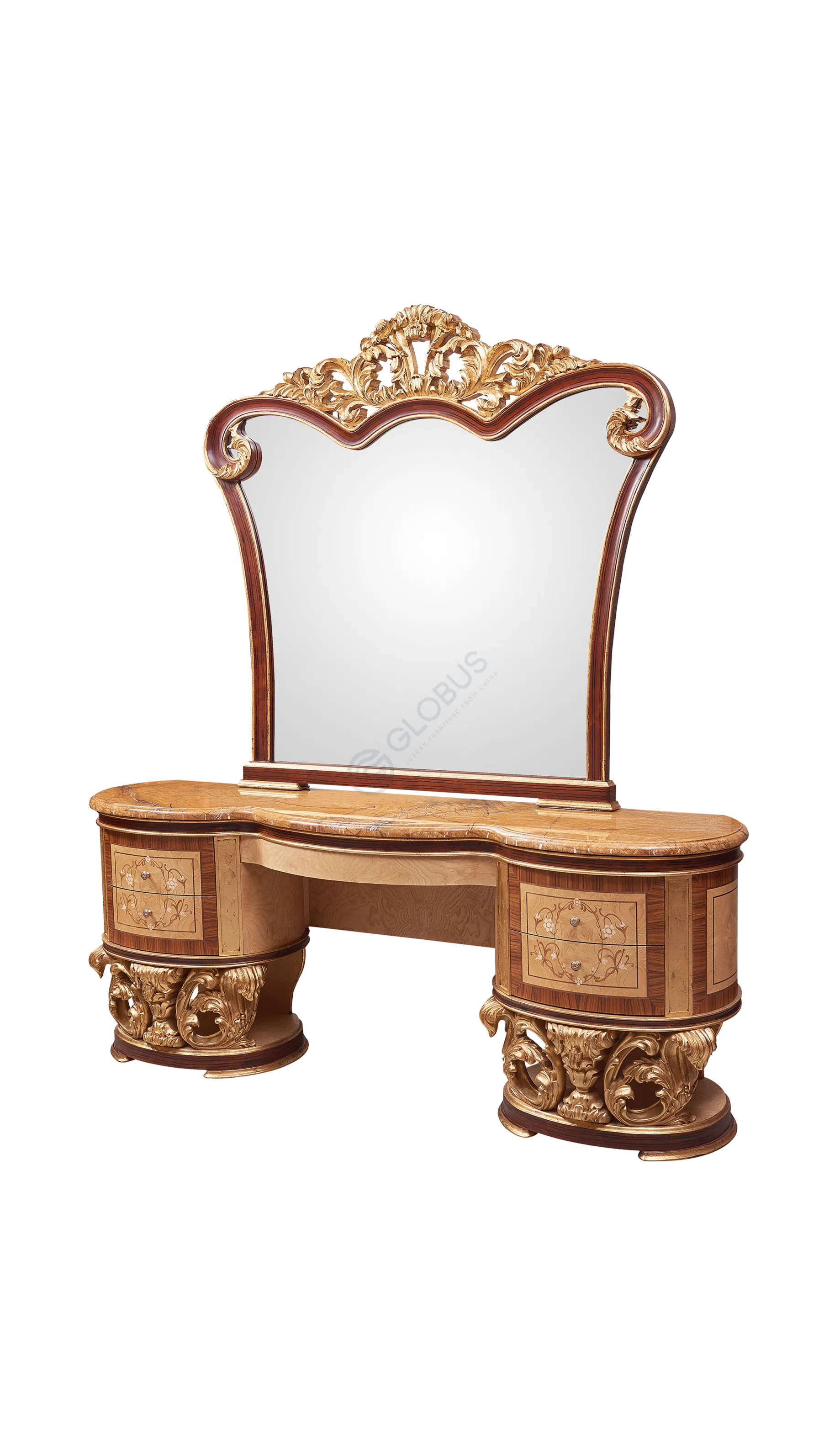 Изделие выполнено из натурального дерева, его основа дополняется шпоном и прочной фанерой, что обеспечивает надежность и долговечность конструкции. Особое внимание уделено декоративной отделке, включая изящную патину, которая придает поверхности глубину, благородство и эффект легкой старины, подчеркивая великолепие ручной работы.