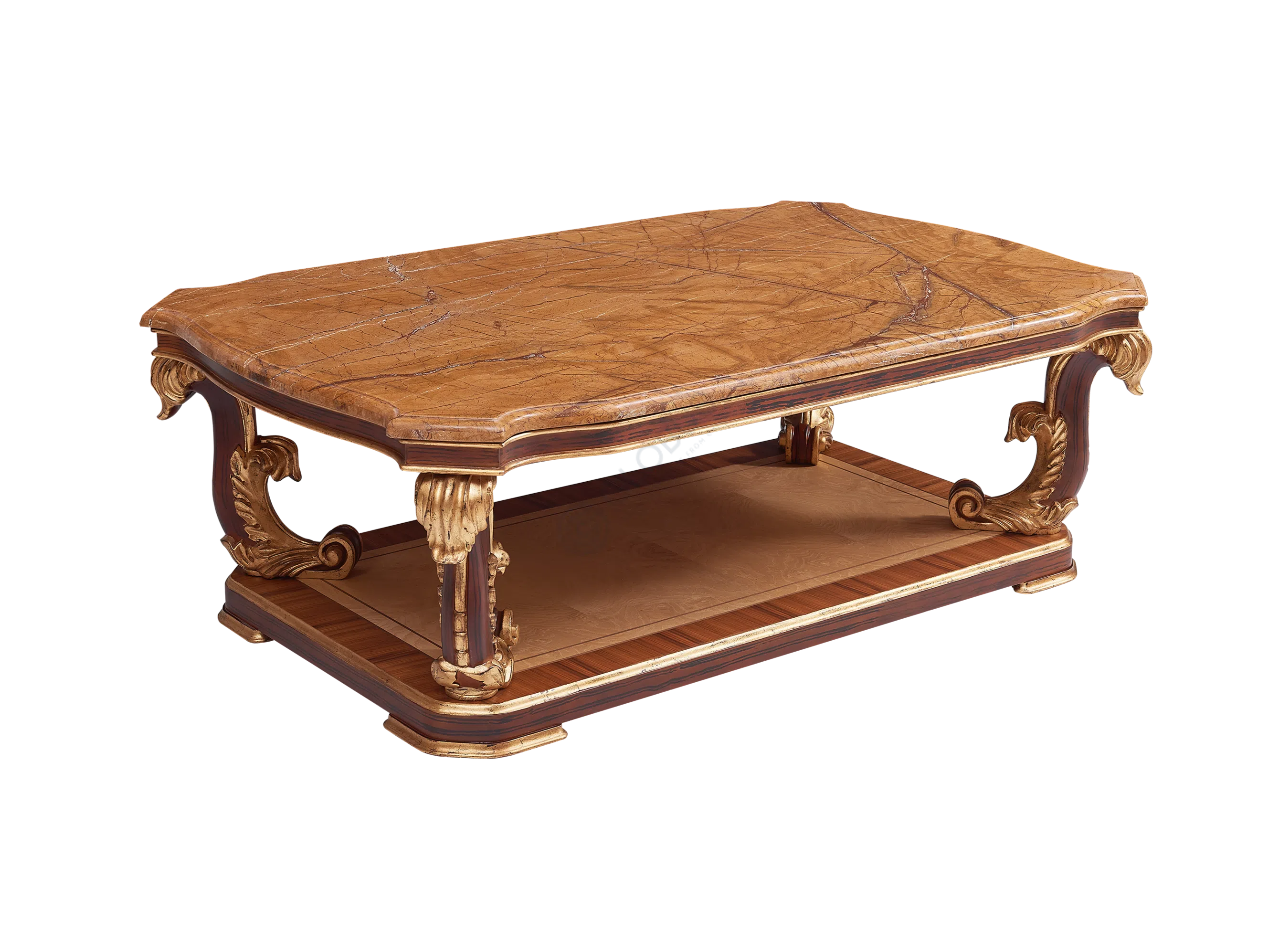 Характерной особенностью дизайна является обилие витиеватой резьбы, украшающей верхний карниз, массивное основание и другие элементы фасада. Открытые полки предоставляют идеальное место для демонстрации коллекции книг, антиквариата или декоративных предметов. Изогнутые линии и фигурные детали создают ощущение легкости и изящества, свойственное выбранному стилю.