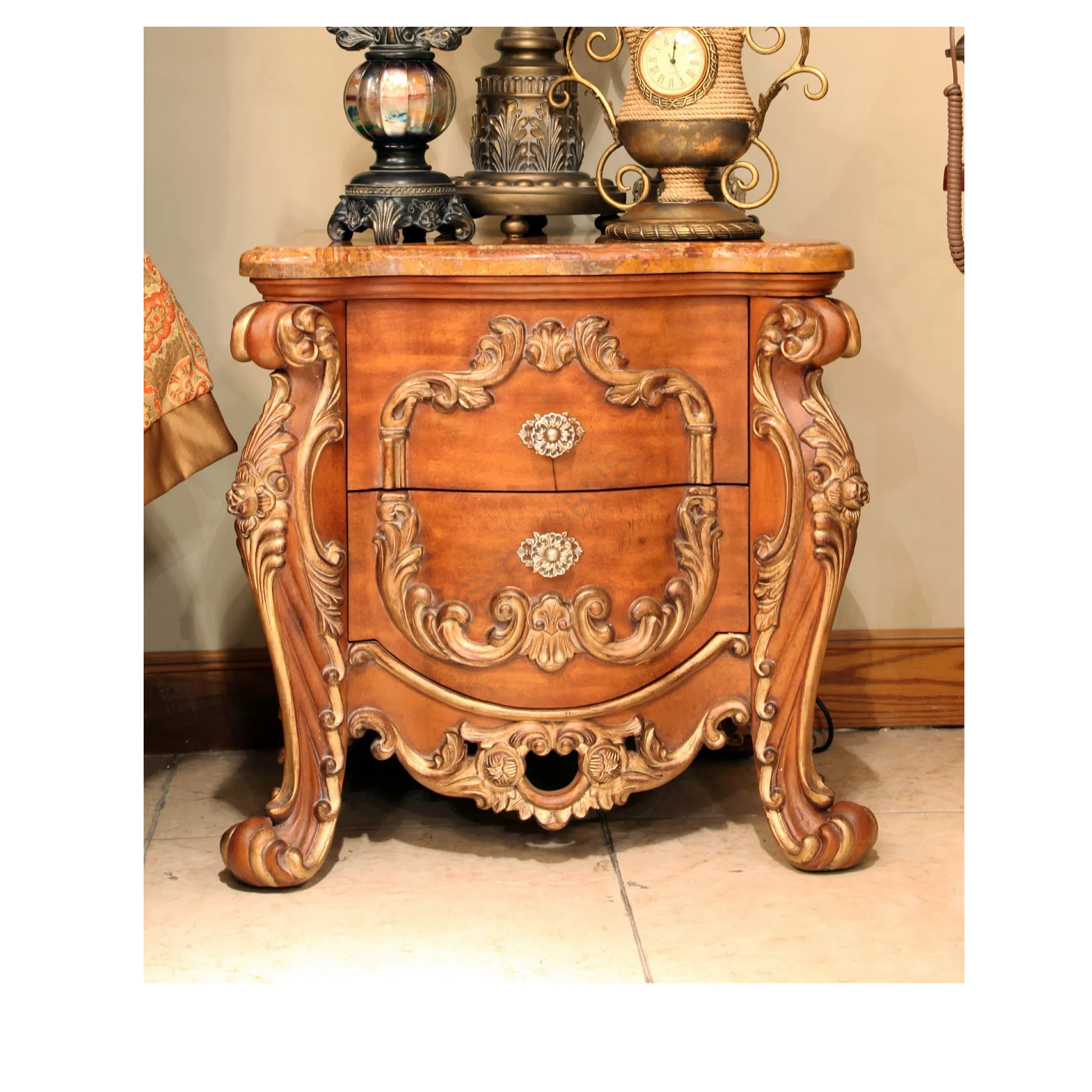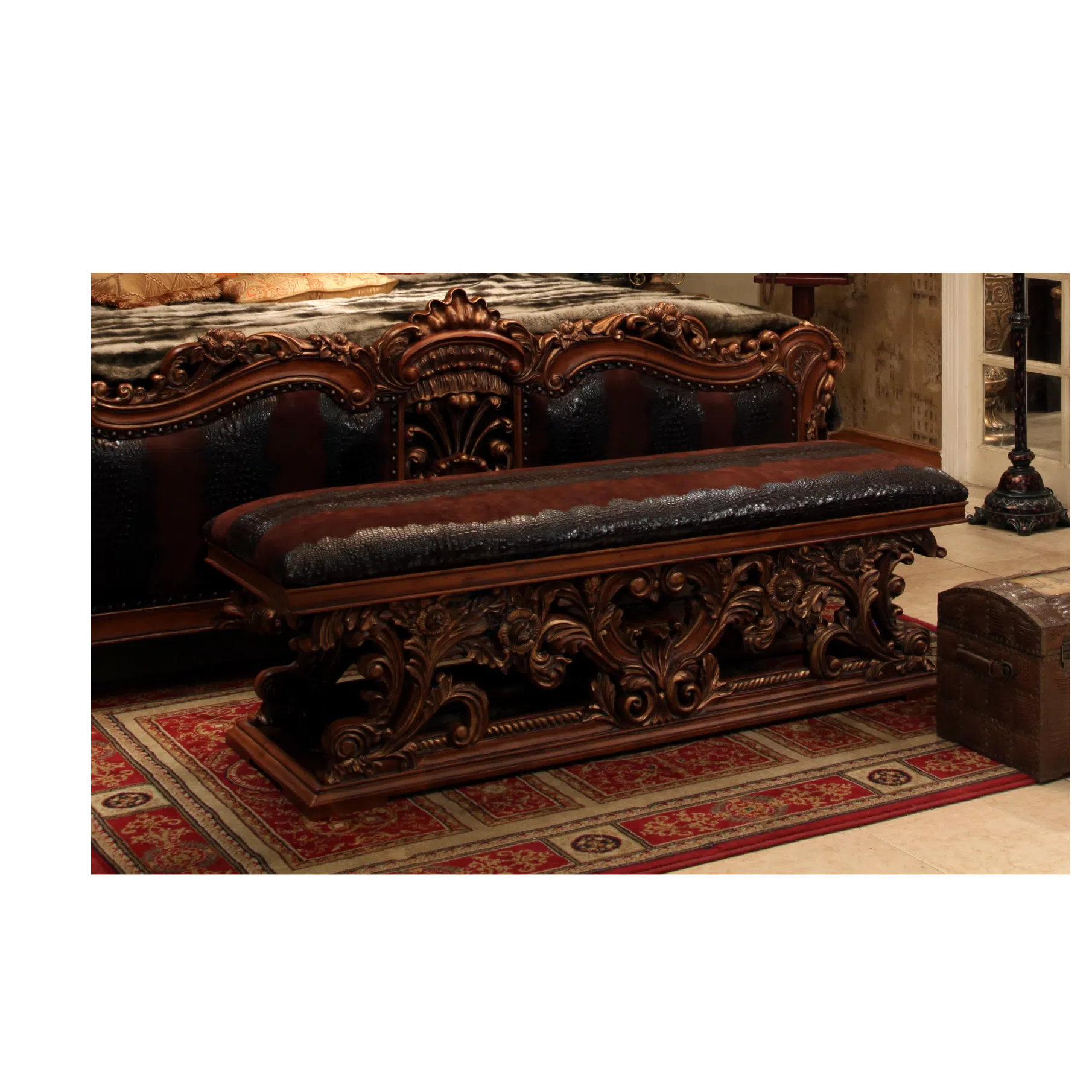 Каркас выполнен из массива натурального дерева, украшенного искусной резьбой. Сложные узоры и фигурные элементы свидетельствуют о высоком мастерстве исполнения, придавая каждому изгибу особую выразительность. Прочная основа из фанеры обеспечивает надежность конструкции.