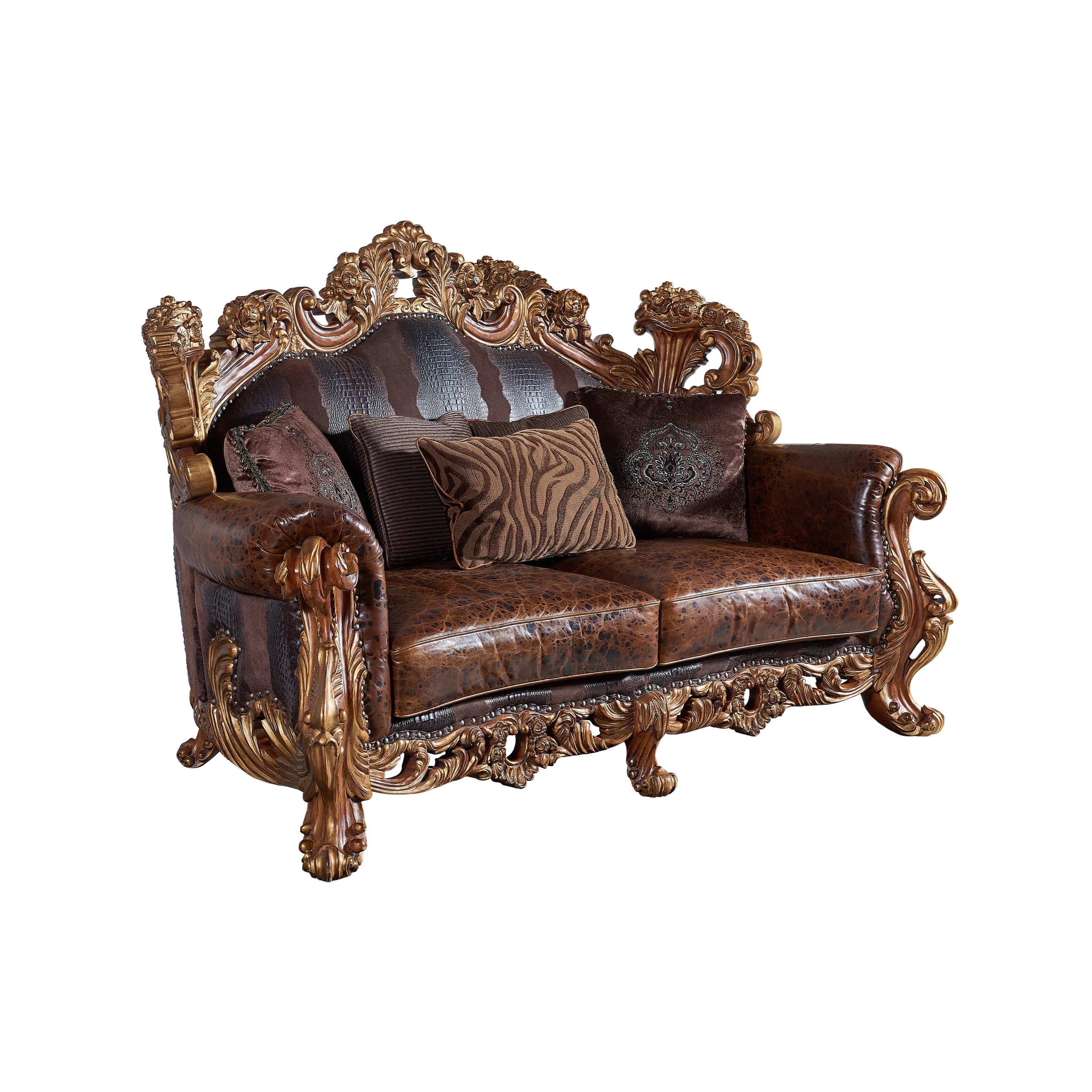 Обивка представляет собой роскошное сочетание различных видов кожи. Сиденье и подлокотники отделаны материалом с винтажной фактурой, приятной на ощупь, в то время как спинка украшена кожей с эффектным тиснением, напоминающим экзотическую рептилию. Декоративная подушка с анималистичным принтом добавляет смелый акцент.
